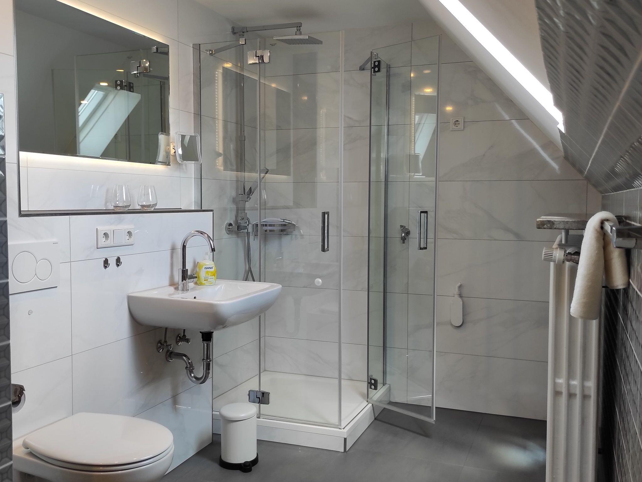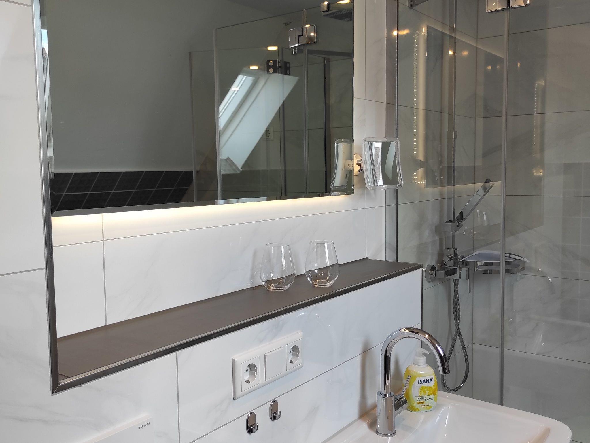 Das geräumige Badezimmer mit Toilette sowie mit Dusche, großem Spiegel und einem Fenster rundet das Gesamtbild ab.