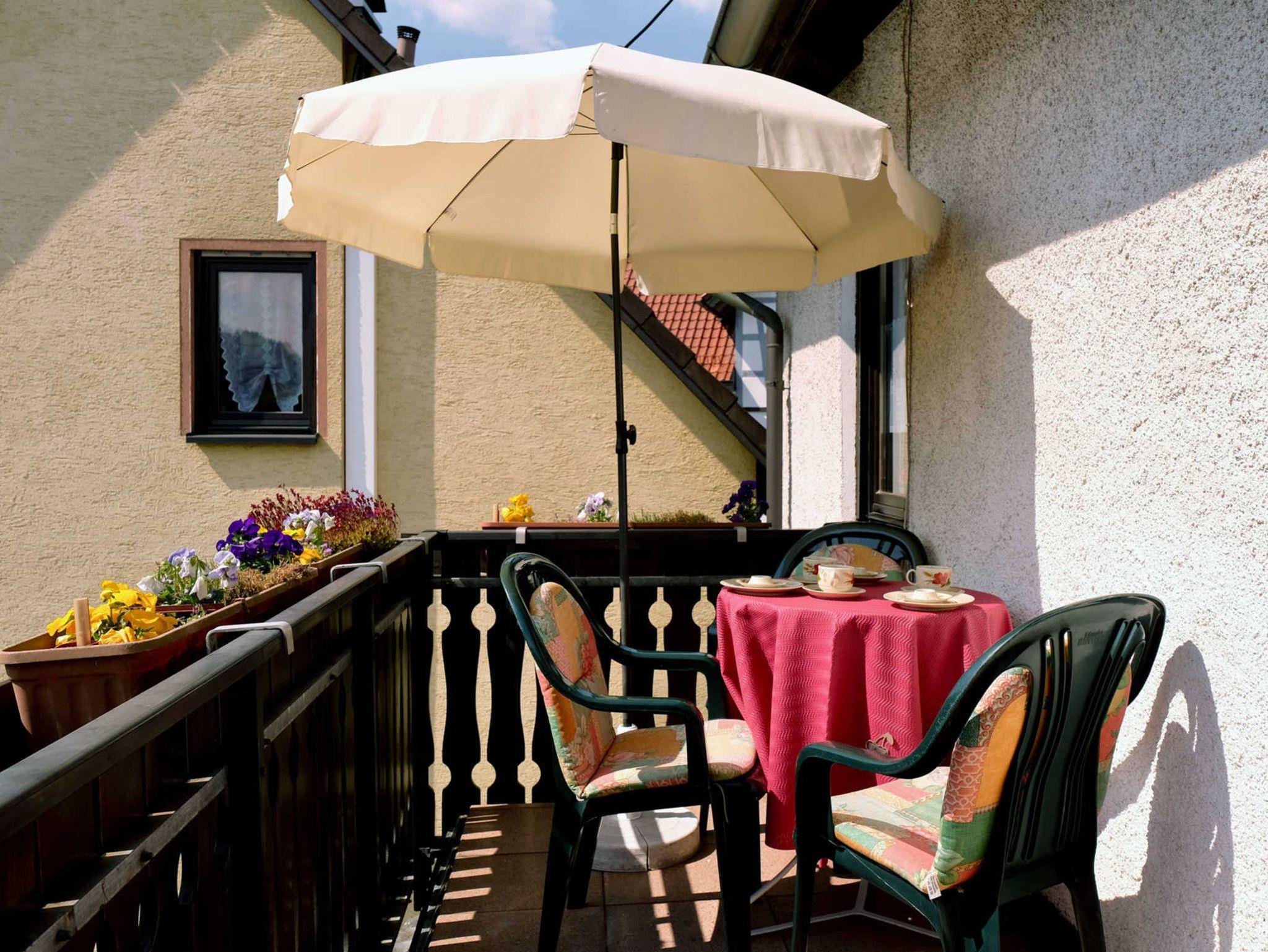 Die Küche mit Essecke ist komplett eingerichtet und bietet die Möglichkeit auf dem Balkon zu Essen oder ein Glas Frankenwein zu trinken.