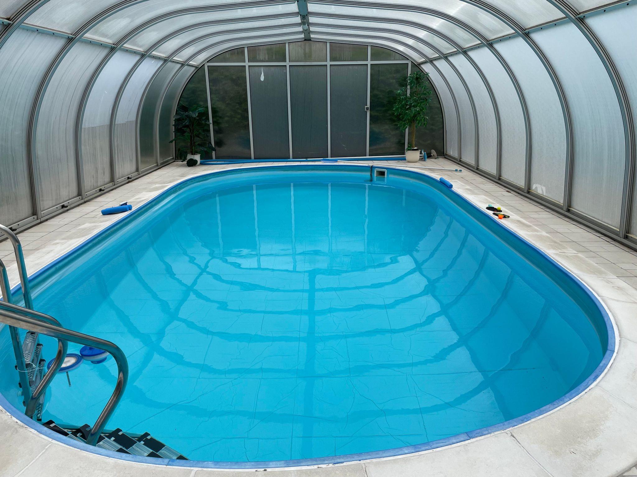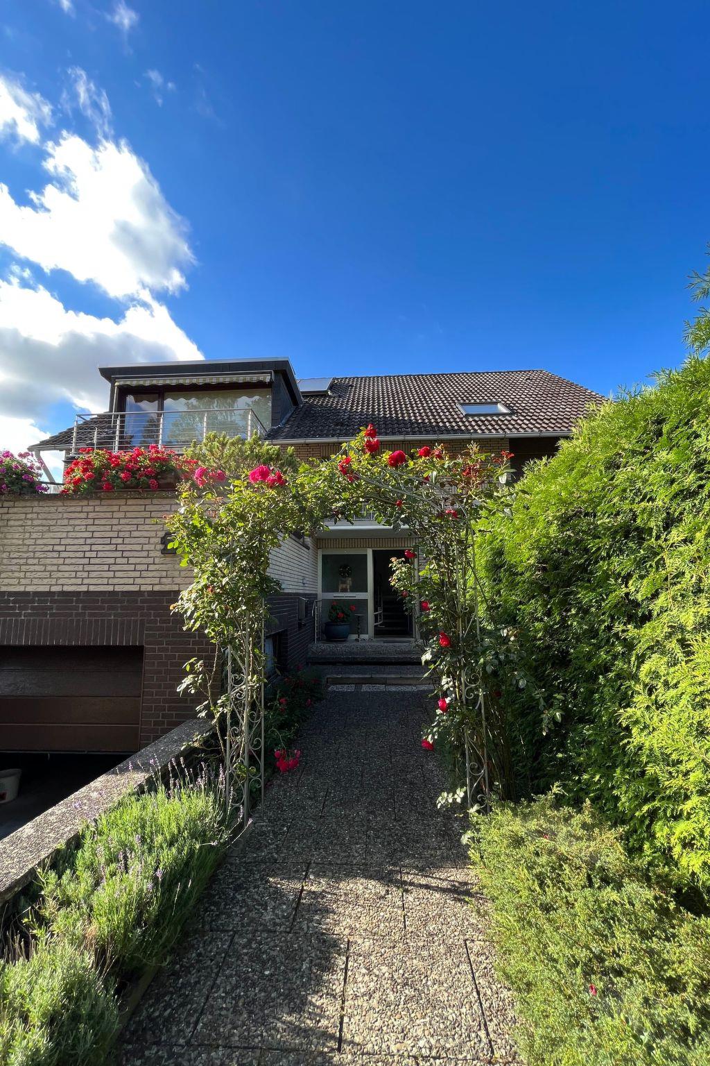 The house is located on a plot of approx. 1100 square metres with a garden that may be used, where the covered solar-heated pool and the covered barbecue and seating area are located. The pool can be used from the beginning of April to mid-September.