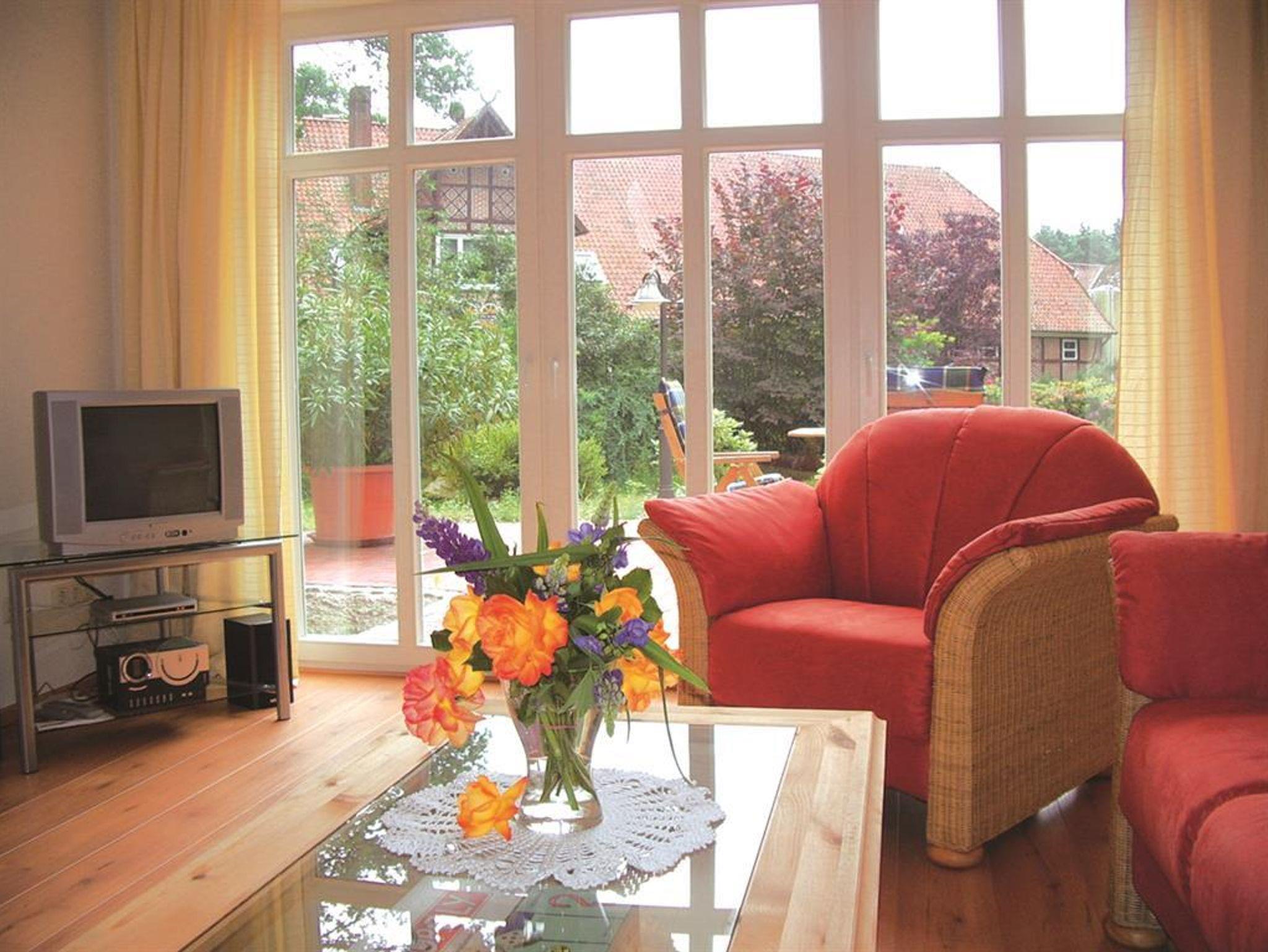 Unsere zwei gemütlichen und komfortablen neu gebauten Fachwerkferienhäuser befinden sich separat auf dem parkähnlichen Hofgelände unter alten Eichen.