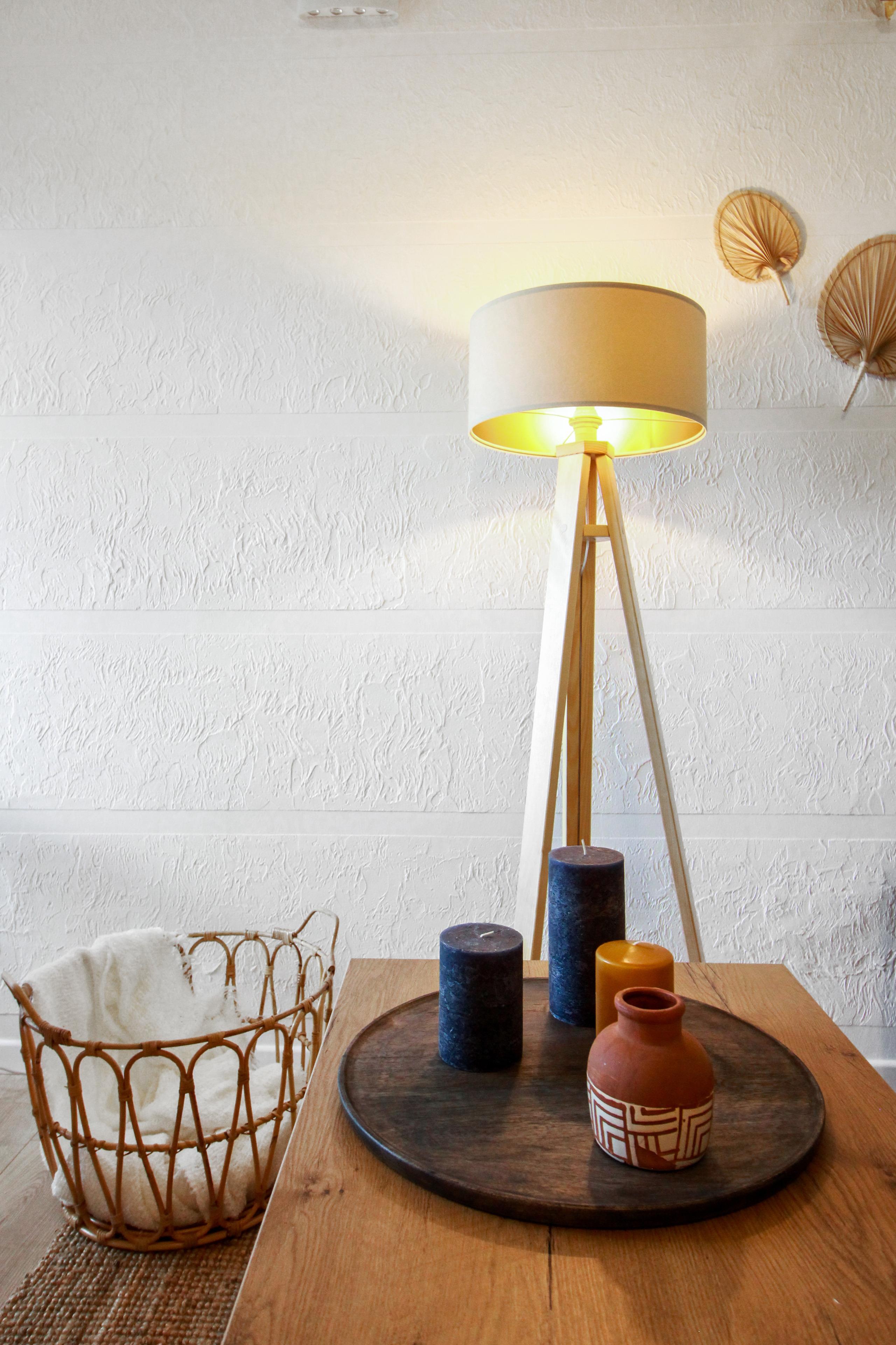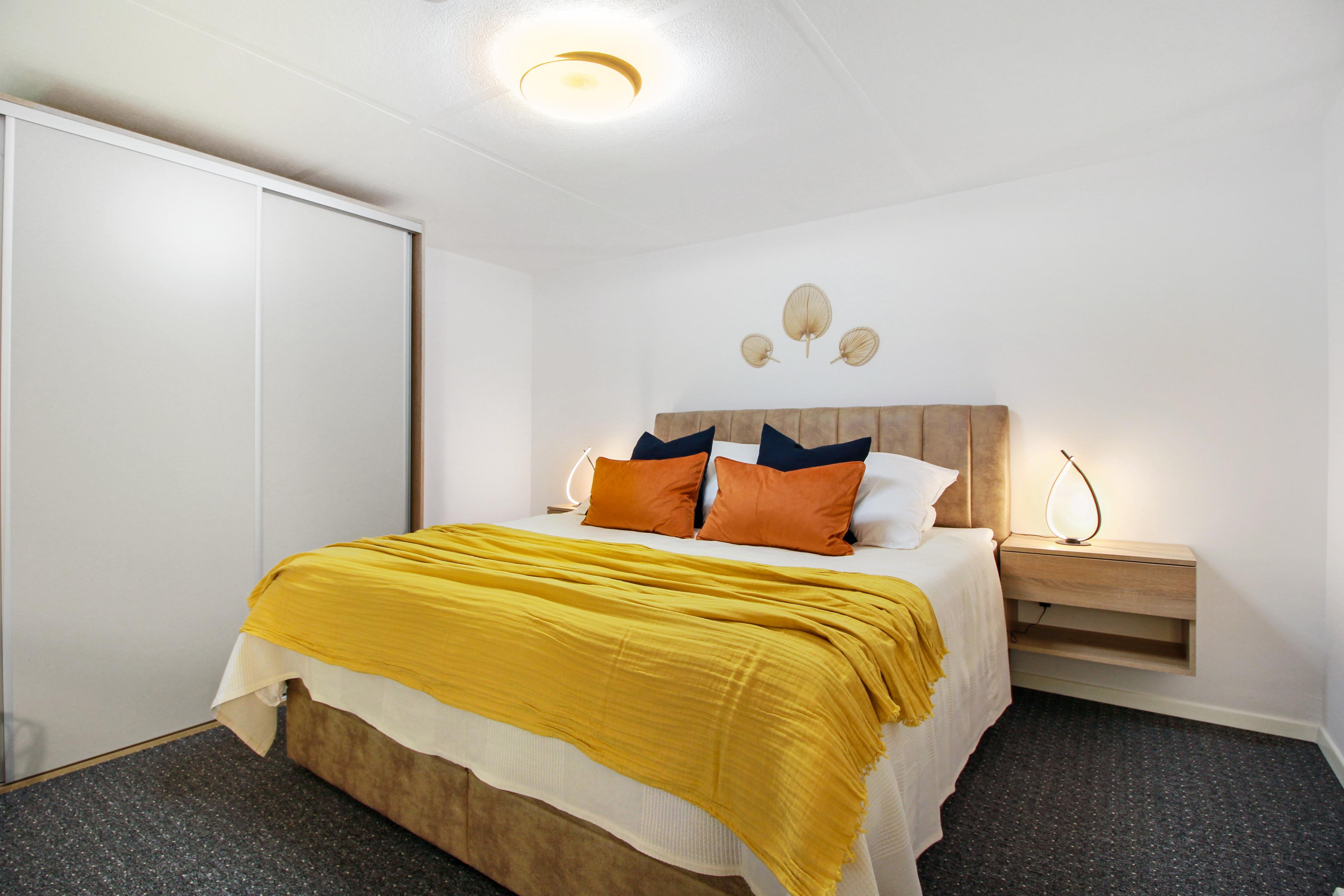 Haartrockner. Oben ein Schlafraum mit Doppelbett mit extra hoher Matratze und Topper für