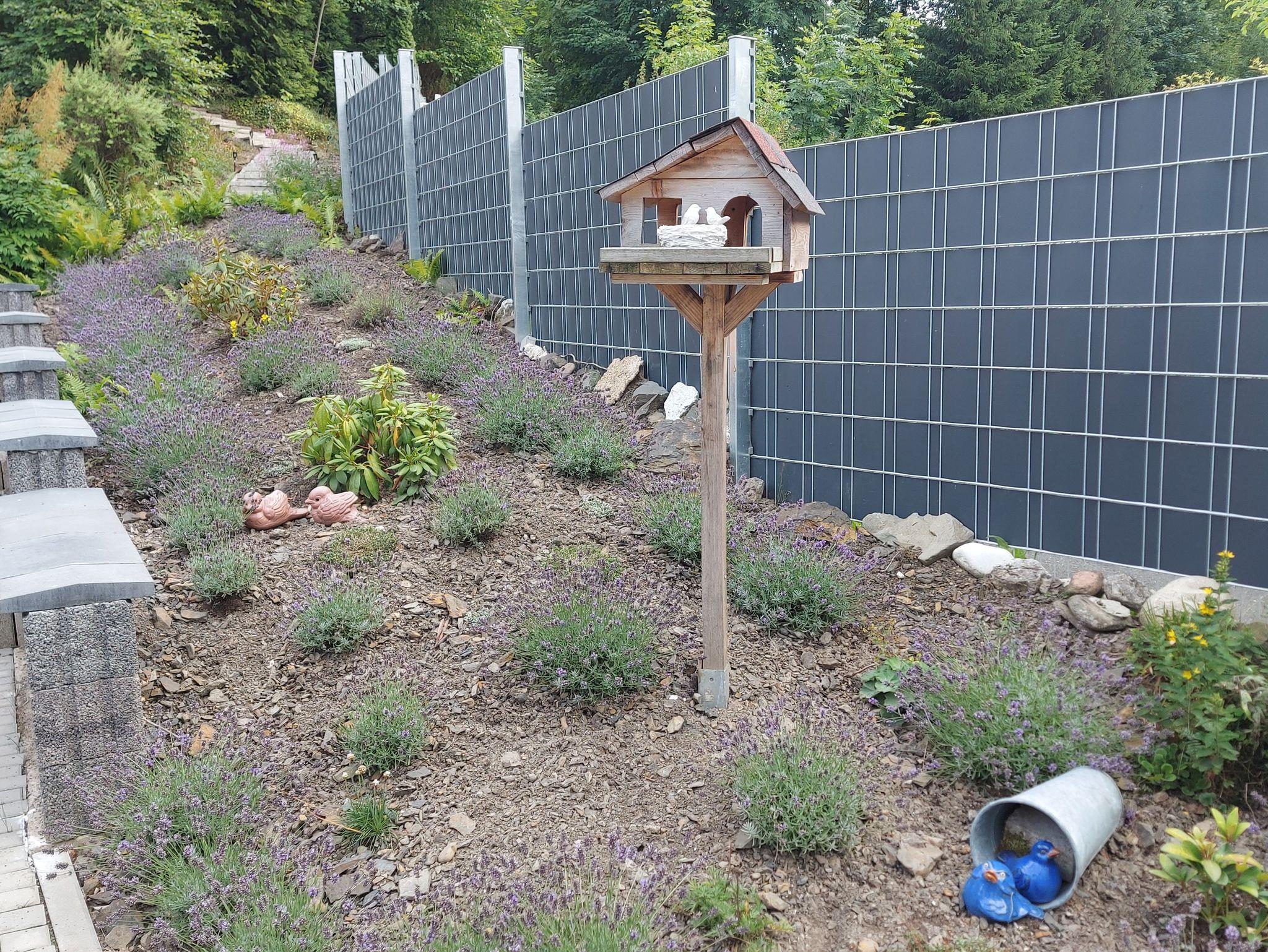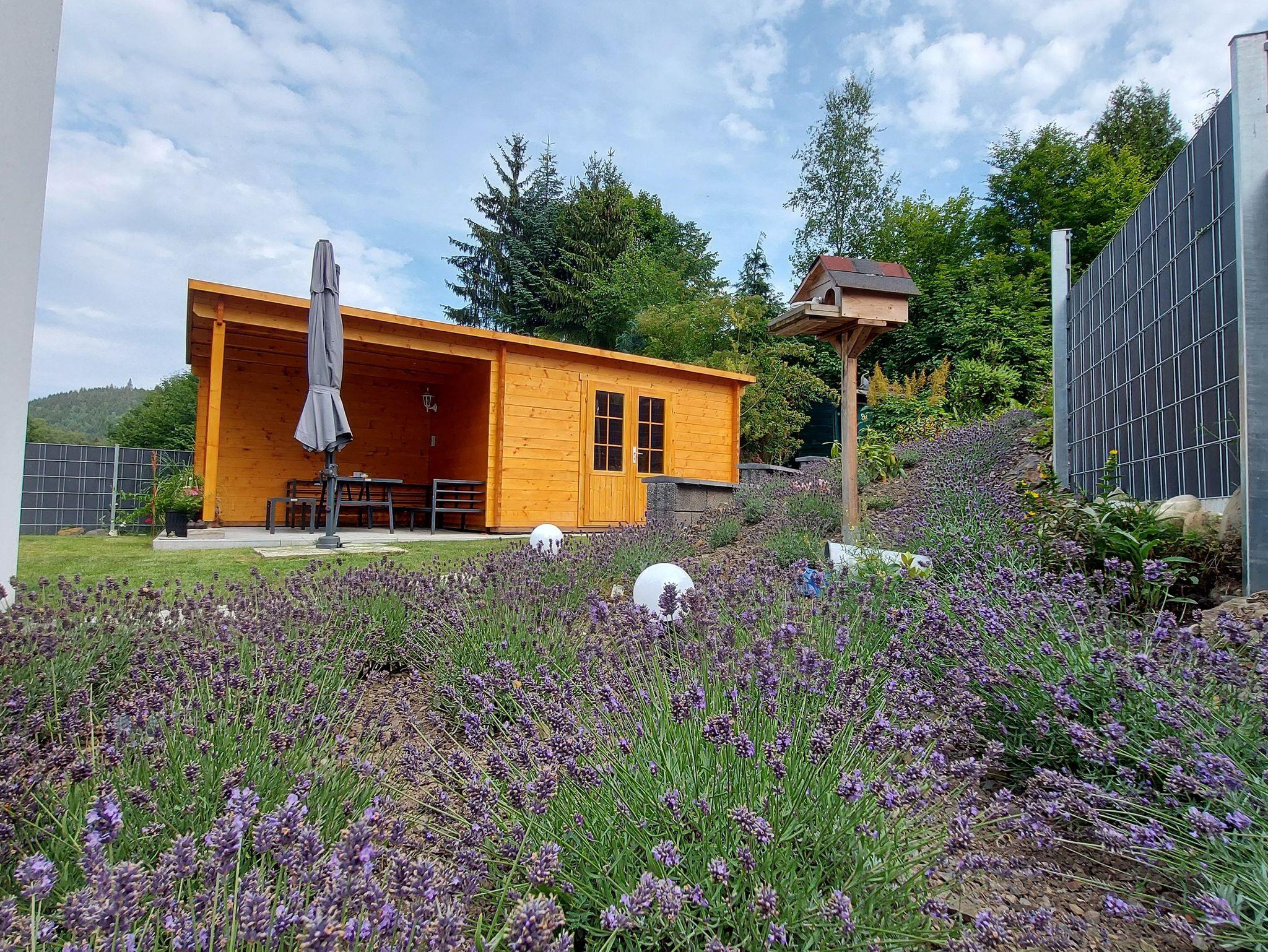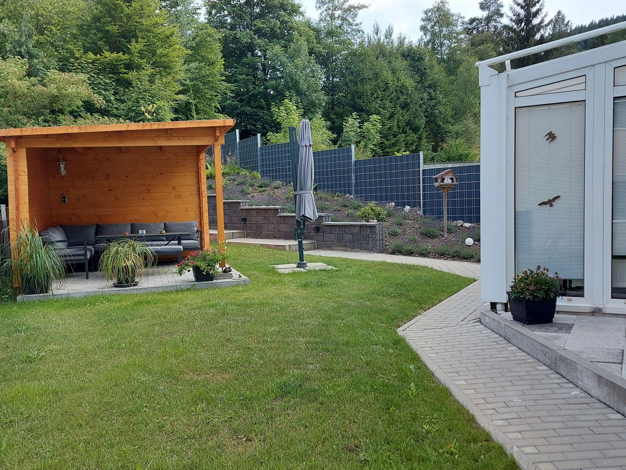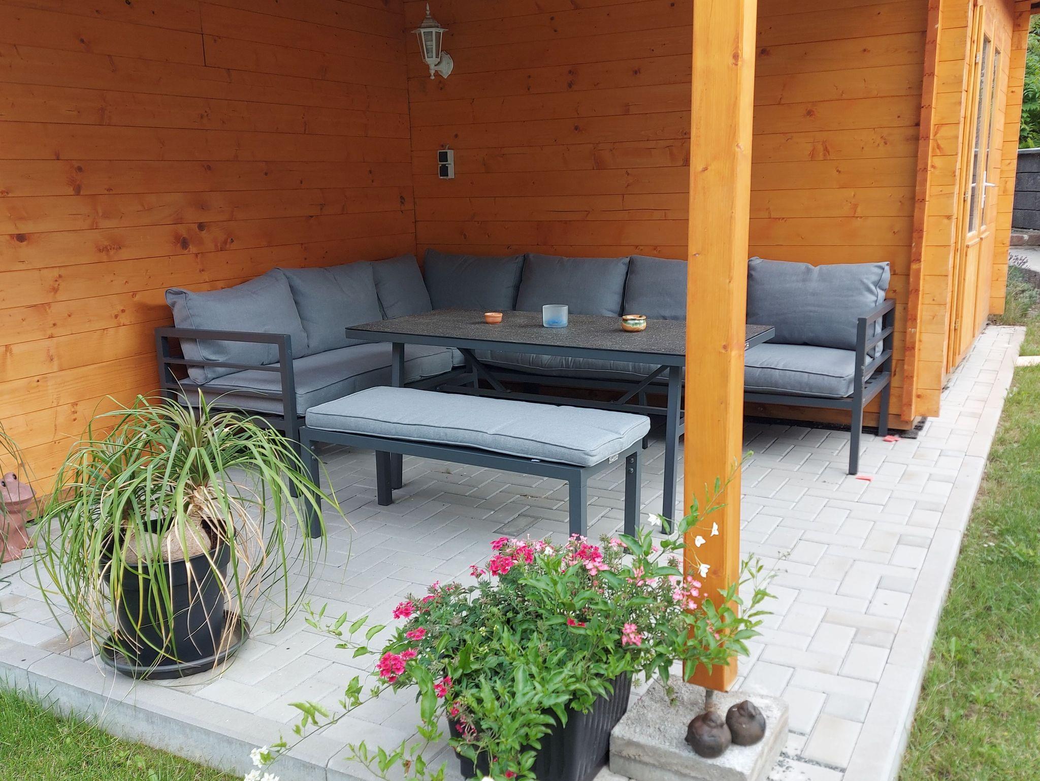Großer eigener Gartenbereich mit rustikalem Holzmobiliar und Grillmöglichkeit, Spielhaus, Sandkiste für Kinder und Federballplatz. Wald und Wanderwege am Haus.
