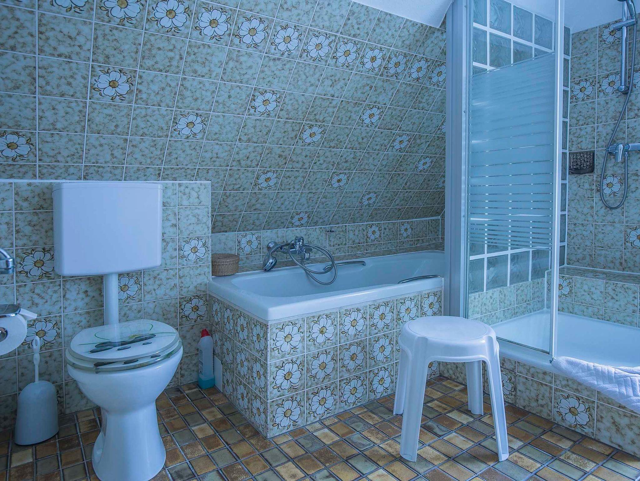 Das Badezimmer hat Dusche und Badewanne, WC.