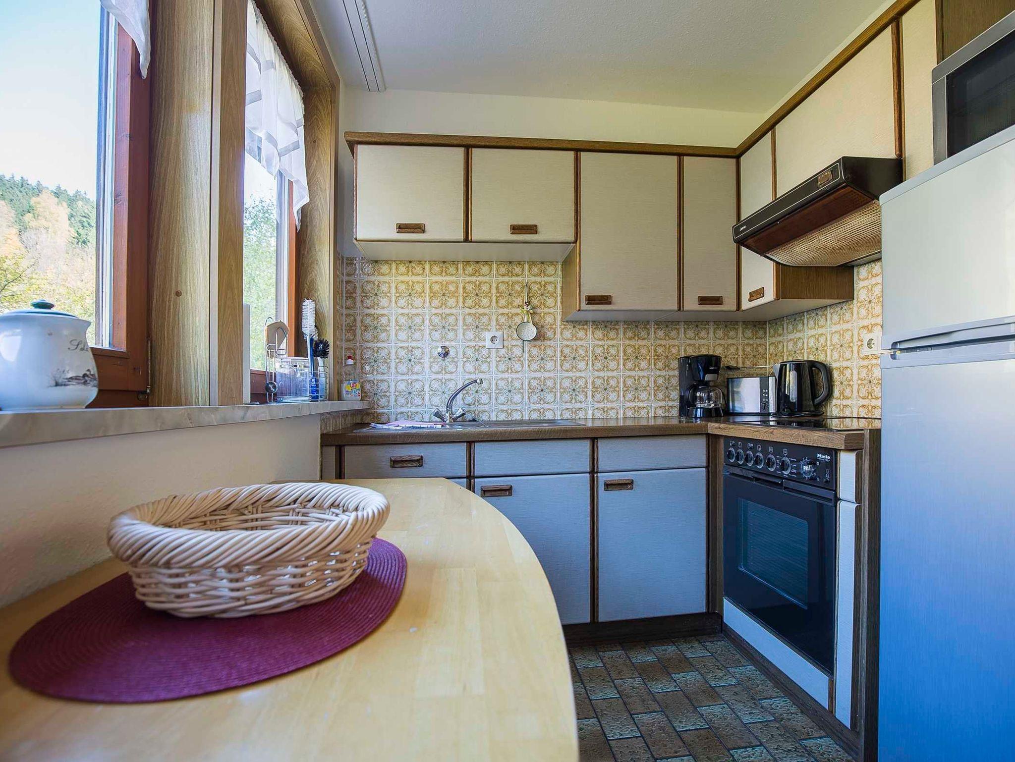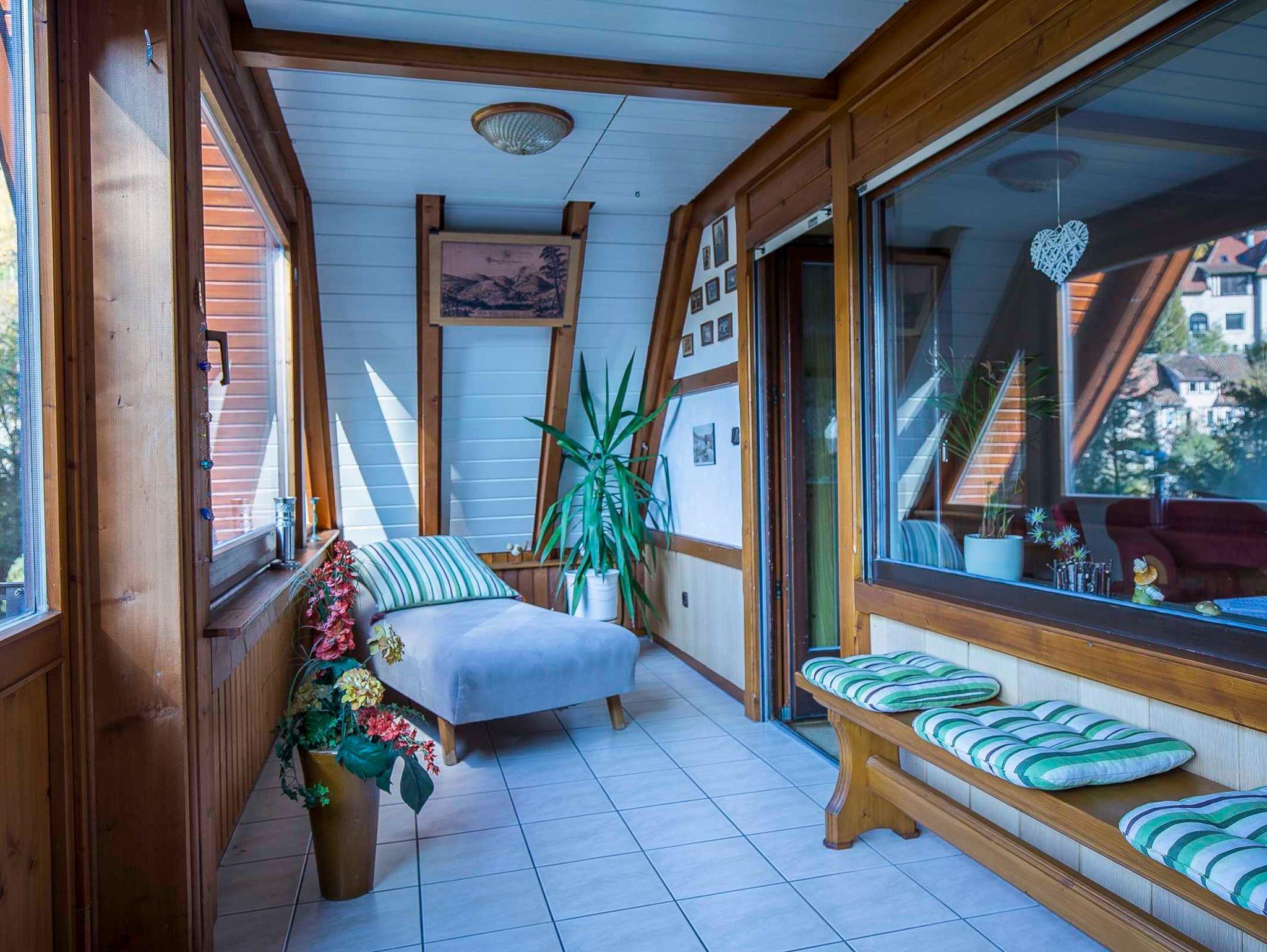 Die sonnige Nichtraucher-Ferienwohnung Romantischer Ausblick neben der Pension Brückner in Wildemann im Oberharz bietet: Wohnzimmer mit Schlafsofa, Essecke und Wintergarten, große Dachterrasse mit Grillkamin (Grillbesteck vorhanden), zusätzlicher Balkon, 2 Schlafzimmer jeweils mit Doppelbett und großem Einbauschrank ausgestattet. Badezimmer mit Dusche und Badewanne, WC, komplett ausgestattete Küche: Herd mit 4 Platten und Backofen, Kühlschrank und Froster, Kaffeemaschine, Toaster, Eierkocher.
