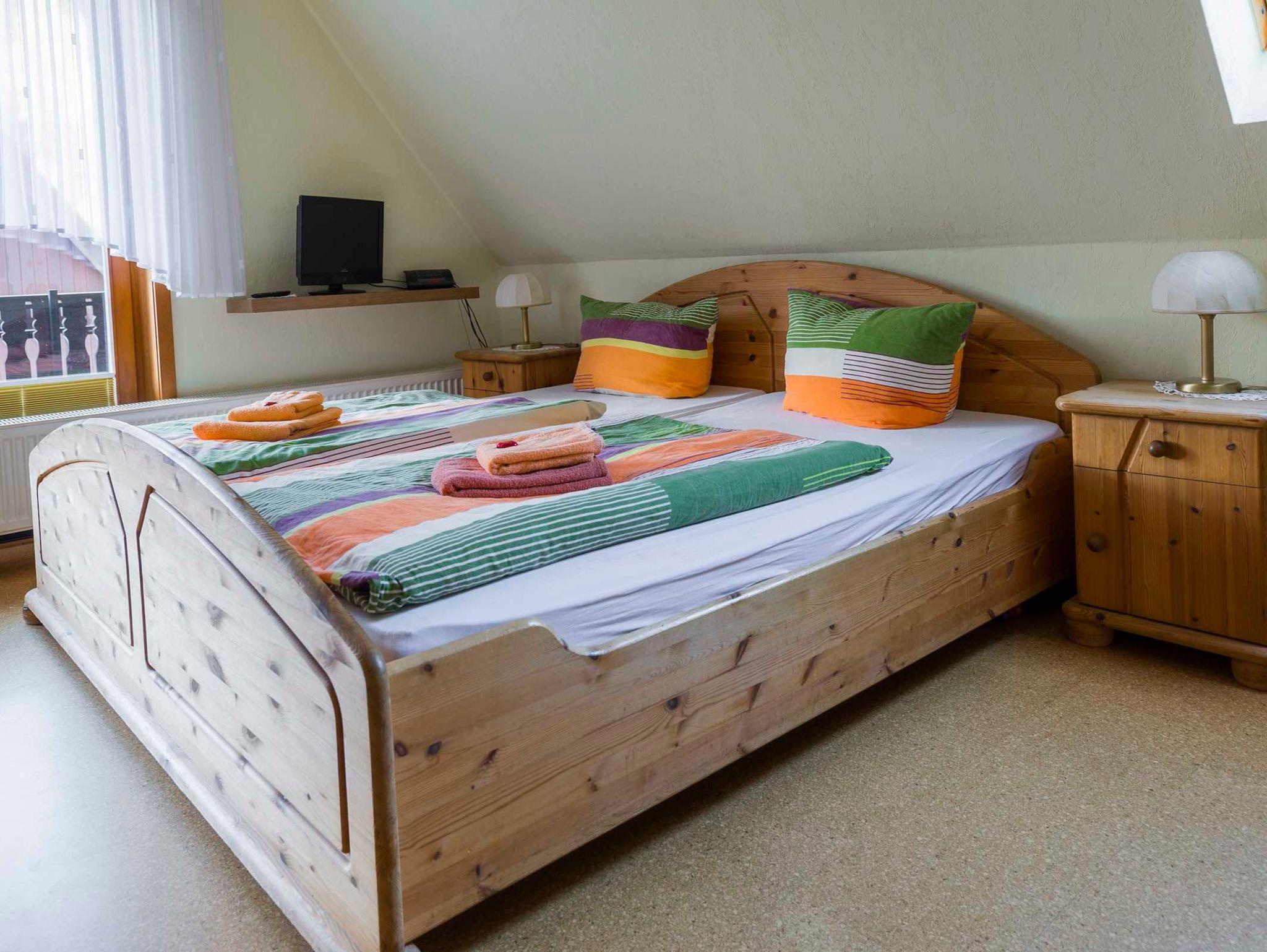 Das Doppelzimmer mit Dusche / WC und Korkfussboden liegt im Obergeschoss der Pension Brückner in Wildemann im Oberharz und ist über 15 Treppenstufen zu erreichen.