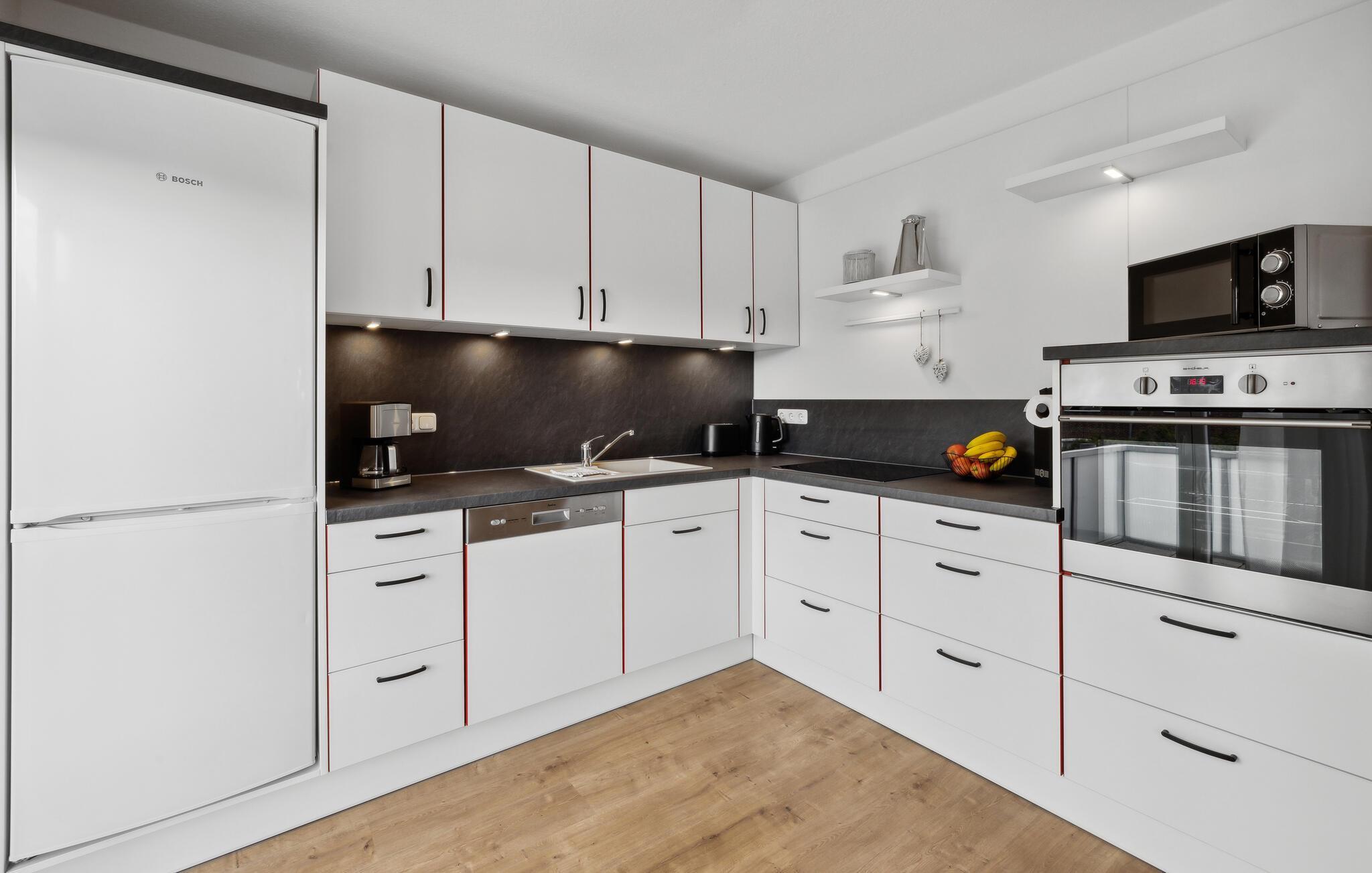 Velkommen til denne dejlige lejlighed, der ligger på første sal og danner rammen om en ferie med mange skønne udflugter. Boligen er nydeligt indrettet med varme trægulve, komfortable møbler og et fuldt udstyret køkken, hvor familiens kokke kan kræse om livretterne efter dagens muntre leg. Servér aftensmaden ved det rustikke spisebord af træ og rund aftenen af i sofaerne med brætspil, snacks og en god film, mens I lægger planer for de kommende dage.