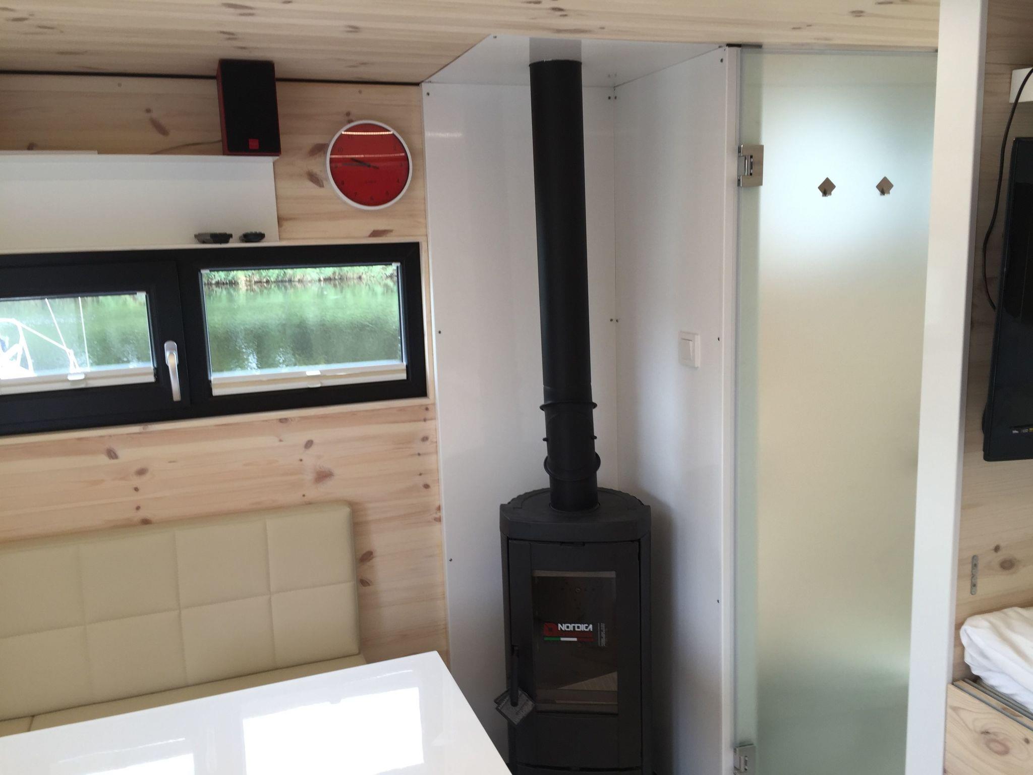 The houseboat measures around 25m² and comprises a lounge with a fireplace, a sofa suite with a dining table and seating for 3-4 people, a flatscreen TV and a radio. The kitchen unit is equipped with an induction hob, microwave, toaster, kettle, fridge, sink and coffee machine. There is a separated off bedroom with a double bed and a separate bathroom with a WC, washbasin and shower. You can find everything you need for a comfortable stay within a small space.