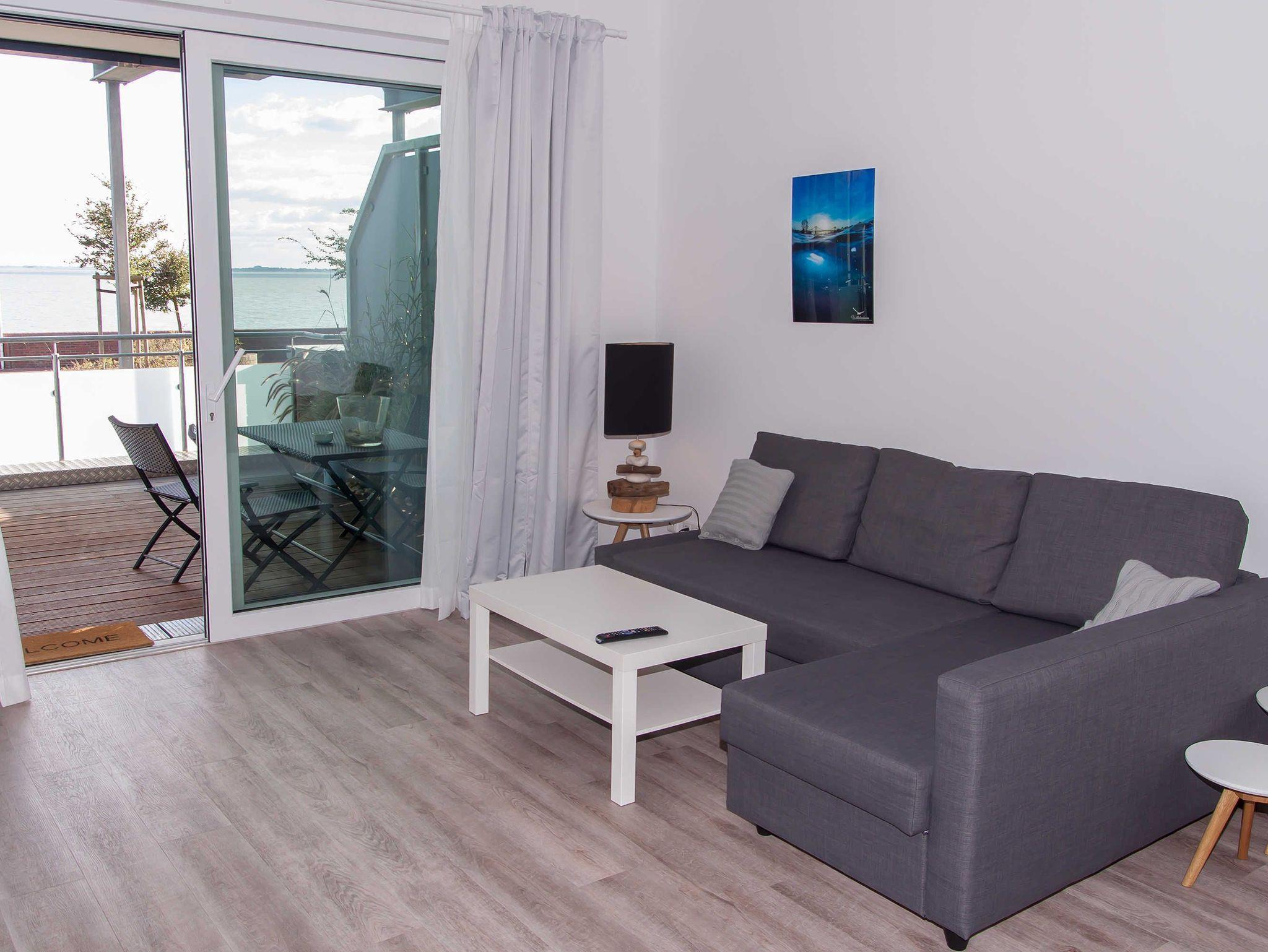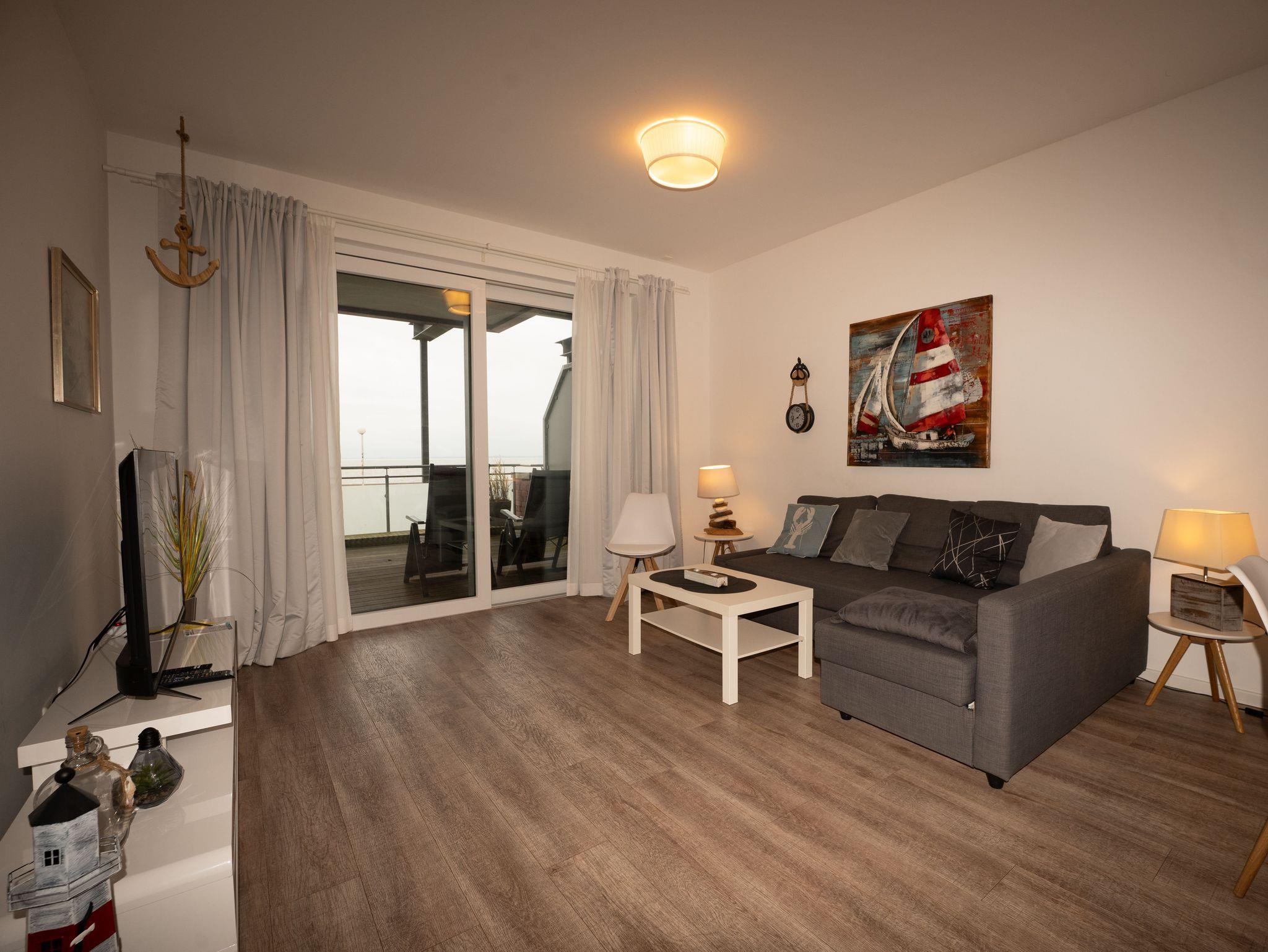 Das Sofa kann zu einer zusätzlichen Schlafgelegenheit umgebaut werden. Im Schlafzimmer befindet ein großes Doppelbett und ein Kleiderschrank. Vom Wohn- und Schlafzimmer gelangen Sie auf den Balkon mit Blick auf die Nordsee bis hin zum Leuchtturm Arngast.