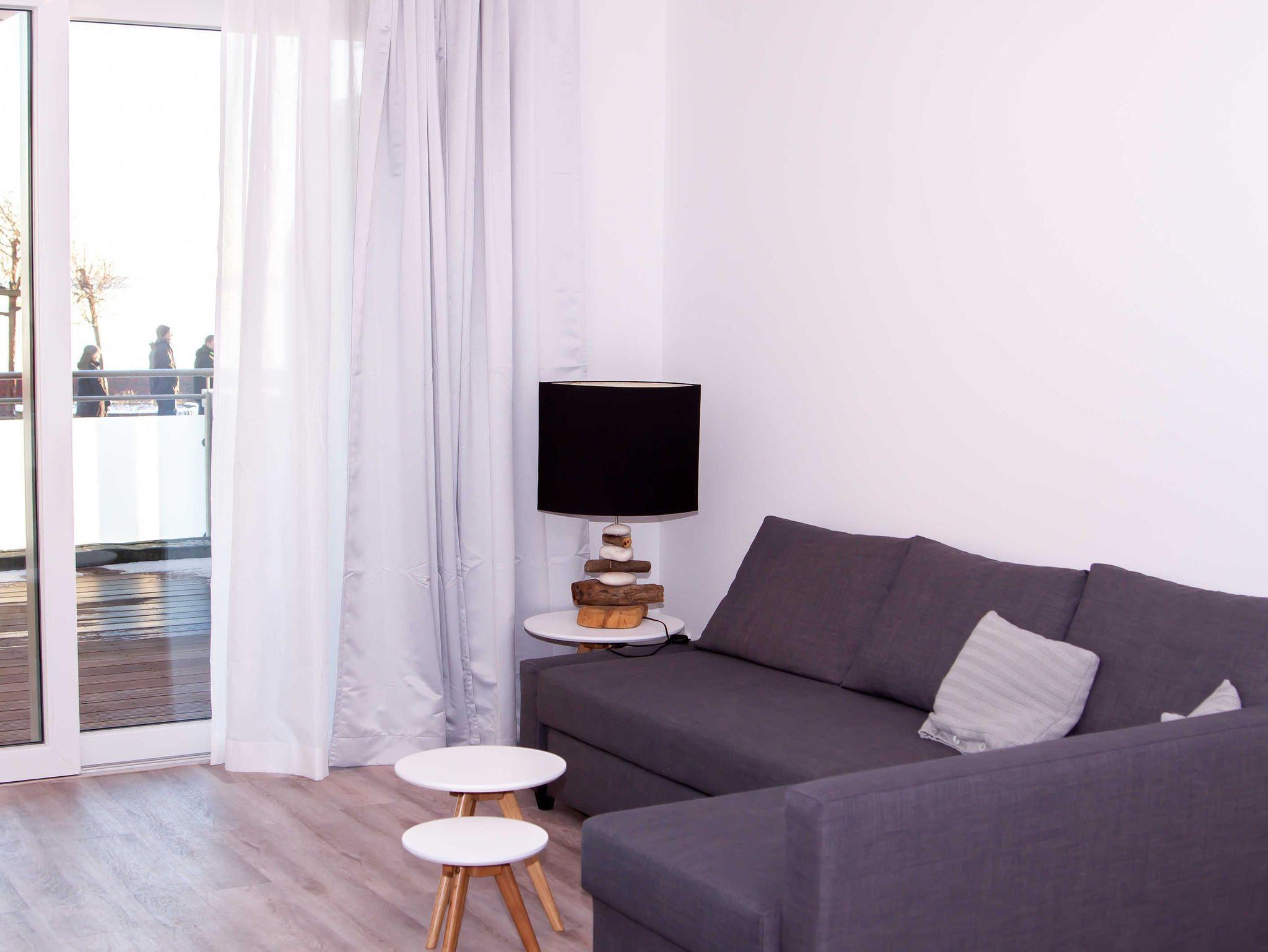 Der Wohnbereich verfügt über eine Schlafcouch, einen Flat-TV, einen DVD-Player sowie einem WLAN-Anschluss.