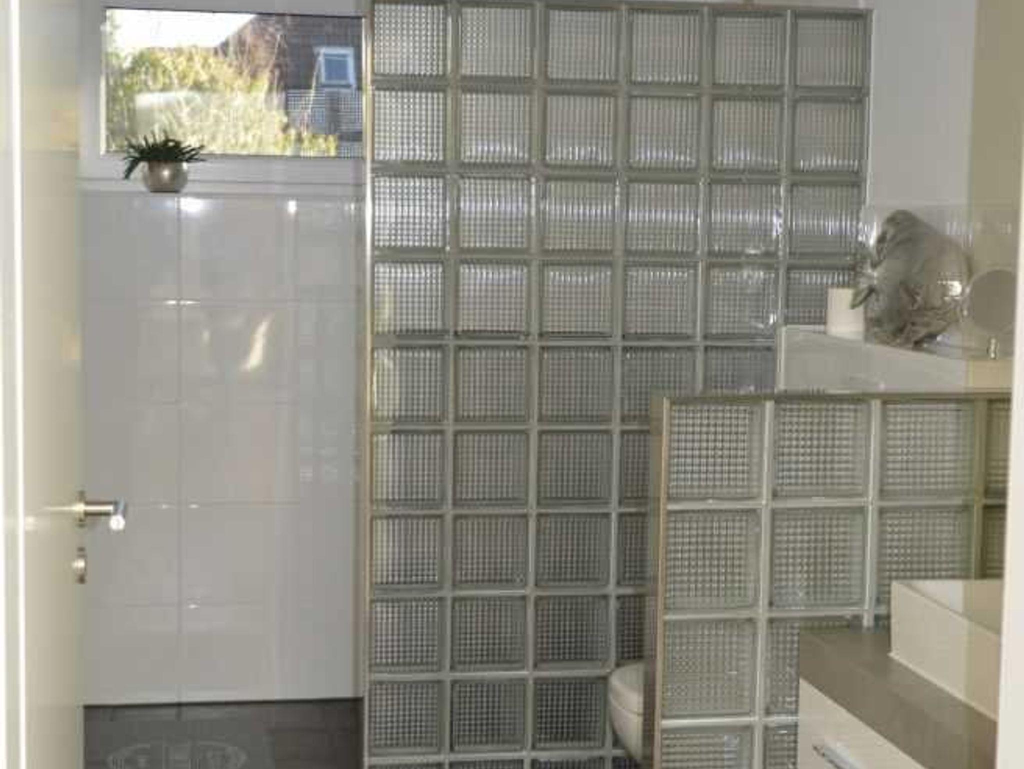 Das Badezimmer verfügt über eine große begehbare Dusche, die mit Glasbausteinen abgetrennt ist.