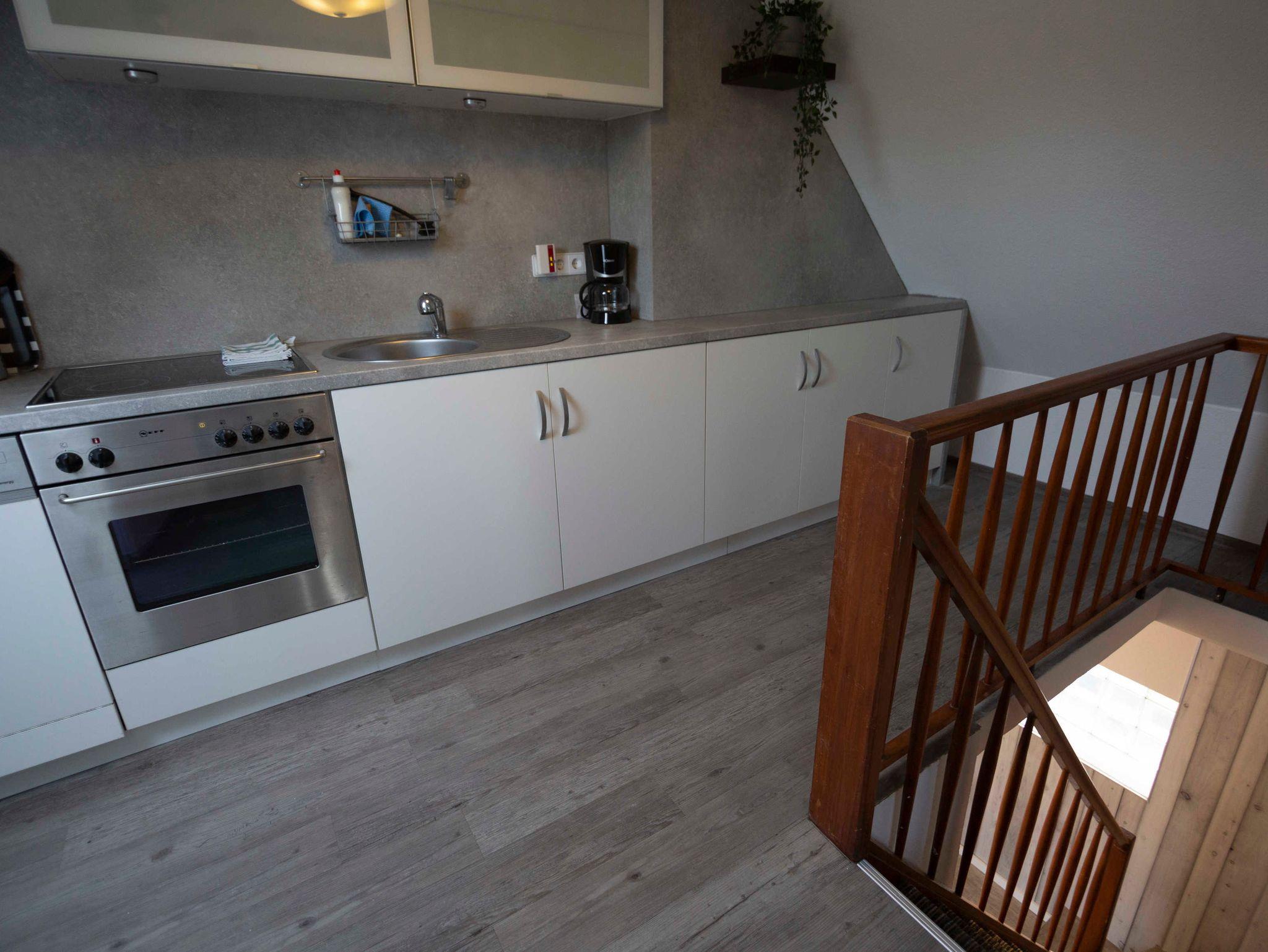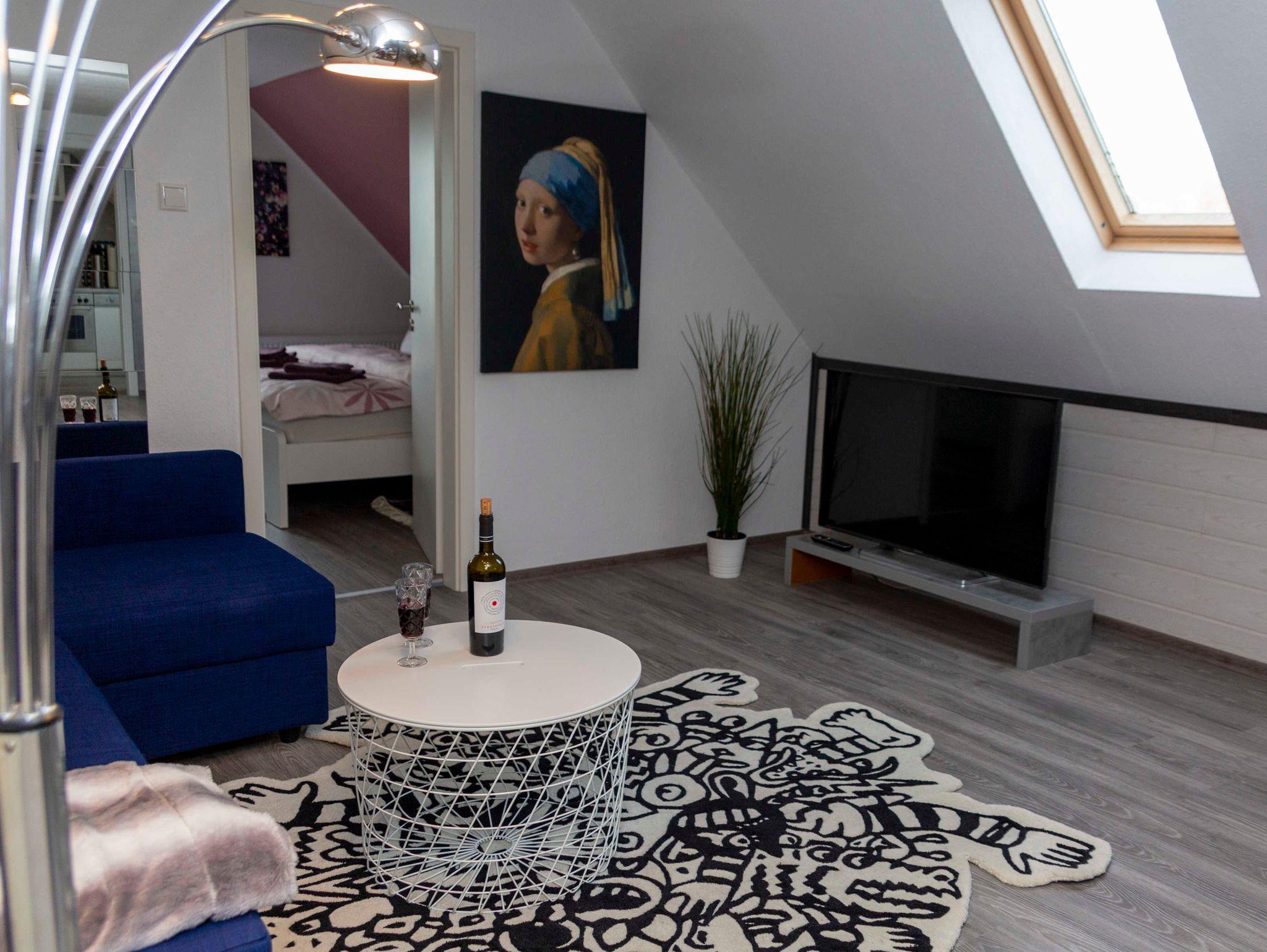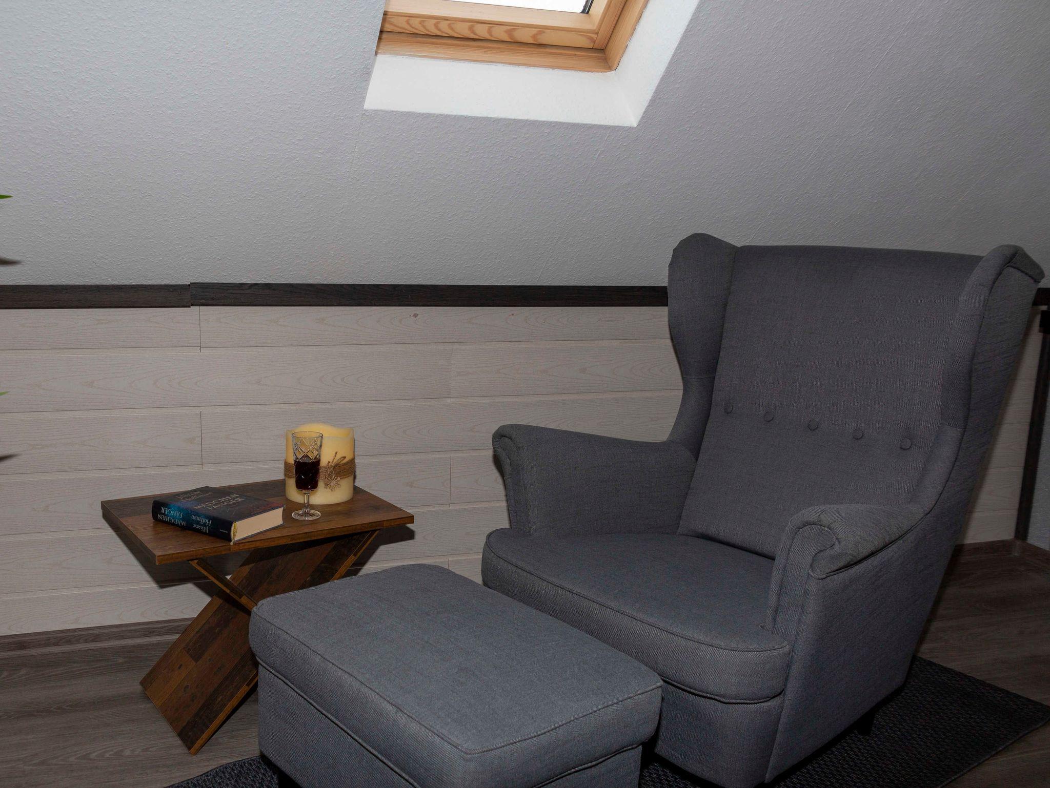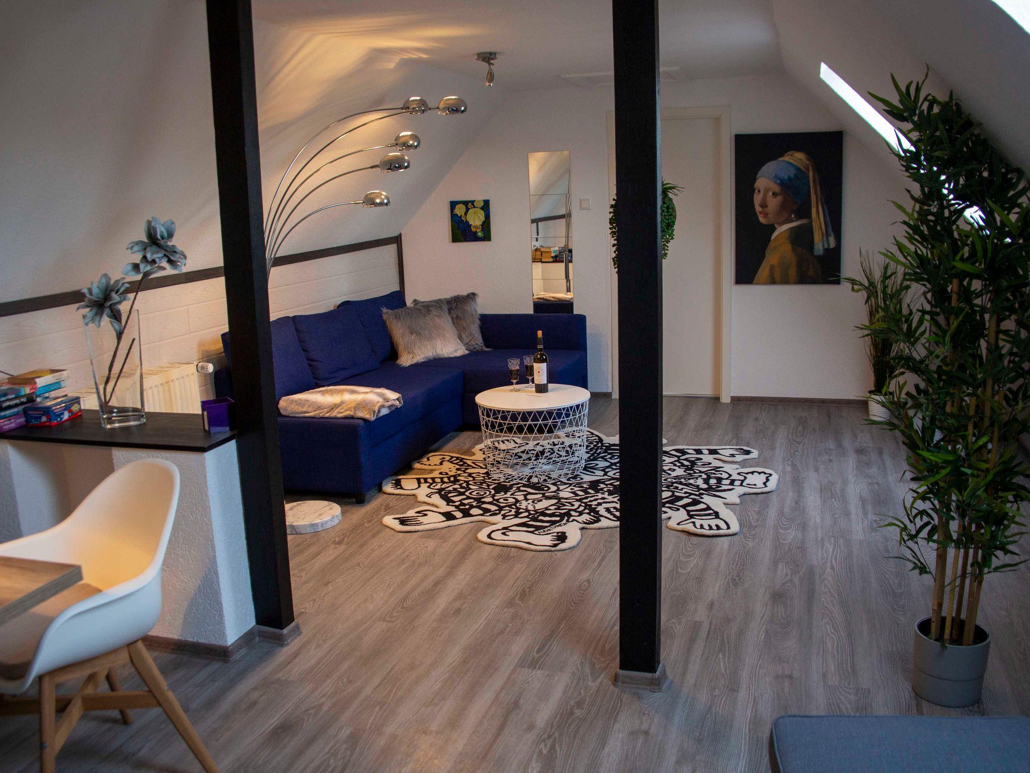 Unter dem Dach befindet sich ein gemütliches Schlafzimmer, ein großer moderner Wohn- und Essbereich, welcher in die Küche übergeht. Über eine Treppe gelangen Sie in das Erdgeschoß, in dem ein großzügiges Bad für Sie untergebracht ist. Ein großzügiger Außenbereich bietet den Gästen eine überdachte Terrasse und viel Parkraum an. Auf dem ehemaligen Speditionsgelände sind derzeit drei Ferienwohnungen untergebracht. WLAN, Fernseher in den Schlafzimmern und Wohnzimmern sowie eine moderne Waschküche im Keller sind Extras, welche im Preis inbegriffen sind.