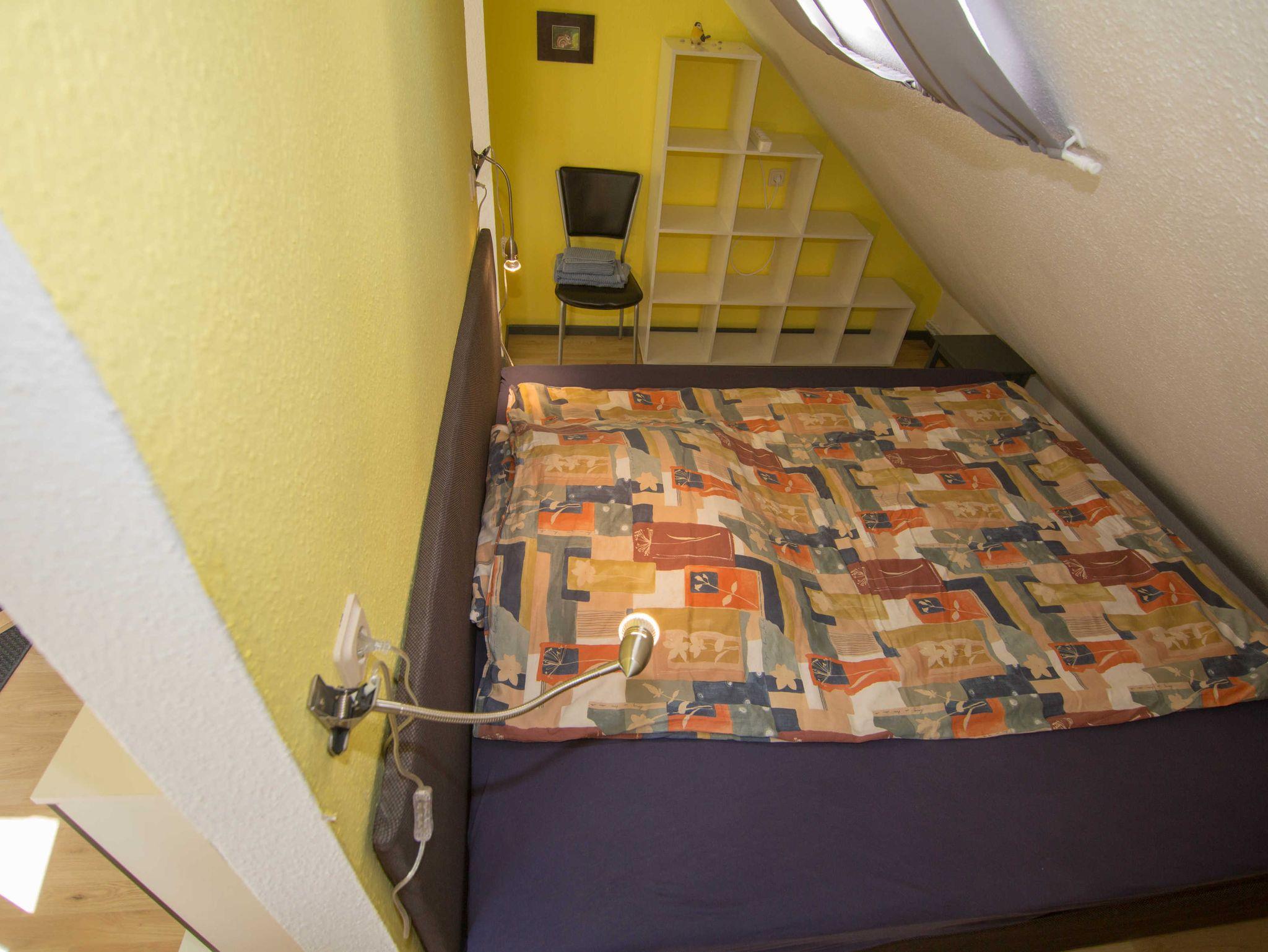 Vom Wohnzimmer erreichbar befindet sich eine Schlafnische in einer Dachschrägen. Hier befindet sich ein Boxspringbett mit einer Liegefläche von 1,80 m x 2,00 m.