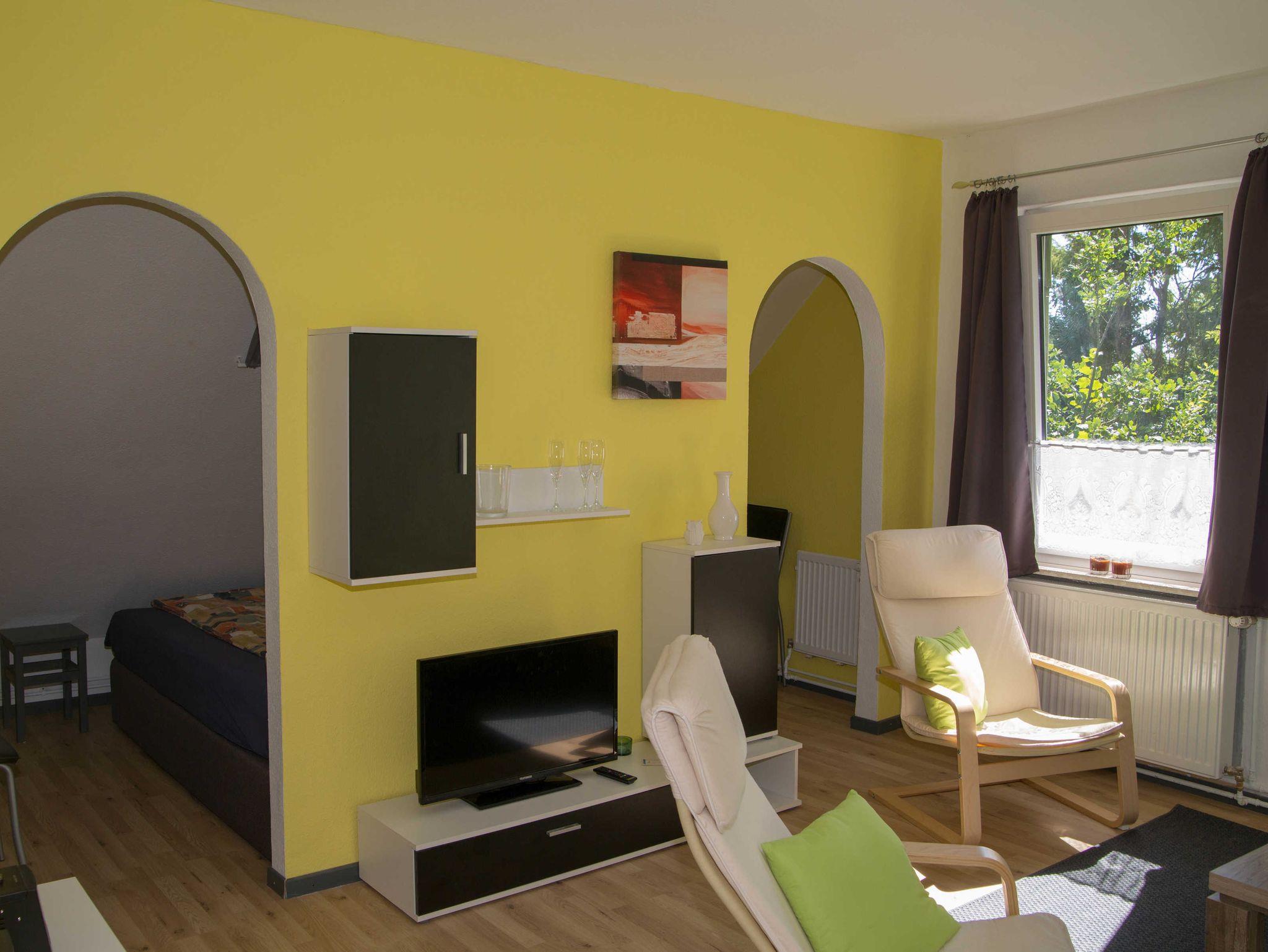 Das helle Wohnzimmer hat eine Schlafcouch mit einer Liegefläche von 1,40 m x 2,00 m, auf der zwei Personen übernachten können. Ein Fernseher mit Satellitenempfang und eine Musikanlage sind vorhanden.