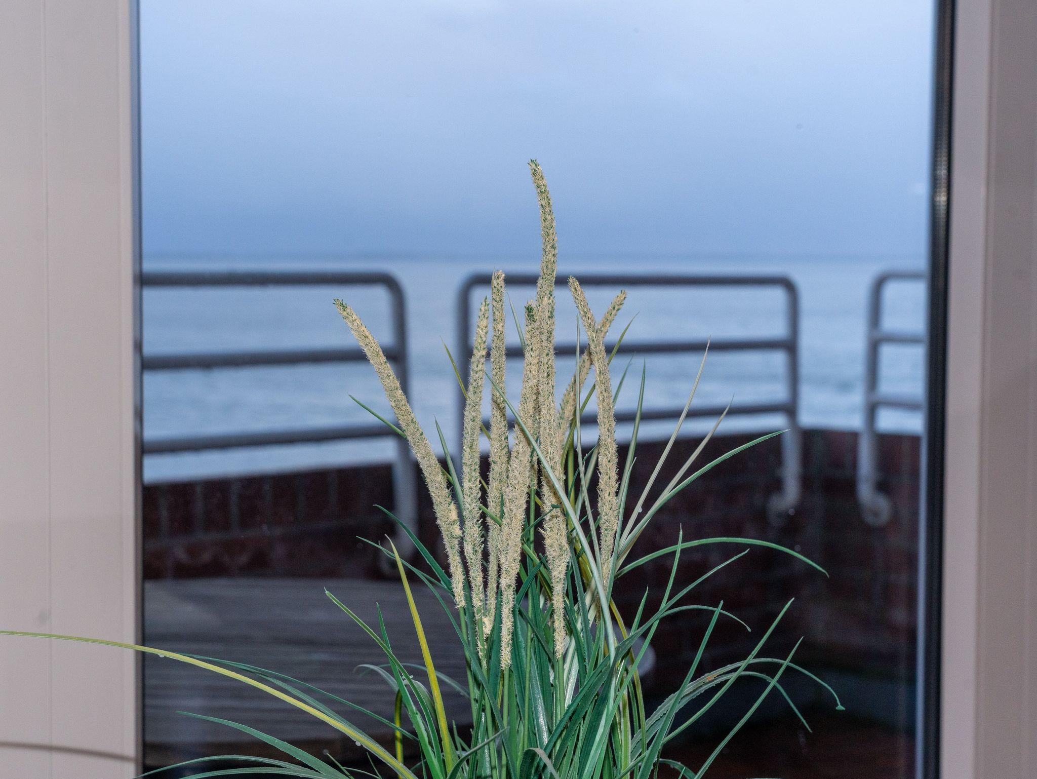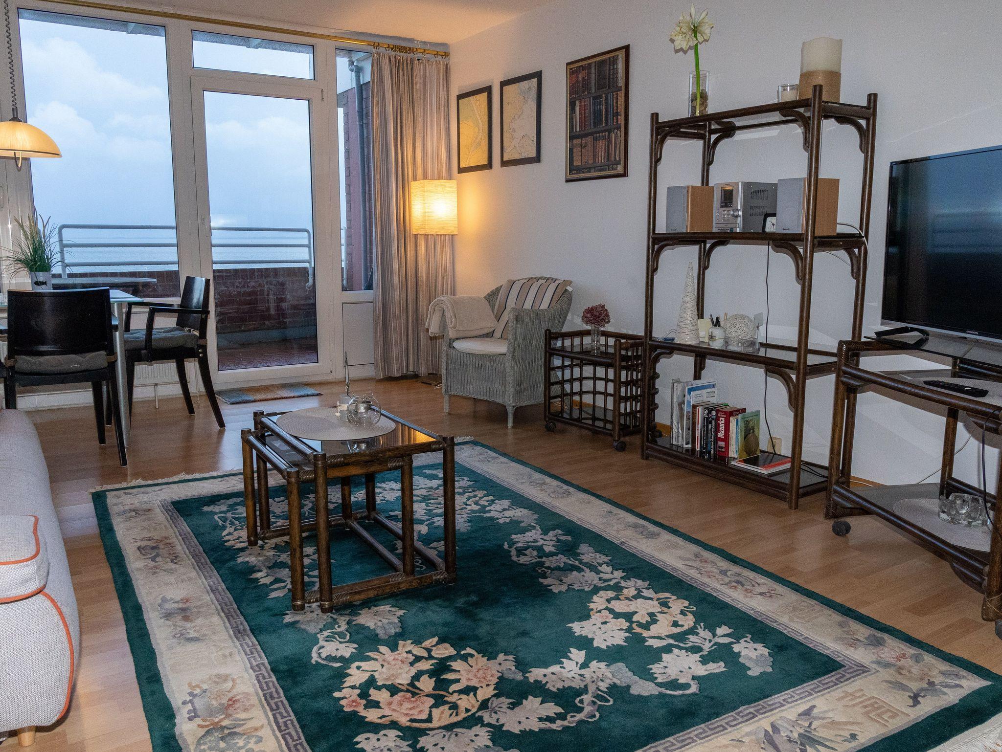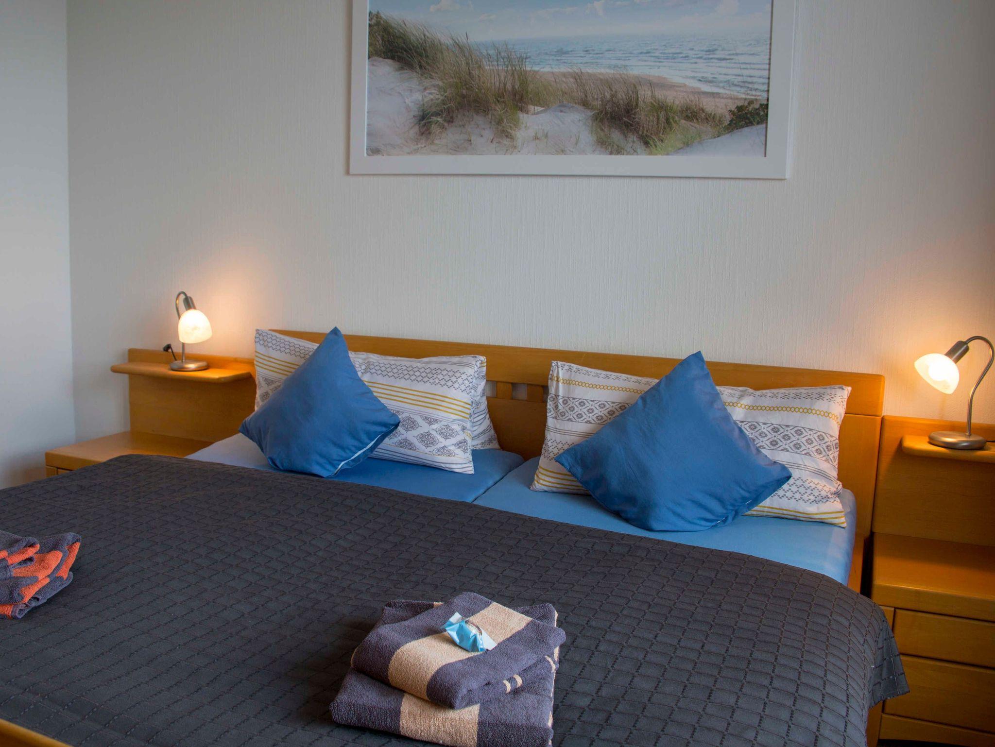 Im Schlafzimmer befindet sich ein Doppelbett mit großem Kleiderschrank. Das Wohnzimmer ist mit einer Schlafcouch ausgestattet und lässt sich bei Bedarf in ein weiteres Bett für eine weitere Person verwandeln. Ein Esstisch mit Stühlen ist direkt am großen Fenster untergebracht. Genießen Sie den weiten Blick aufs Meer. Über den modernen Flachbildschirm können Sie fernsehen. WLAN ist selbstverständlich vorhanden.