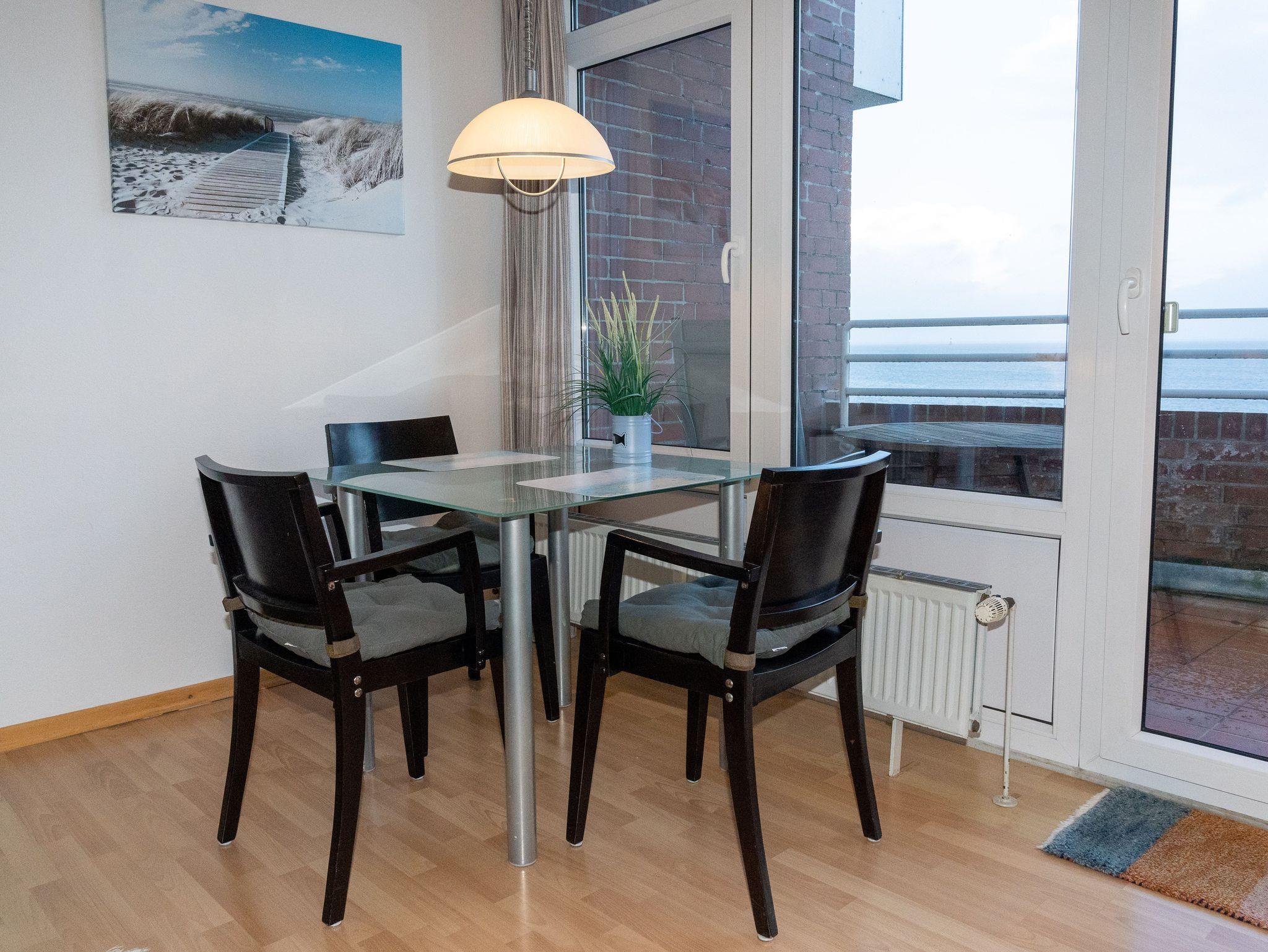 Der gemütliche, überdachte Balkon ist mit Tisch und Stühlen ausgestattet. Genießen Sie das Naturschauspiel Wattenmeer hautnah!