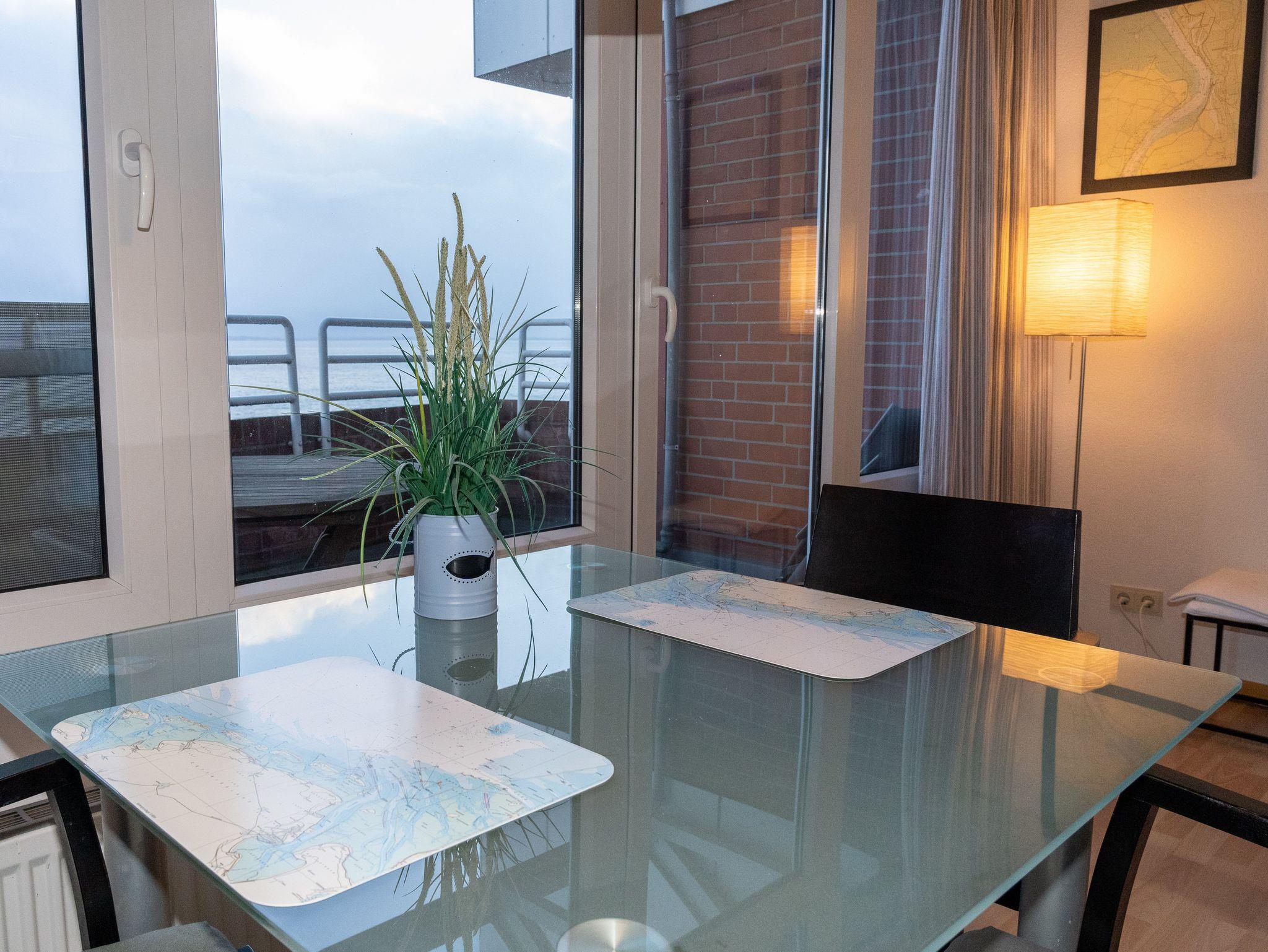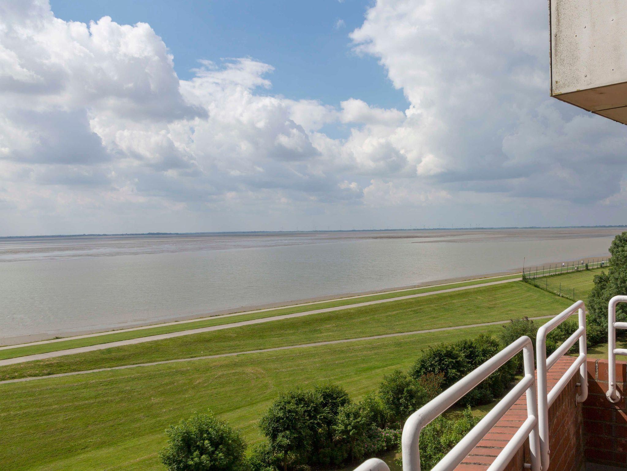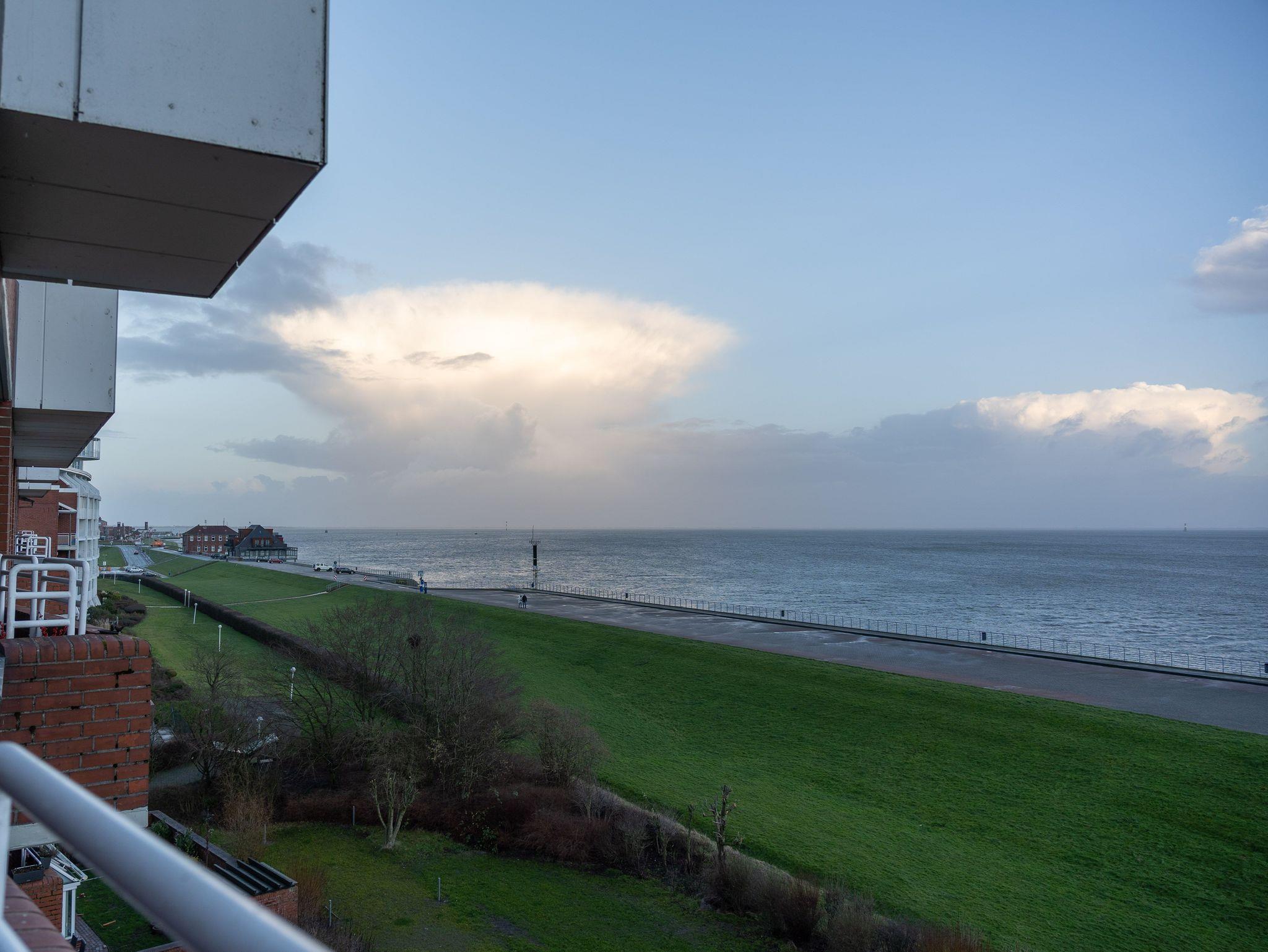 Die 65 qm große Ferienwohnung befindet sich im 5 Stock des beliebten Panoramahauses in Wilhelmshaven auf einer schmalen Landzunge zwischen Nordsee und großem Hafen. Wasser wohin man sieht.