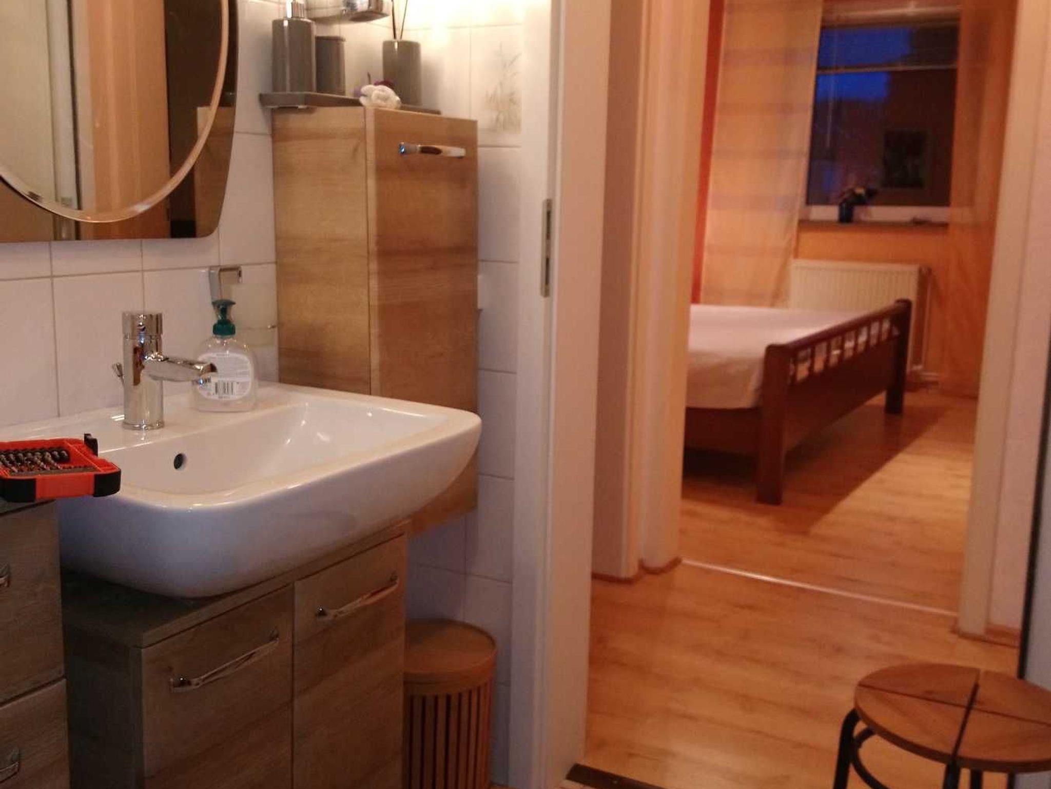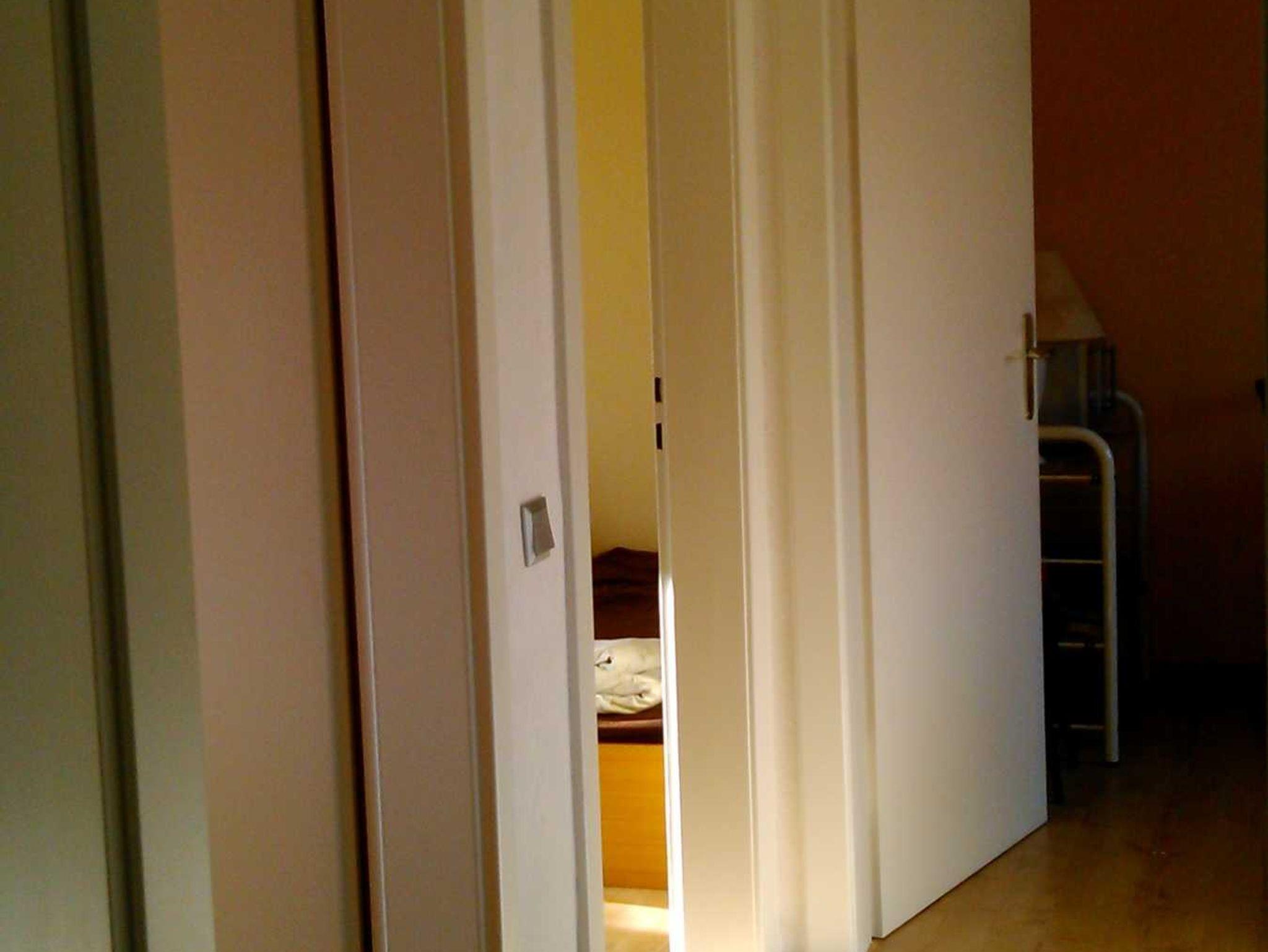 Das Apartment ist ideal für Alleinreisende und Paare, die Urlaub in Stadtnähe mit Freizeit am Strand und im Grünen verbinden wollen. Große Schiebetür zum Bad.
