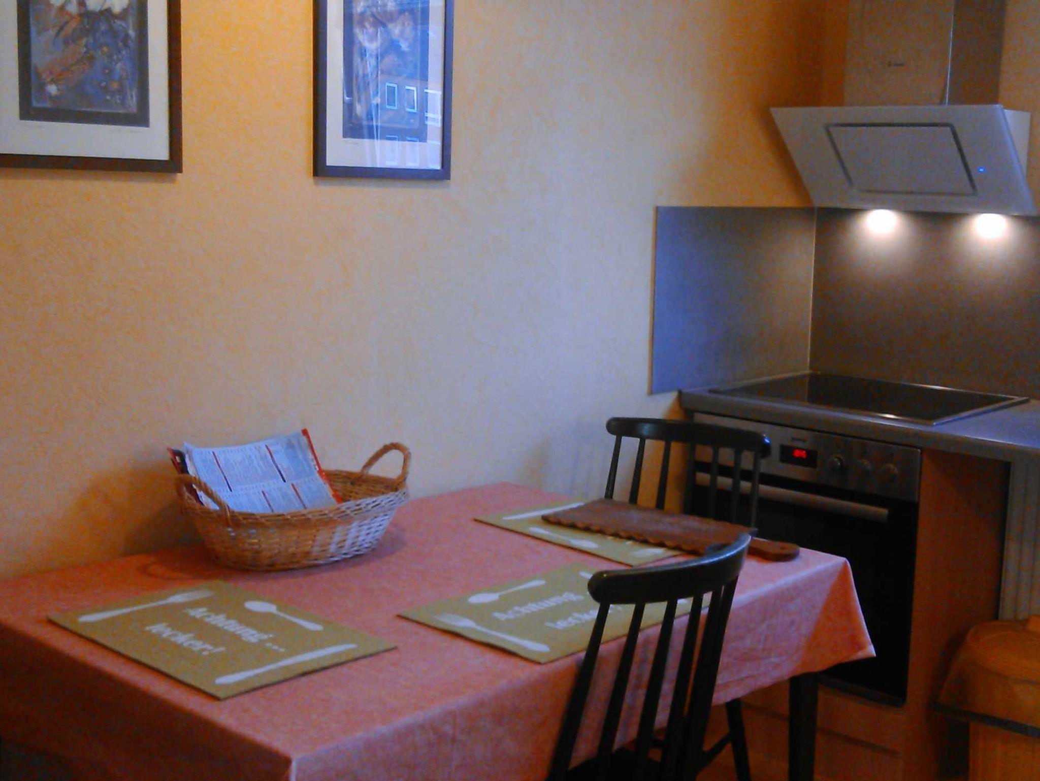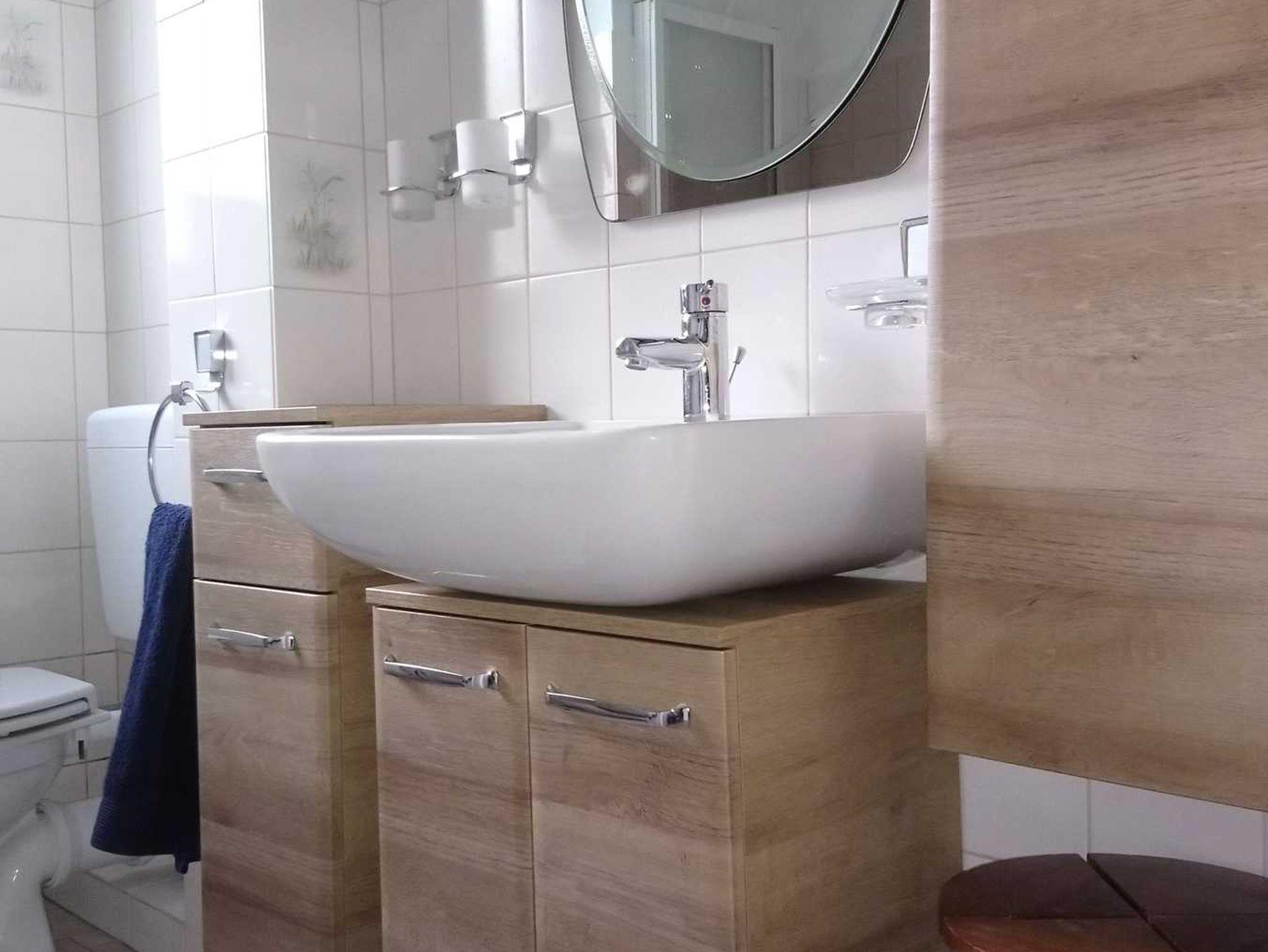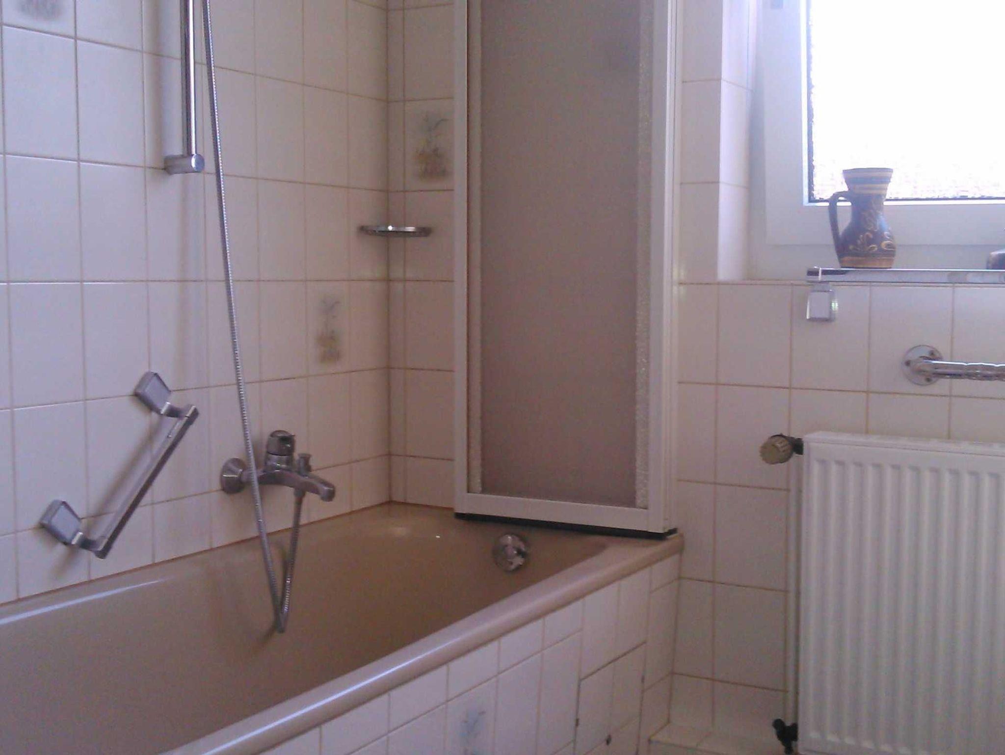 Voll eingerichtete FeWo mit 2 Zimmern und komplett eingerichteter Küche (ohne Spülmaschine), hochwertigen Vollholzmöbeln, mit Samsung 32 LCD-TV und schnellem Vodafone Wifi-WLAN-Internet. Bad mit Wanne und Handdusche hinter Duschabtrennung.