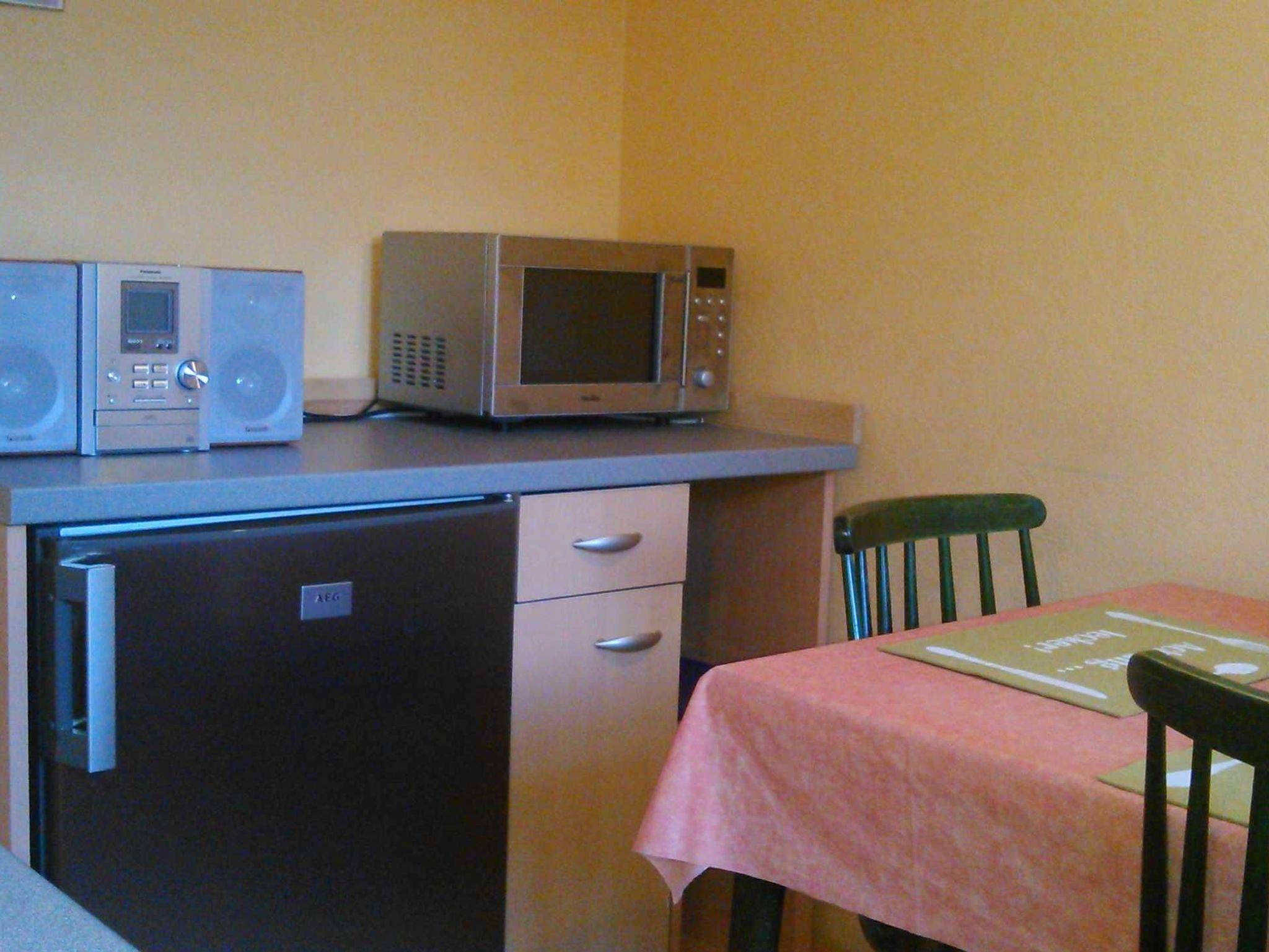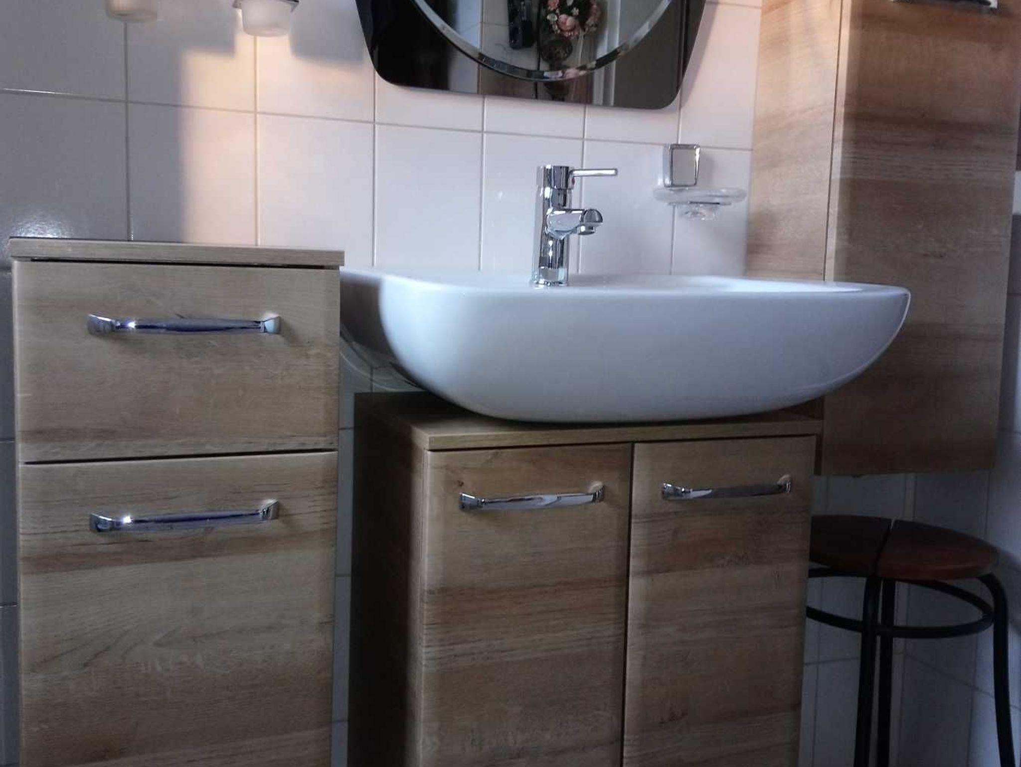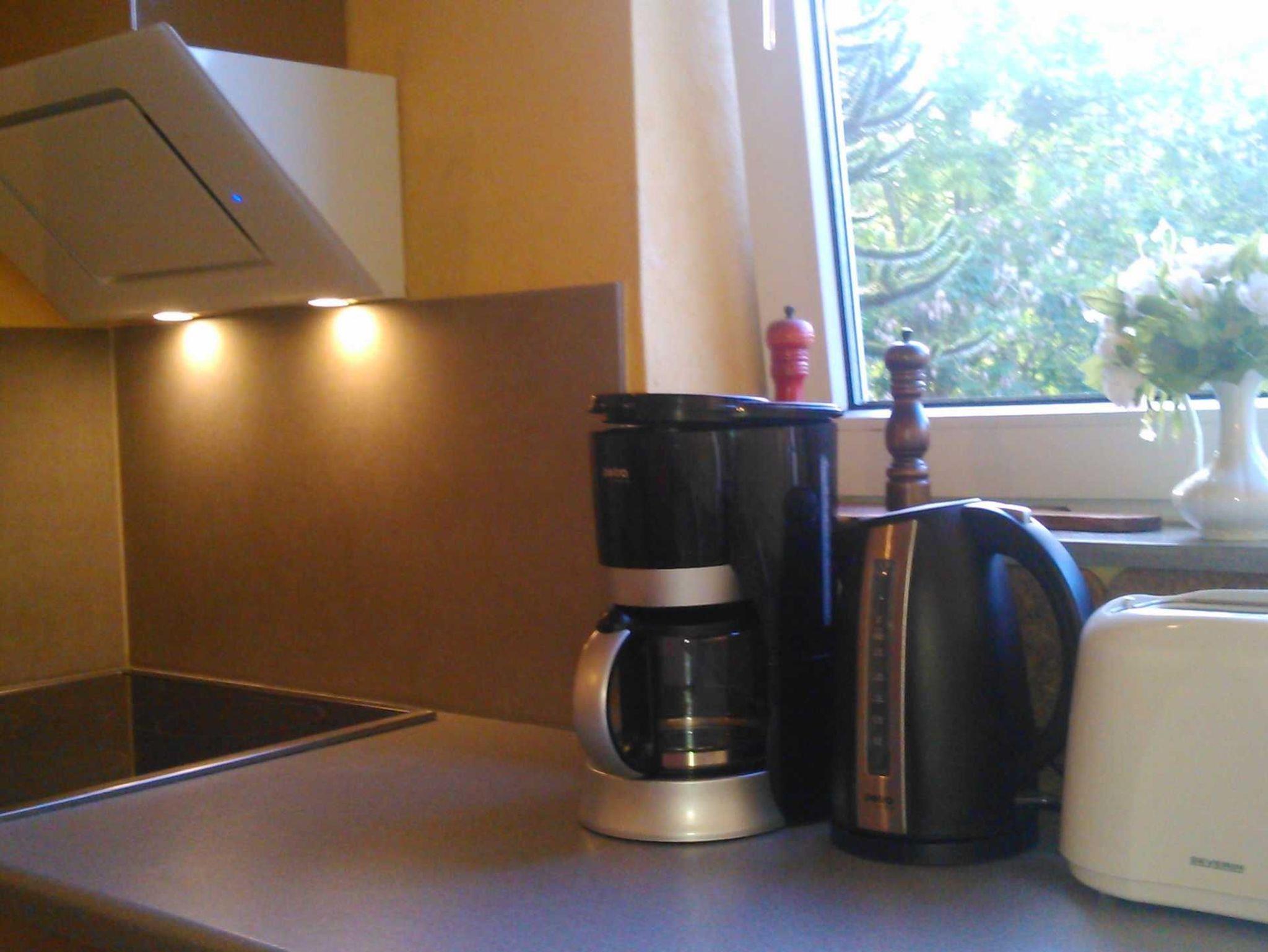 Voll eingerichtete FeWo mit 2 Zimmern und komplett eingerichteter Küche (ohne Spülmaschine), hochwertigen Vollholzmöbeln, mit Samsung 32 LCD-TV und schnellem Vodafone Wifi-WLAN-Internet. Bad mit Wanne und Handdusche hinter Duschabtrennung.