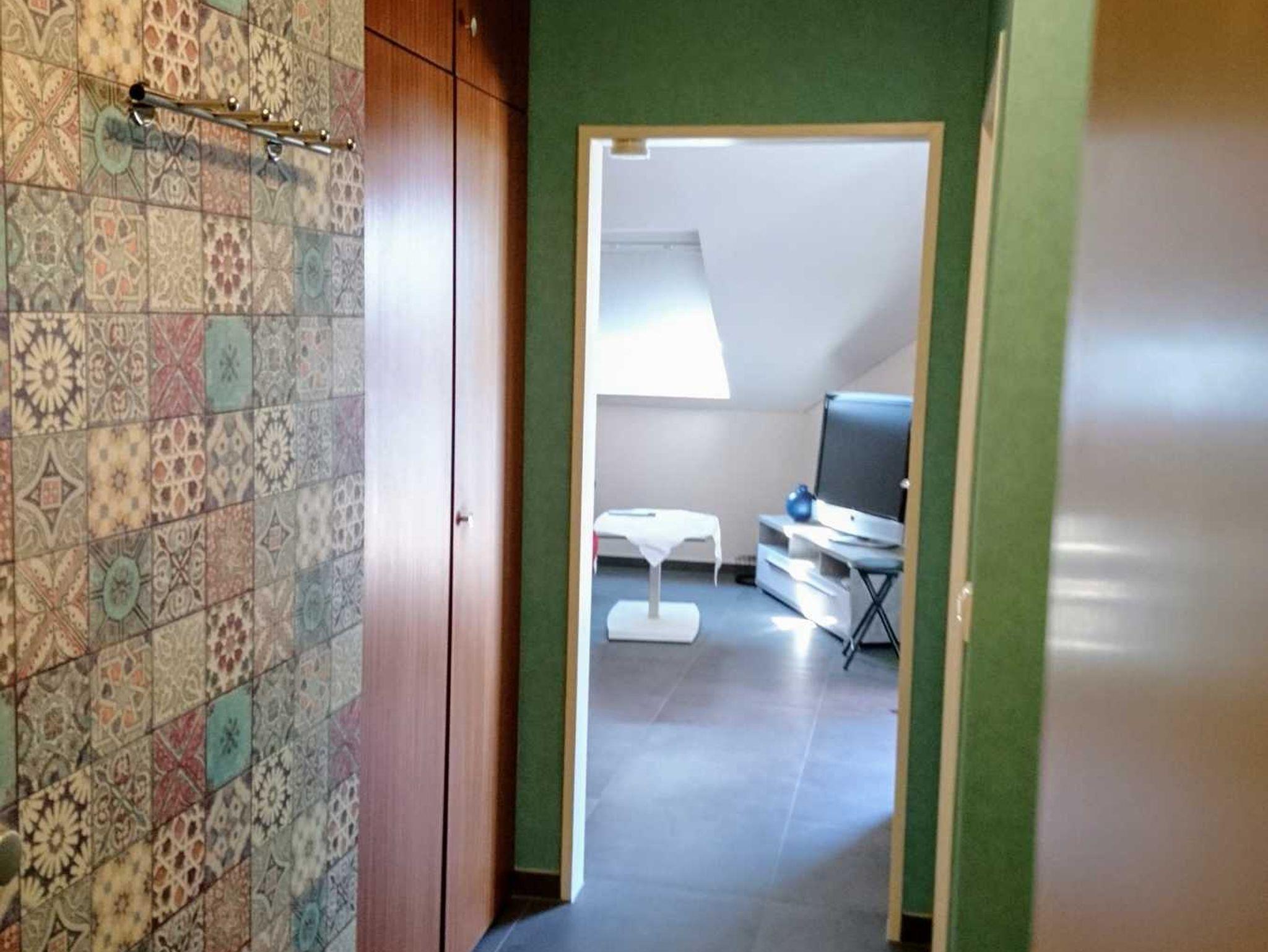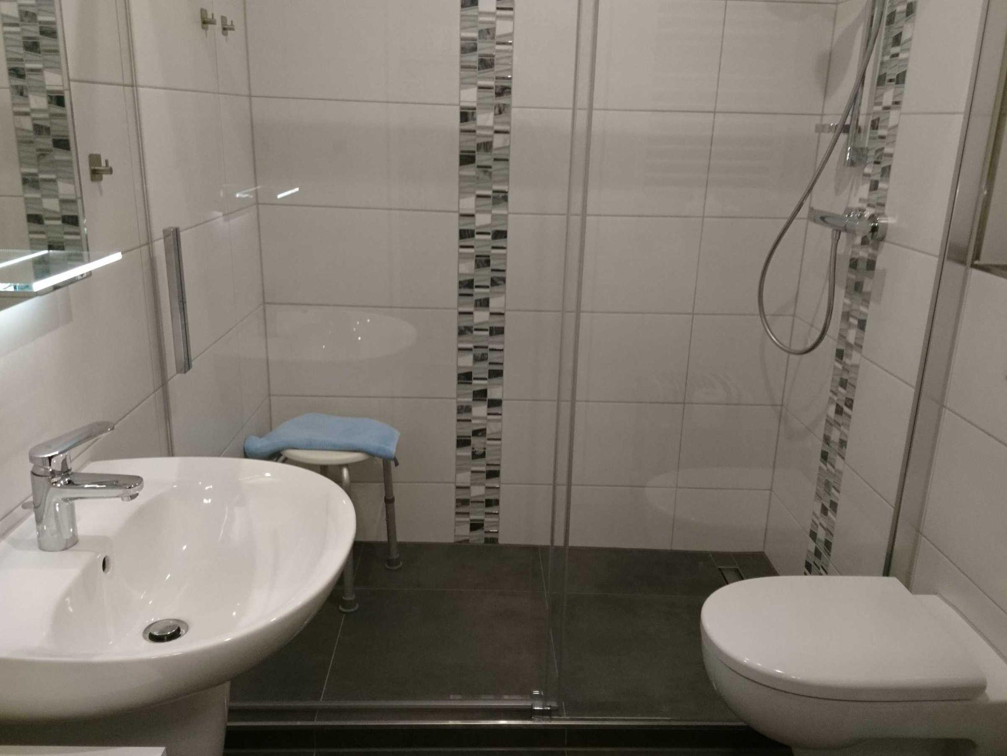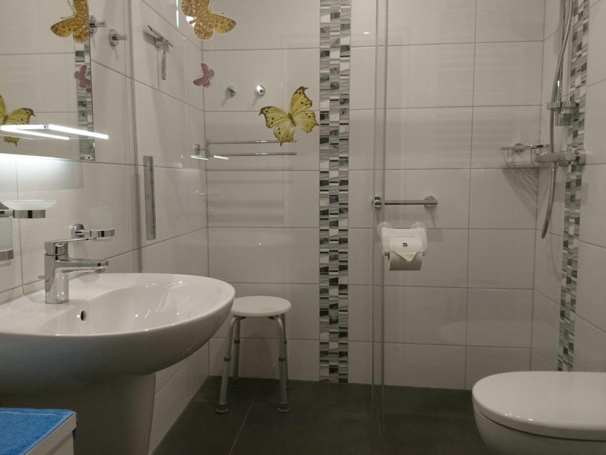 Das Badezimmer verfügt über eine begehbare Dusche.