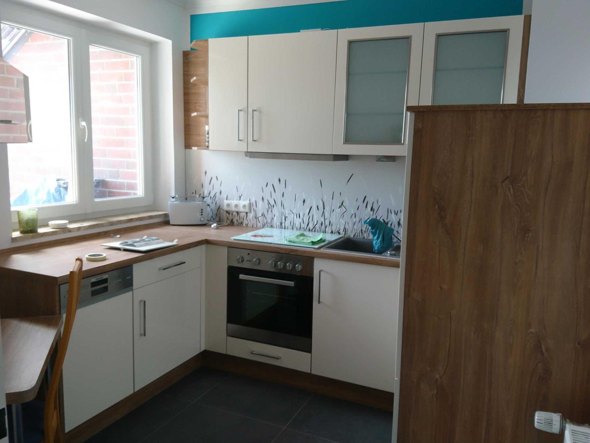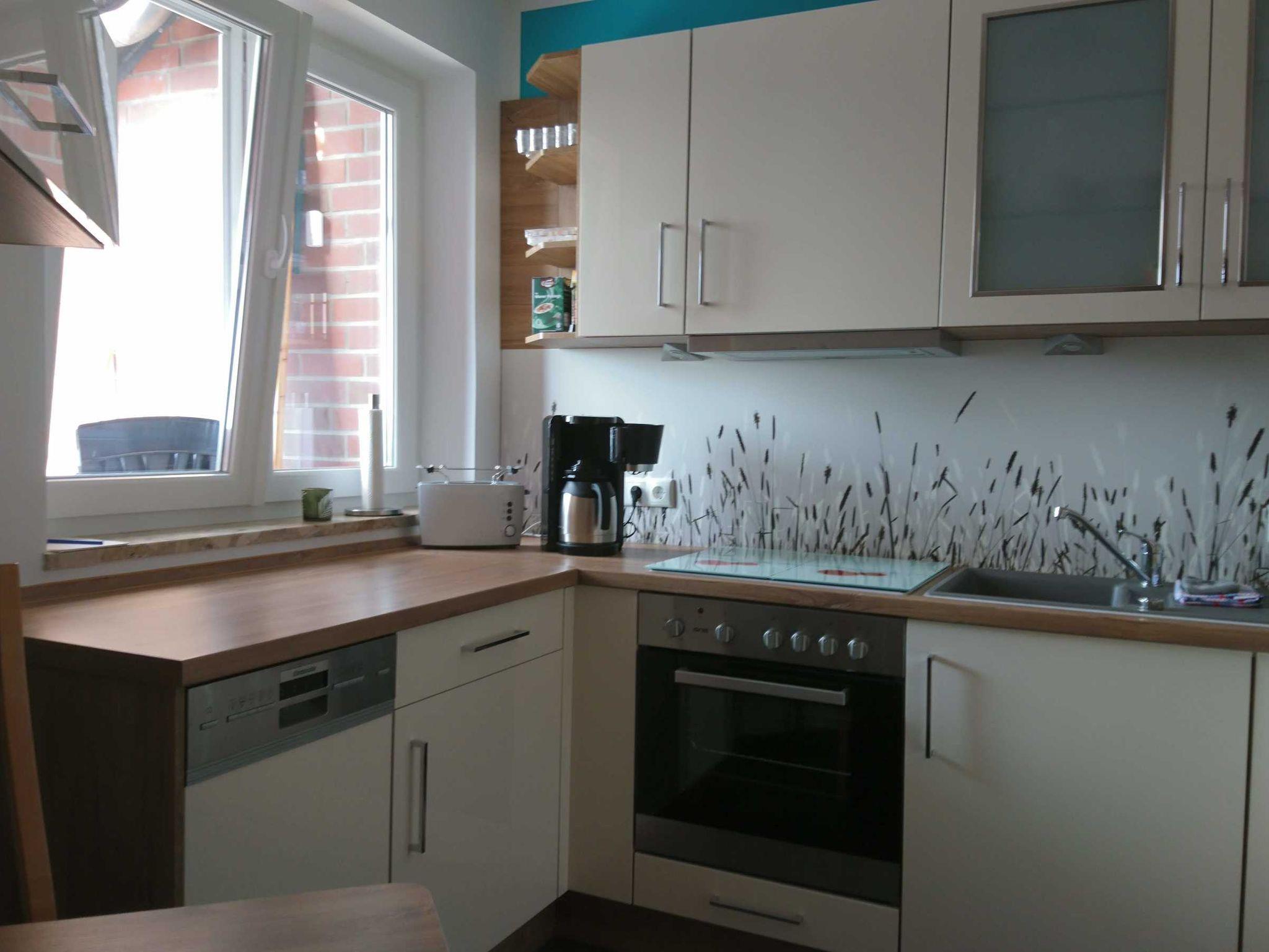 Die Küche ist komplett ausgestattet. Geschirrspüler, Kühlschrank mit Gefrierfach, Ceranfeldherd mit Backofen, Kaffeemaschine und Mikrowelle sind vorhanden.