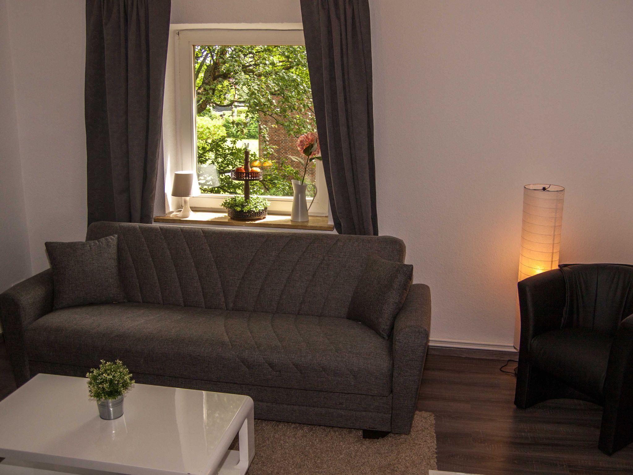 Komplett und modern ausgestattete 60qm große Ferienwohnung mit Küche und Wohnzimmer im jungen Wohnstil im ersten Stock eines Mehrfamilienhauses.