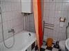 Das Badezimmer ist mit einer Wanne versehen. Ein Schrank unter dem Waschbecken, Spiegelschrank und Handtuchhalter statten das Badezimmer aus.