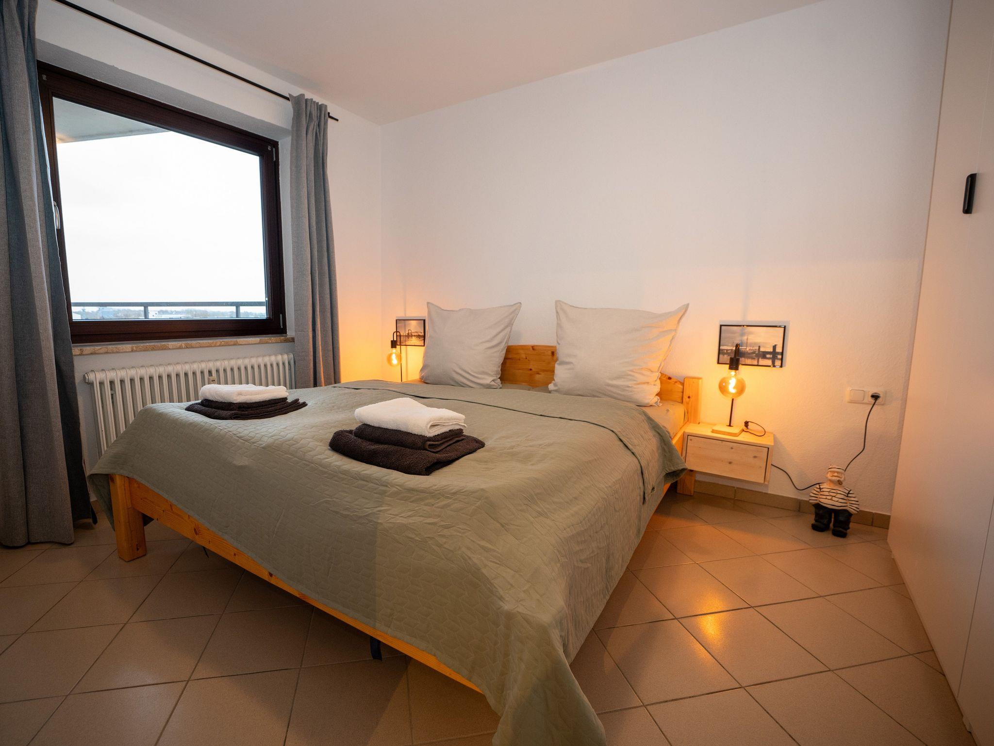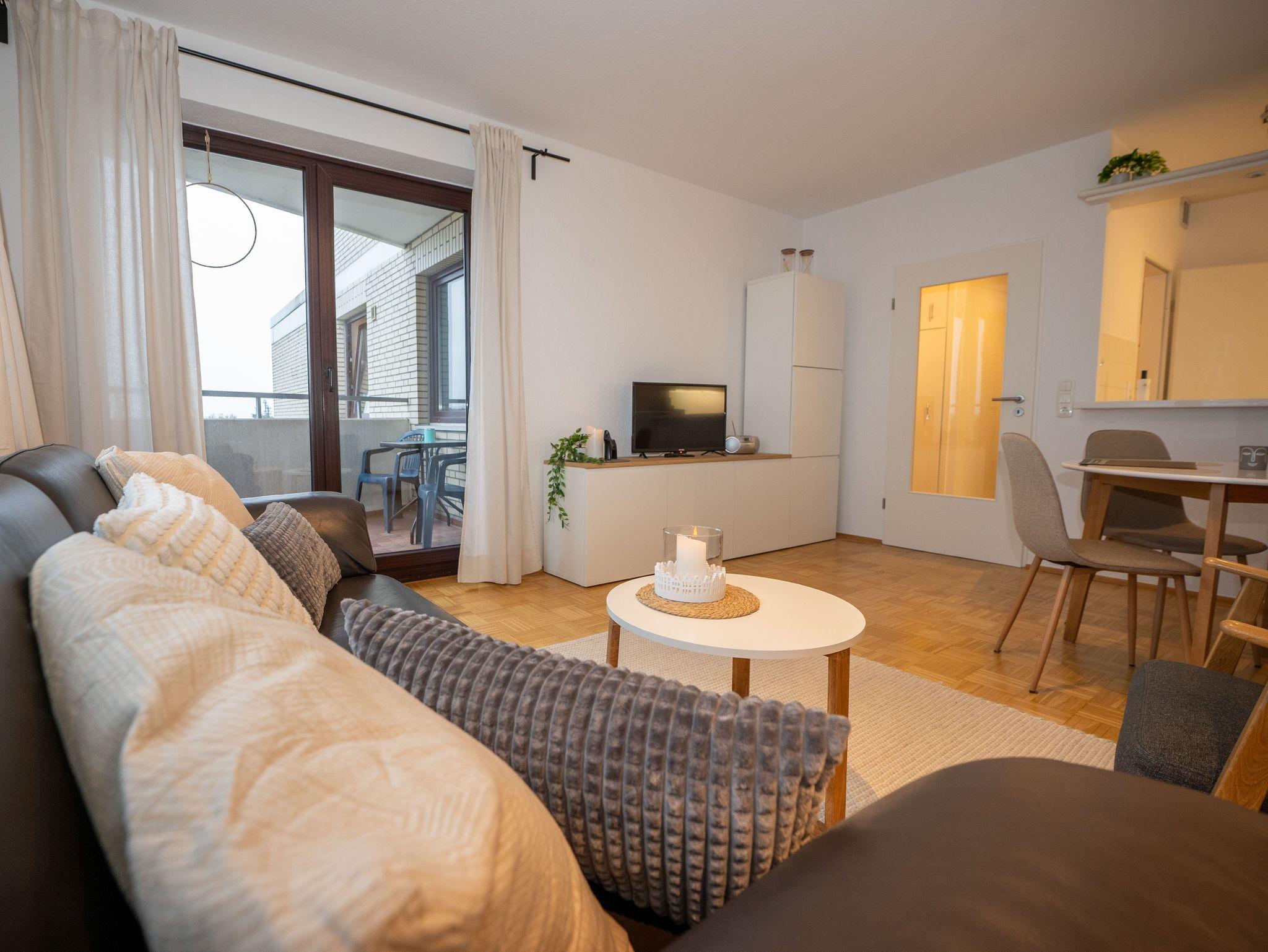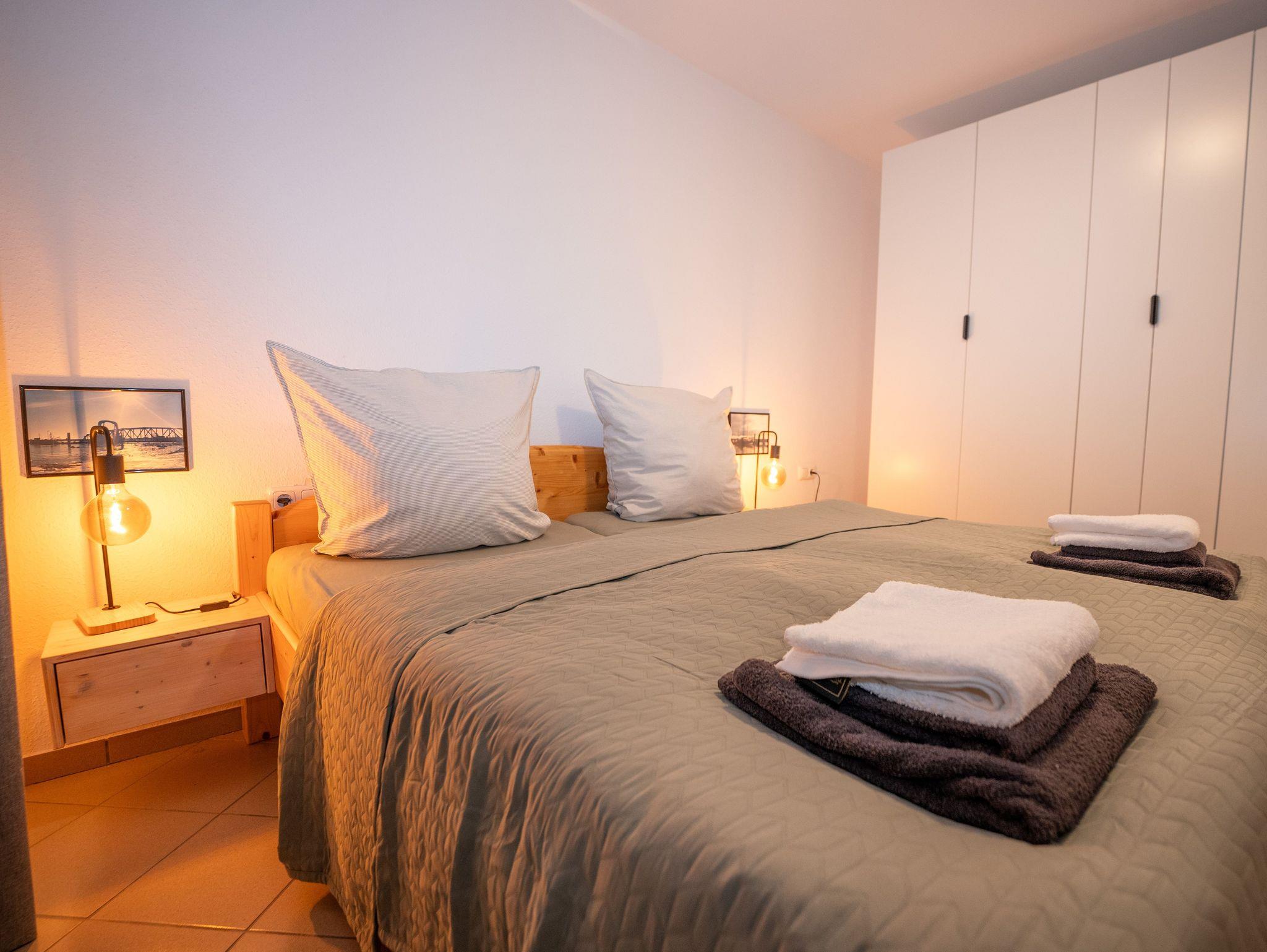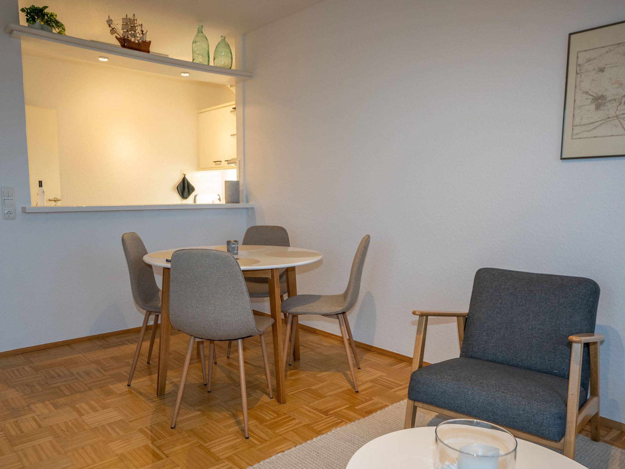 Die Ferienwohnung verfügt über ein Schafzimmer, eine Couch im Wohnzimmer, ein Bad mit WC und Dusche, einem großen Wohnzimmer mit offener, angrenzender Küchenzeile. Ein Balkon, der Frühstücken in der Morgensonne ermöglicht, machen diese gemütliche Wohnung zum perfekten Feriendomizil. Kabel-TV, eine komplett ausgestattete Küche mit Kaffee-Pad-Maschine und einem Geschirrspüler, runden die Ausstattung der Wohnung ab. Kosten für den PKW-Stellplatz, WLAN sowie Handtücher und Bettwäsche sind bereits im Übernachtungspreis enthalten. Die Wohnung ist ebenerdig.