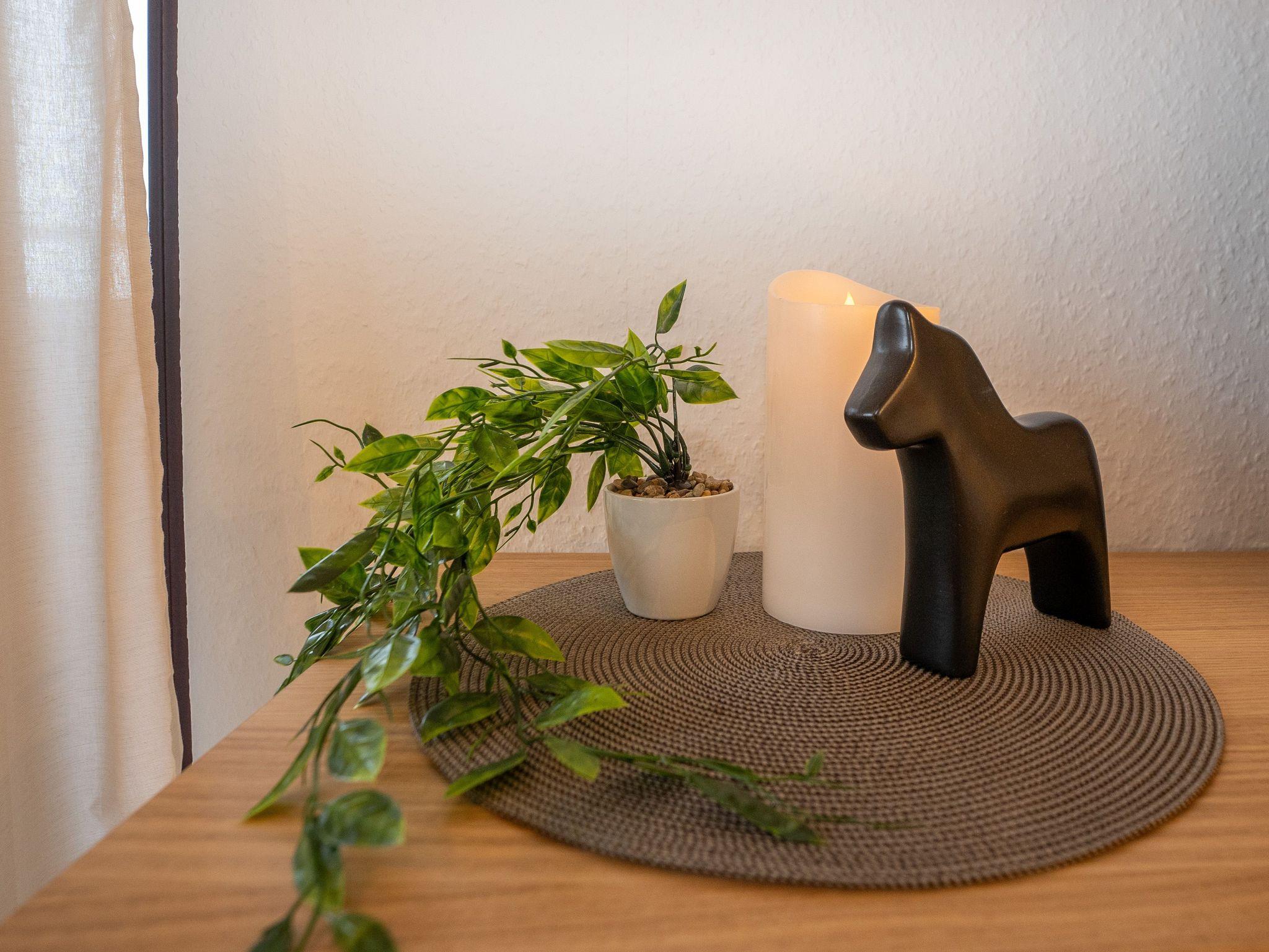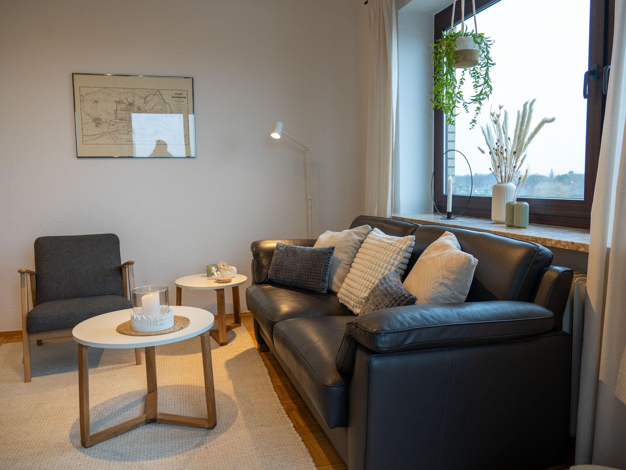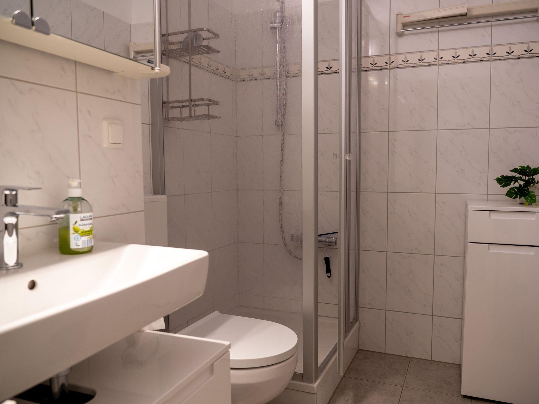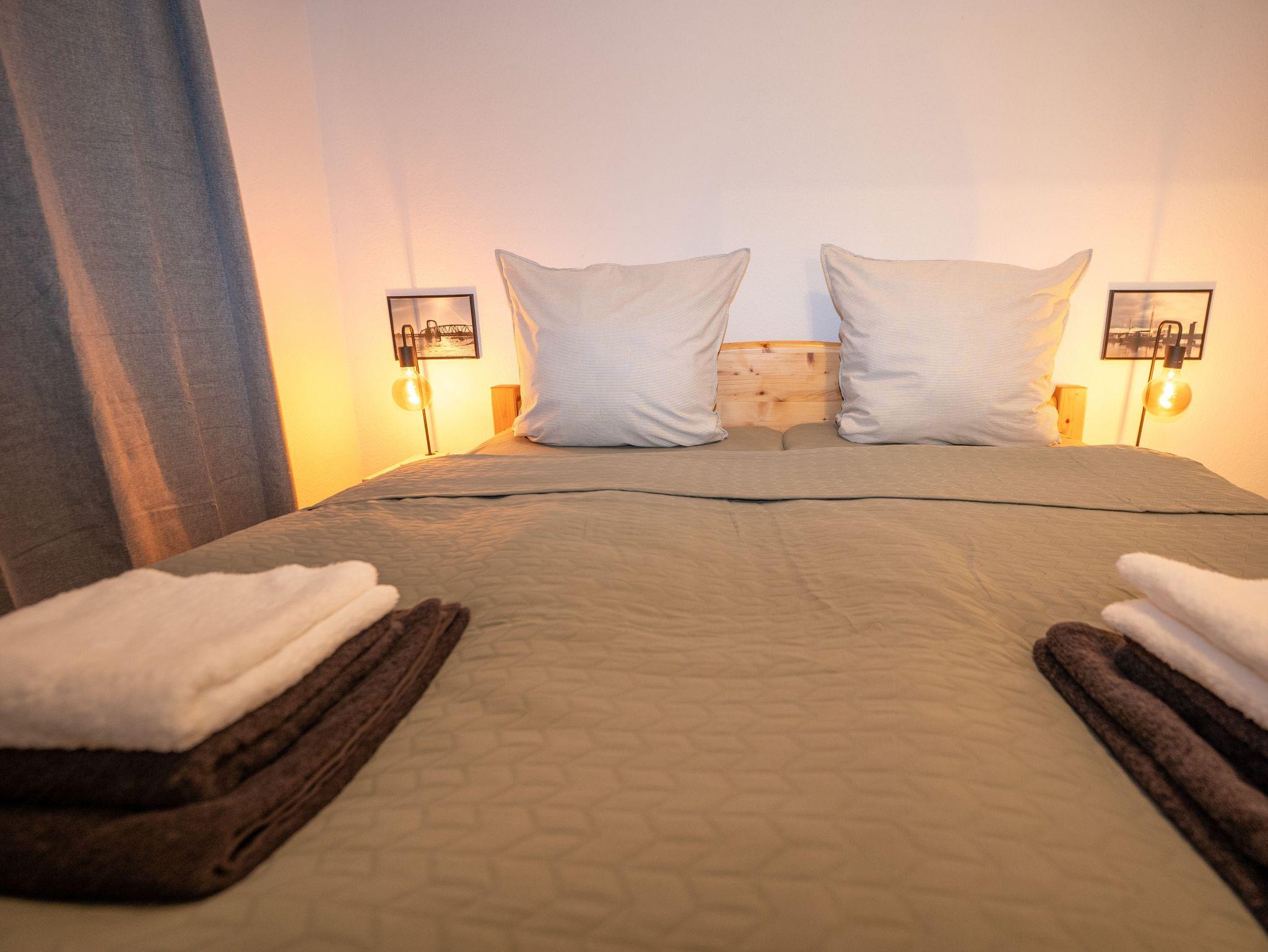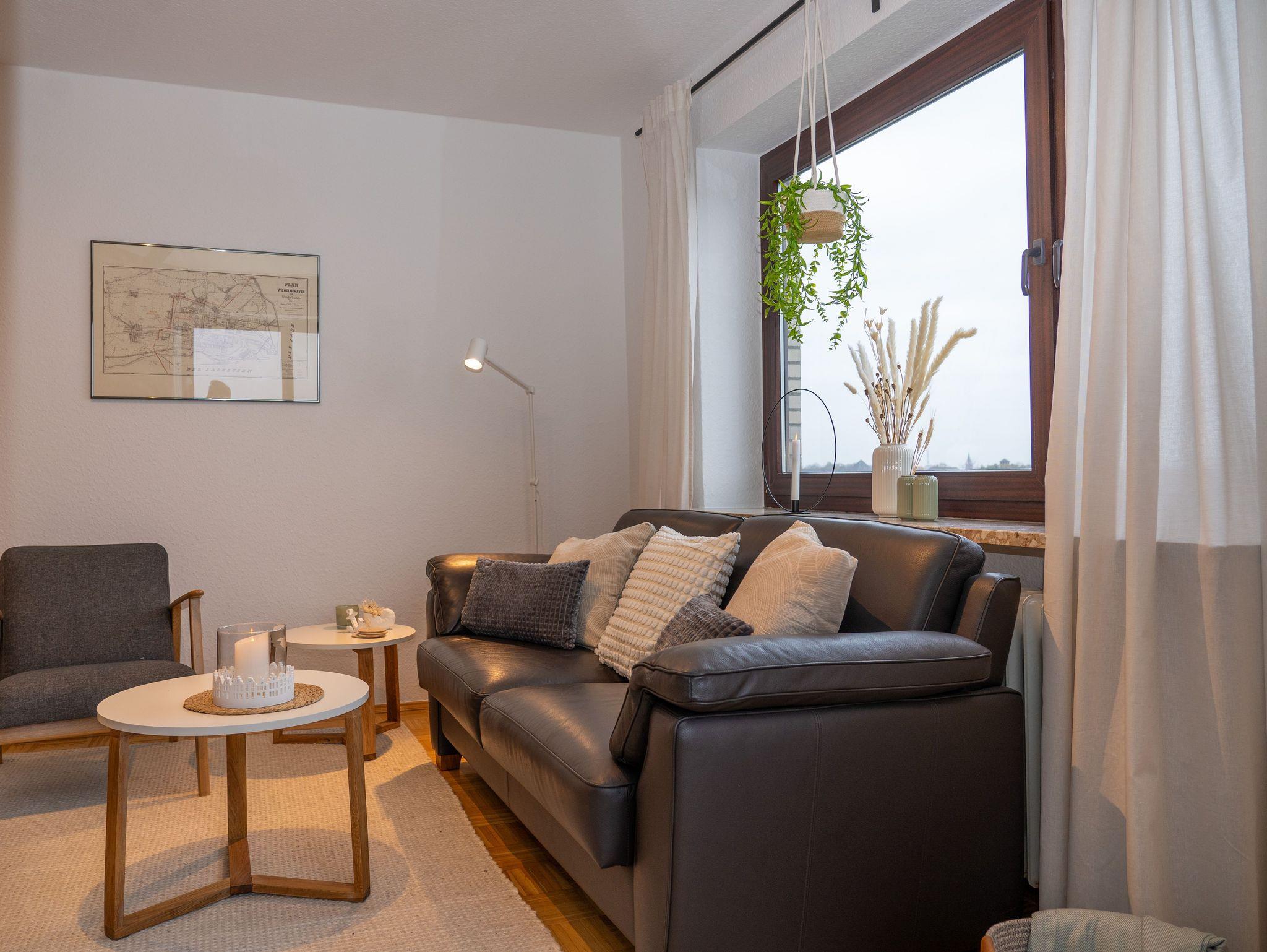 Die Ferienwohnung verfügt über ein Schafzimmer, eine Couch im Wohnzimmer, ein Bad mit WC und Dusche, einem großen Wohnzimmer mit offener, angrenzender Küchenzeile. Ein Balkon, der Frühstücken in der Morgensonne ermöglicht, machen diese gemütliche Wohnung zum perfekten Feriendomizil. Kabel-TV, eine komplett ausgestattete Küche mit Kaffee-Pad-Maschine und einem Geschirrspüler, runden die Ausstattung der Wohnung ab. Kosten für den PKW-Stellplatz, WLAN sowie Handtücher und Bettwäsche sind bereits im Übernachtungspreis enthalten. Die Wohnung ist ebenerdig.