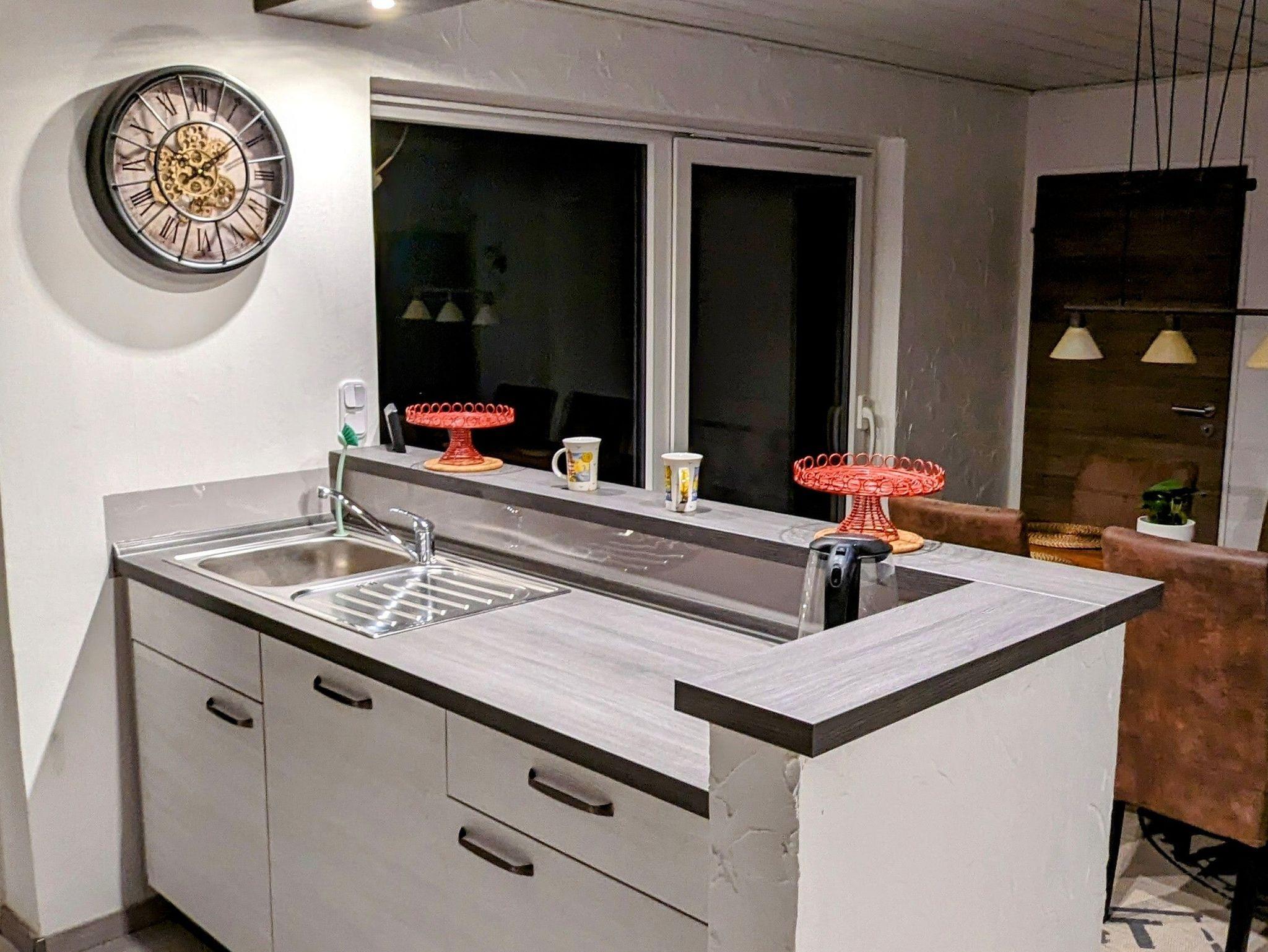 Die Küche ist komplett ausgestattet mit Kaffeemaschine, Wasserkocher, Toaster, Kühlschrank und Mikrowelle.