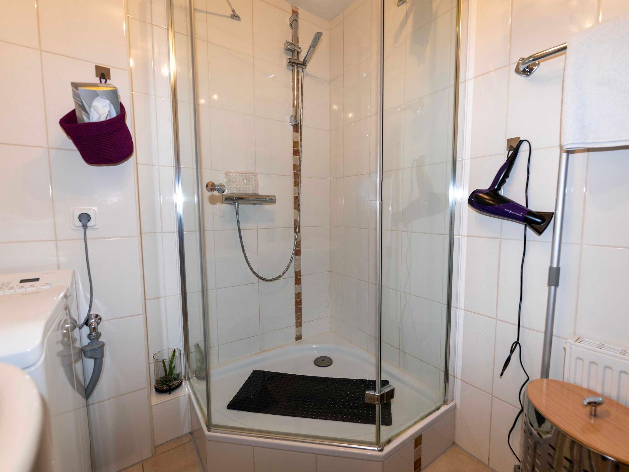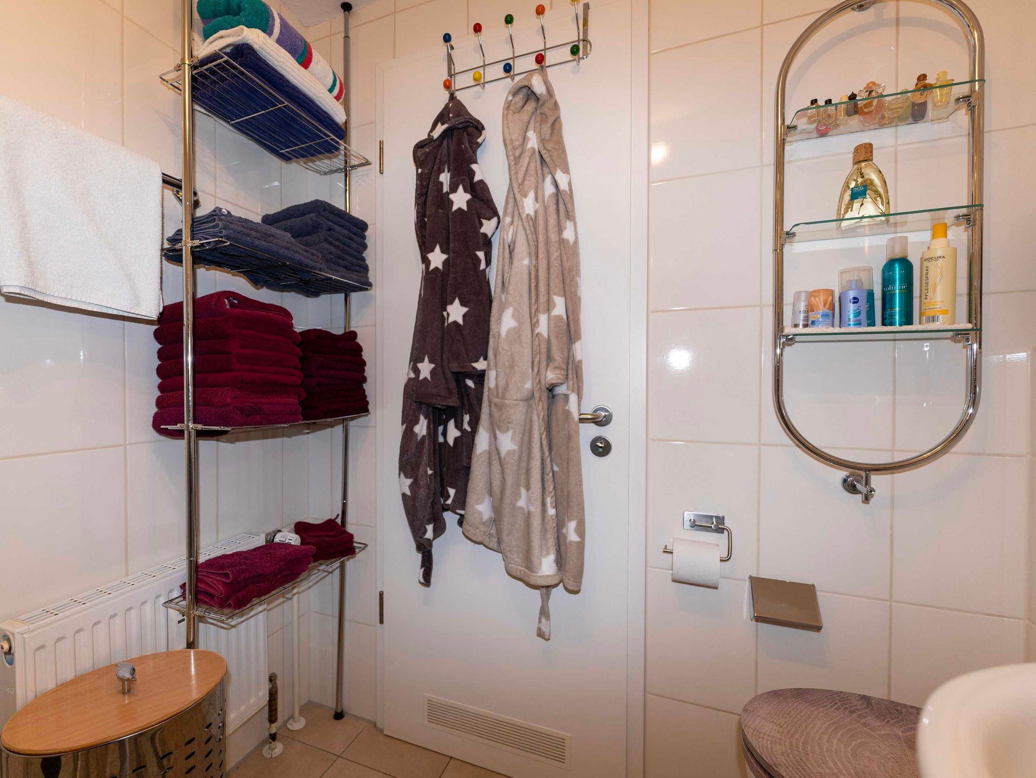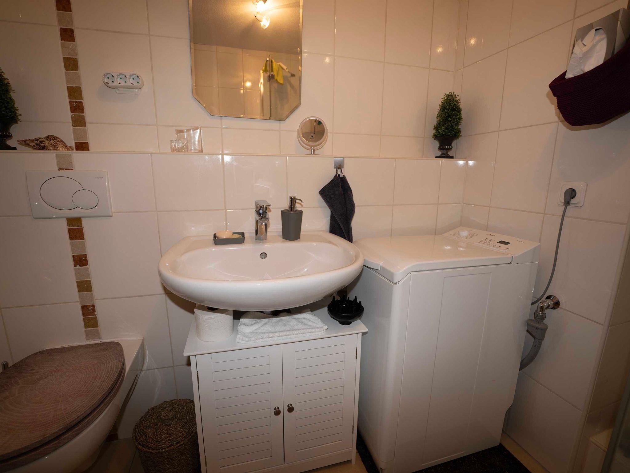 Auch das Bad ist gut ausgestattet. Eine kleine Waschmaschine, ein Fön und 2 Bademäntel sind hier zu finden.