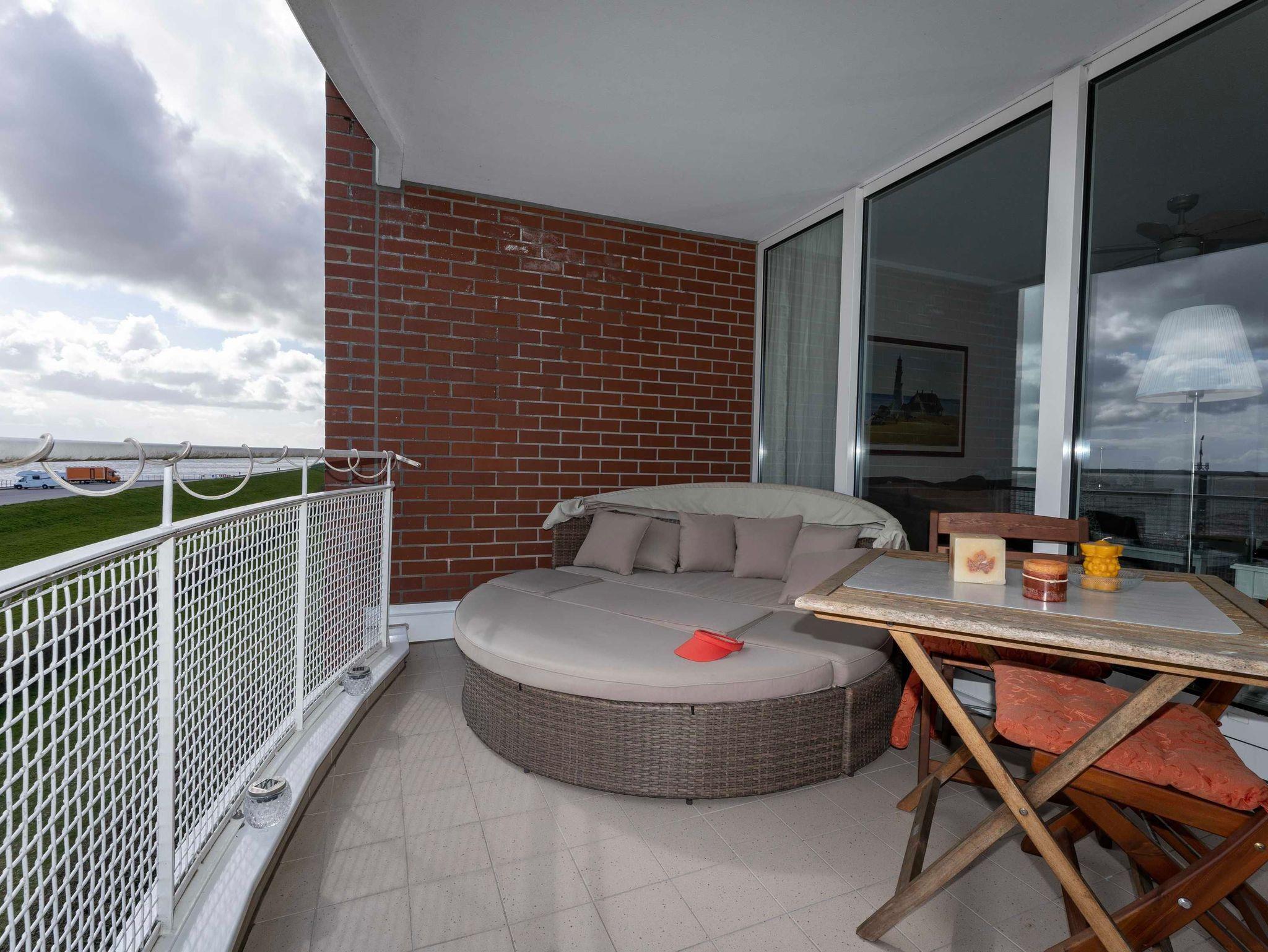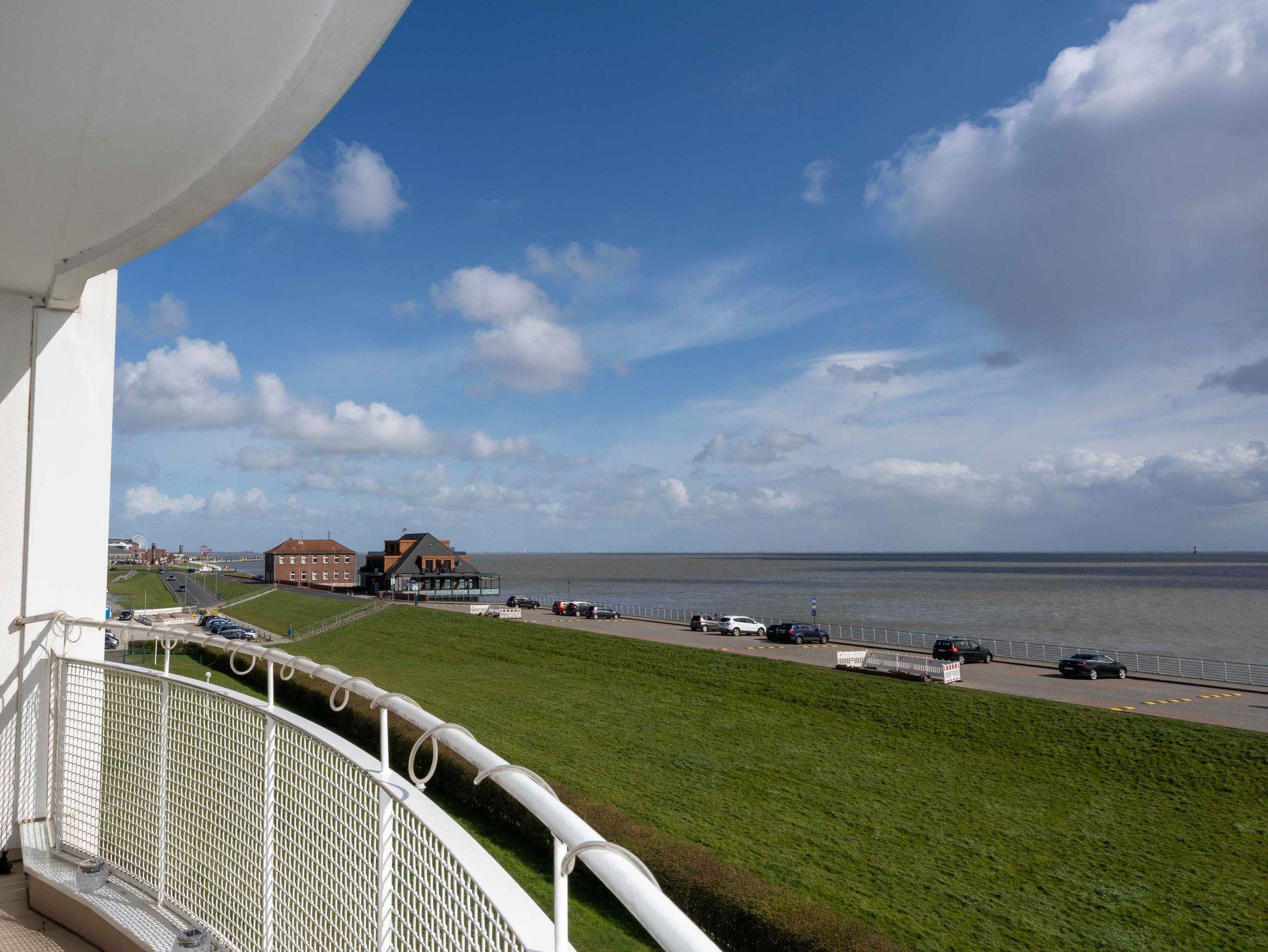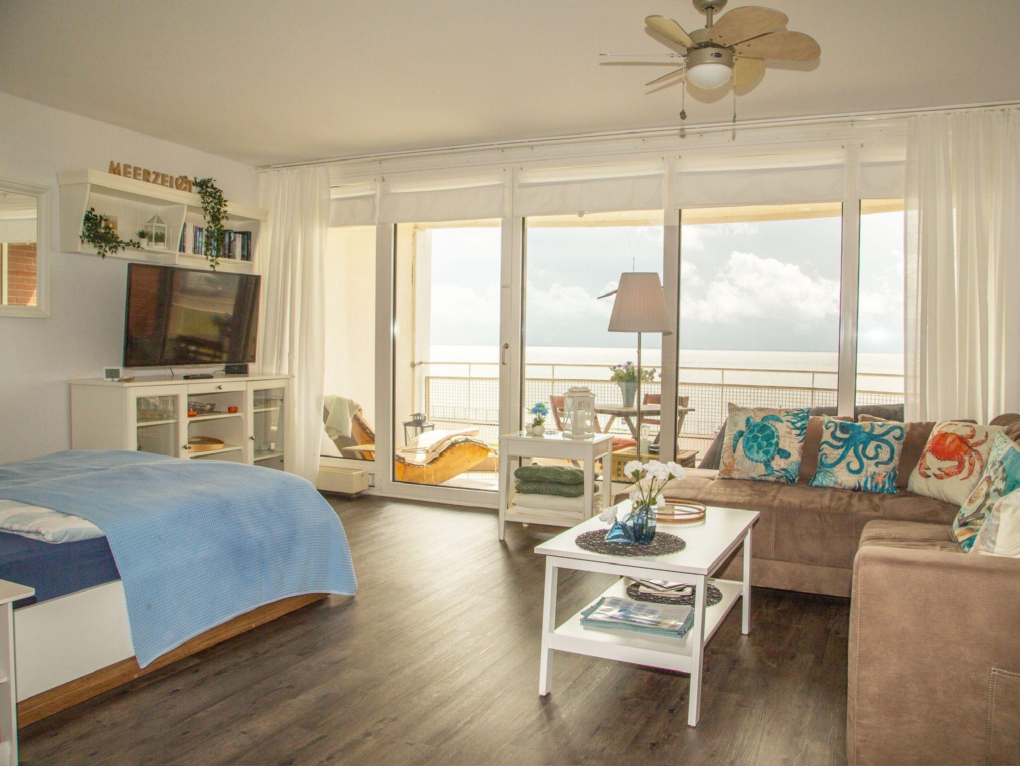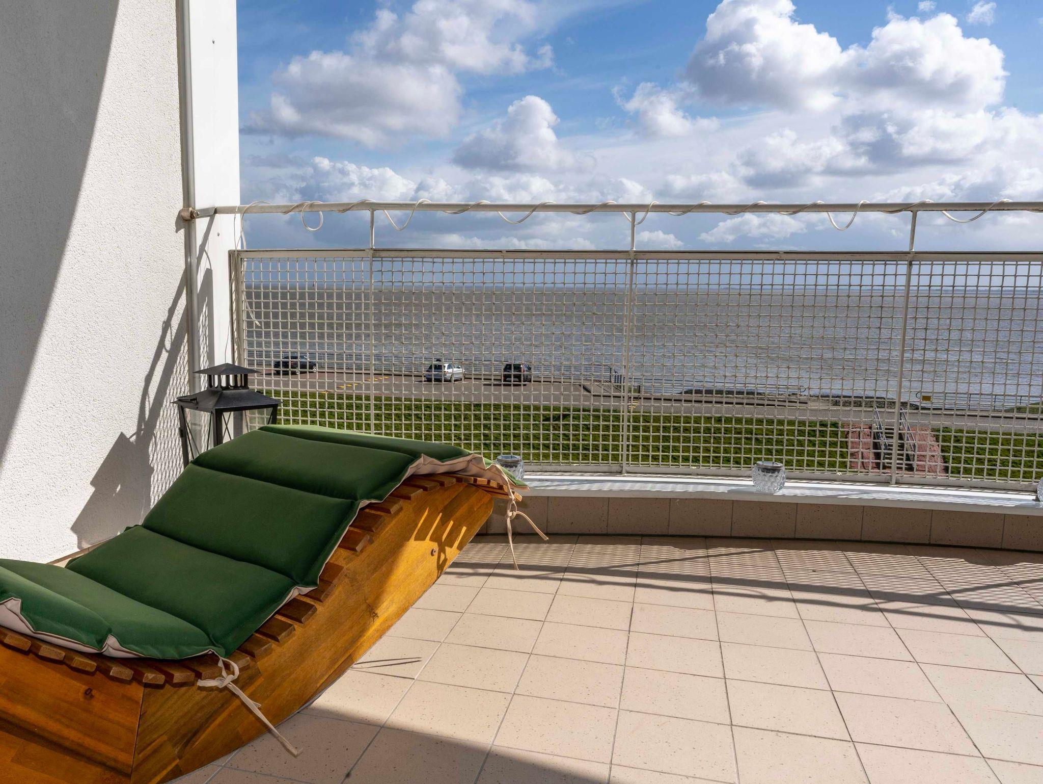 Lichtdurchflutet mit phantastischem Meerblick - das 1 Zimmer-Apartment Meerzeit im 4. OG des Helgolandhauses lädt Sie ein zu einer Auszeit am Meer. Genießen Sie die Nordsee hautnah. Der große, überdachte Südbalkon bietet Ihnen einen weiten Blick über den Jadebusen. Gemütliche Terrassenmöbel laden zum Verweilen ein.