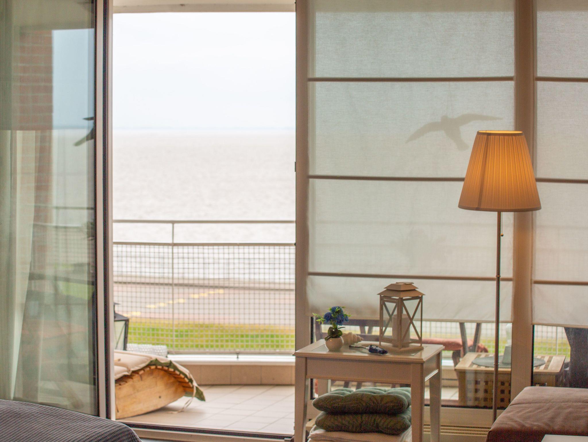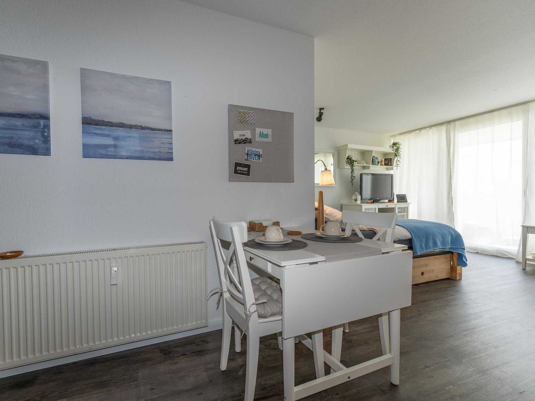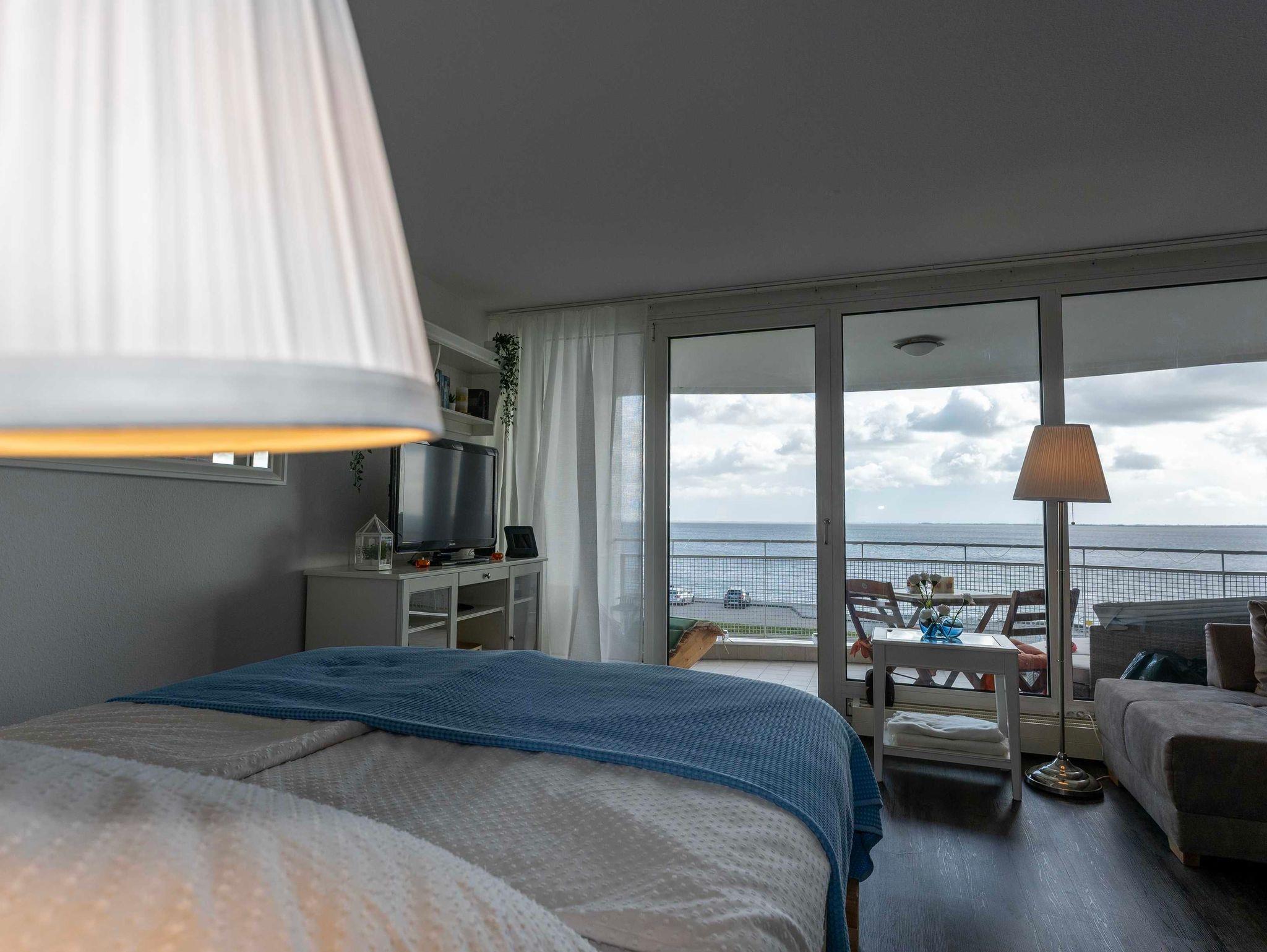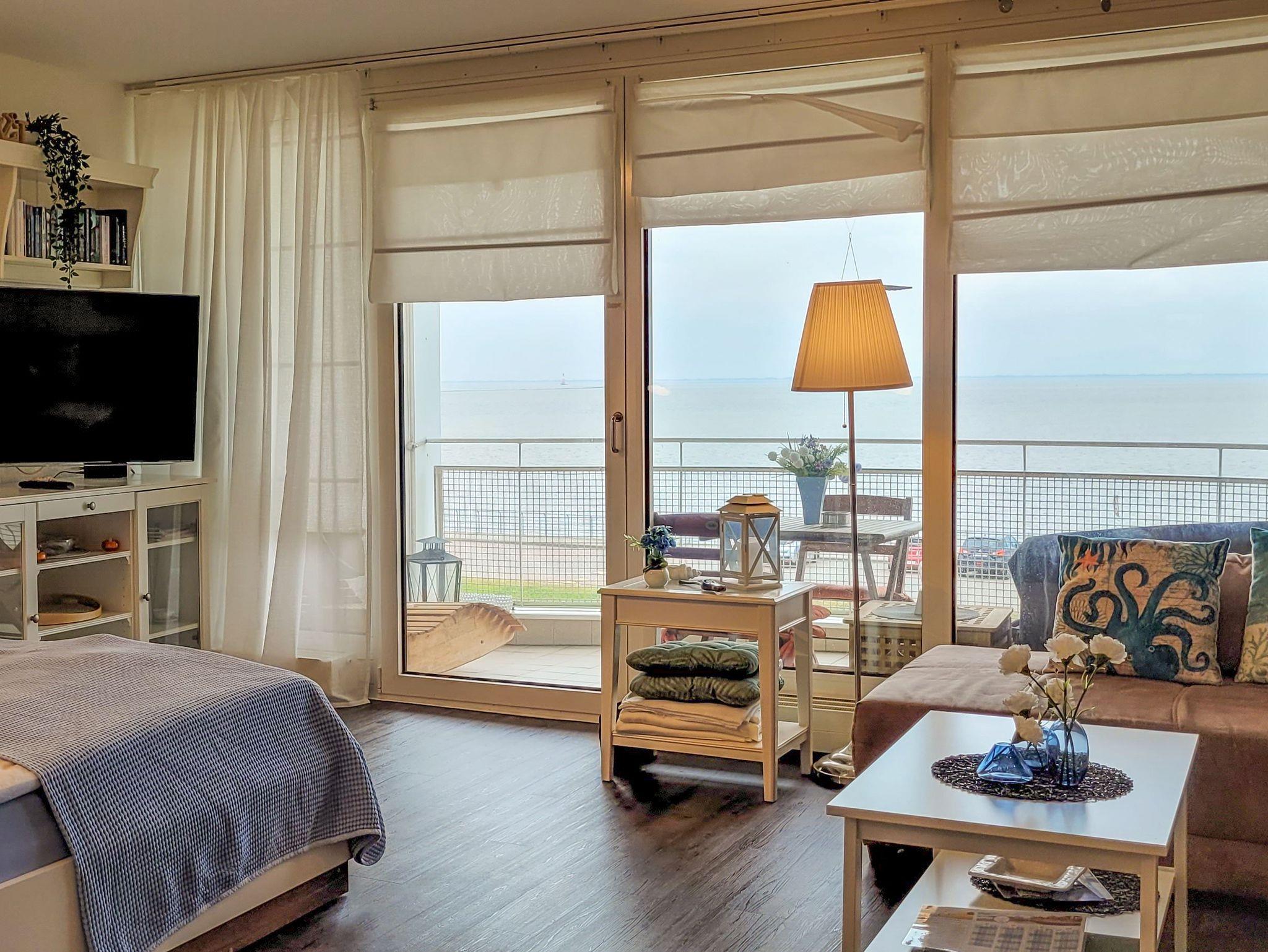 Lichtdurchflutet mit phantastischem Meerblick - das 1 Zimmer-Apartment Meerzeit im 4. OG des Helgolandhauses lädt Sie ein zu einer Auszeit am Meer. Genießen Sie die Nordsee hautnah. Der große, überdachte Südbalkon bietet Ihnen einen weiten Blick über den Jadebusen. Gemütliche Terrassenmöbel laden zum Verweilen ein.