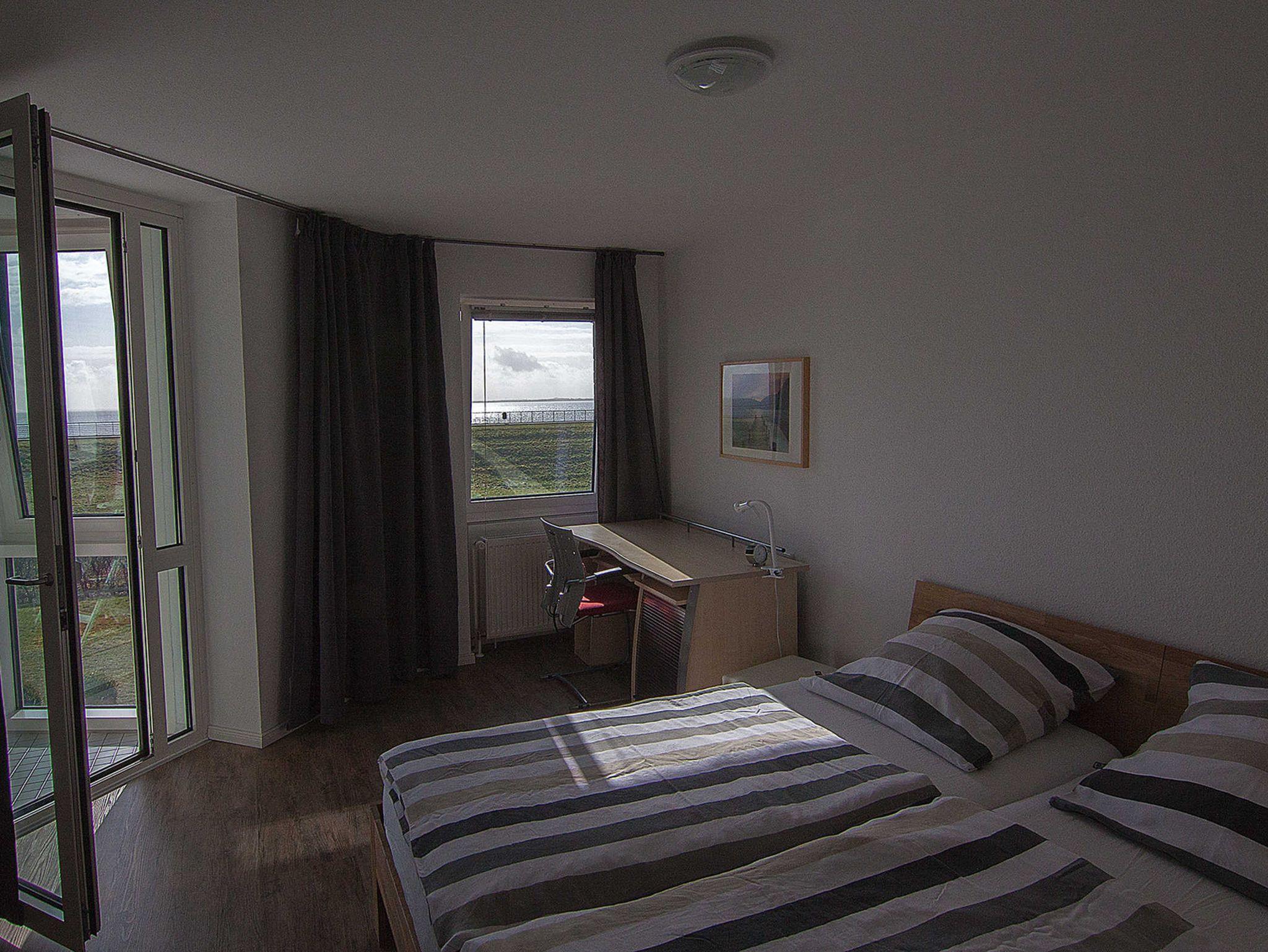 Das schön ausgestattete Schlafzimmer mit Blick auf die Nordsee und Zugang zum Wintergarten beherbergt am Fenster noch einen Schreibtischplatz. WLAN ist verfügbar.