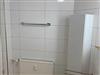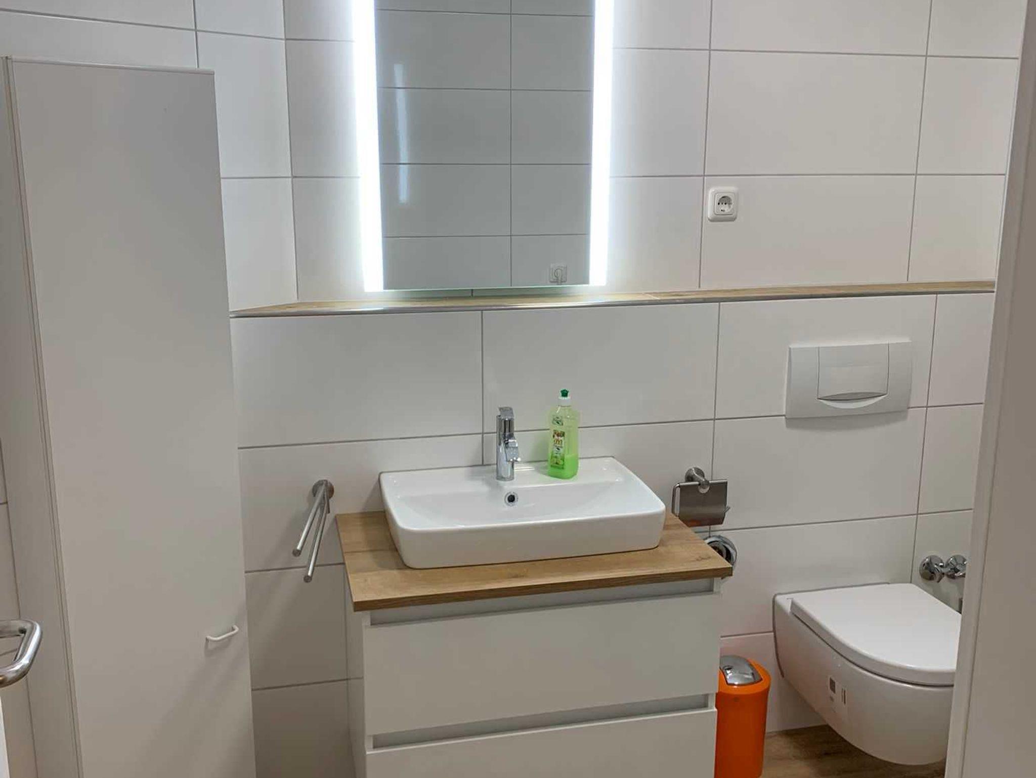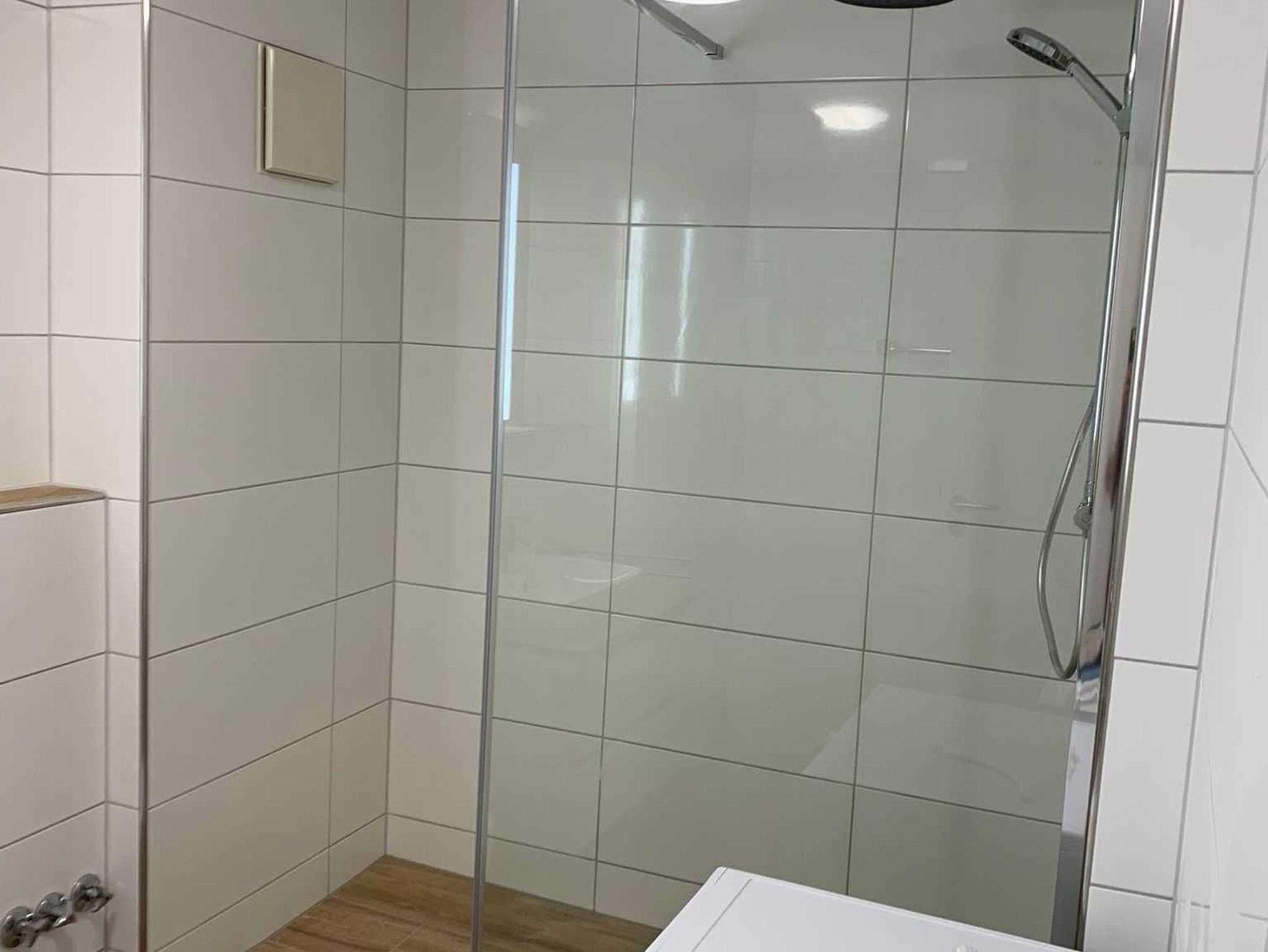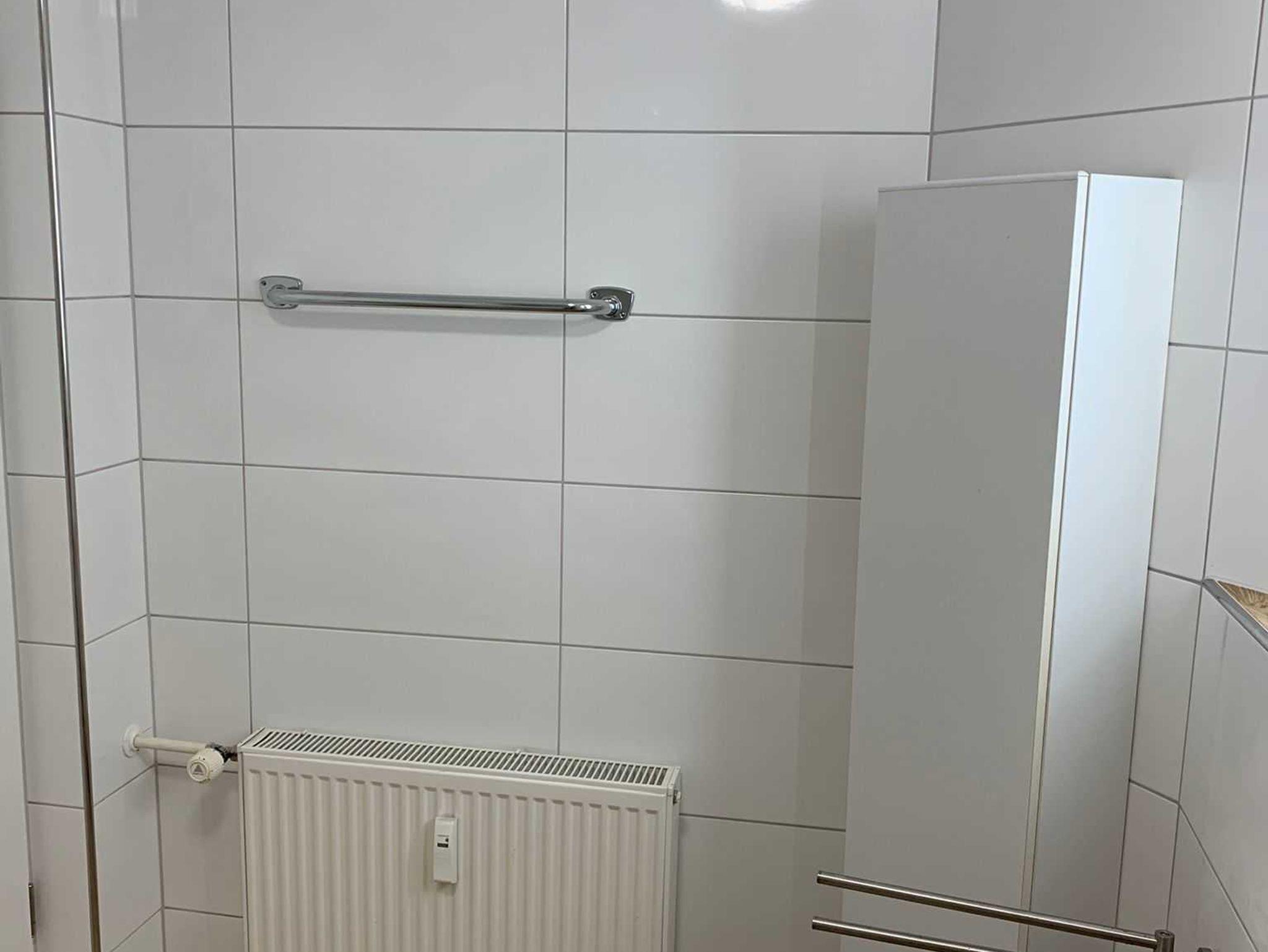 Das helle Bad mit Dusche ist großzügig geschnitten. Für den Gast liegt ein Fön und Handtücher bereit.