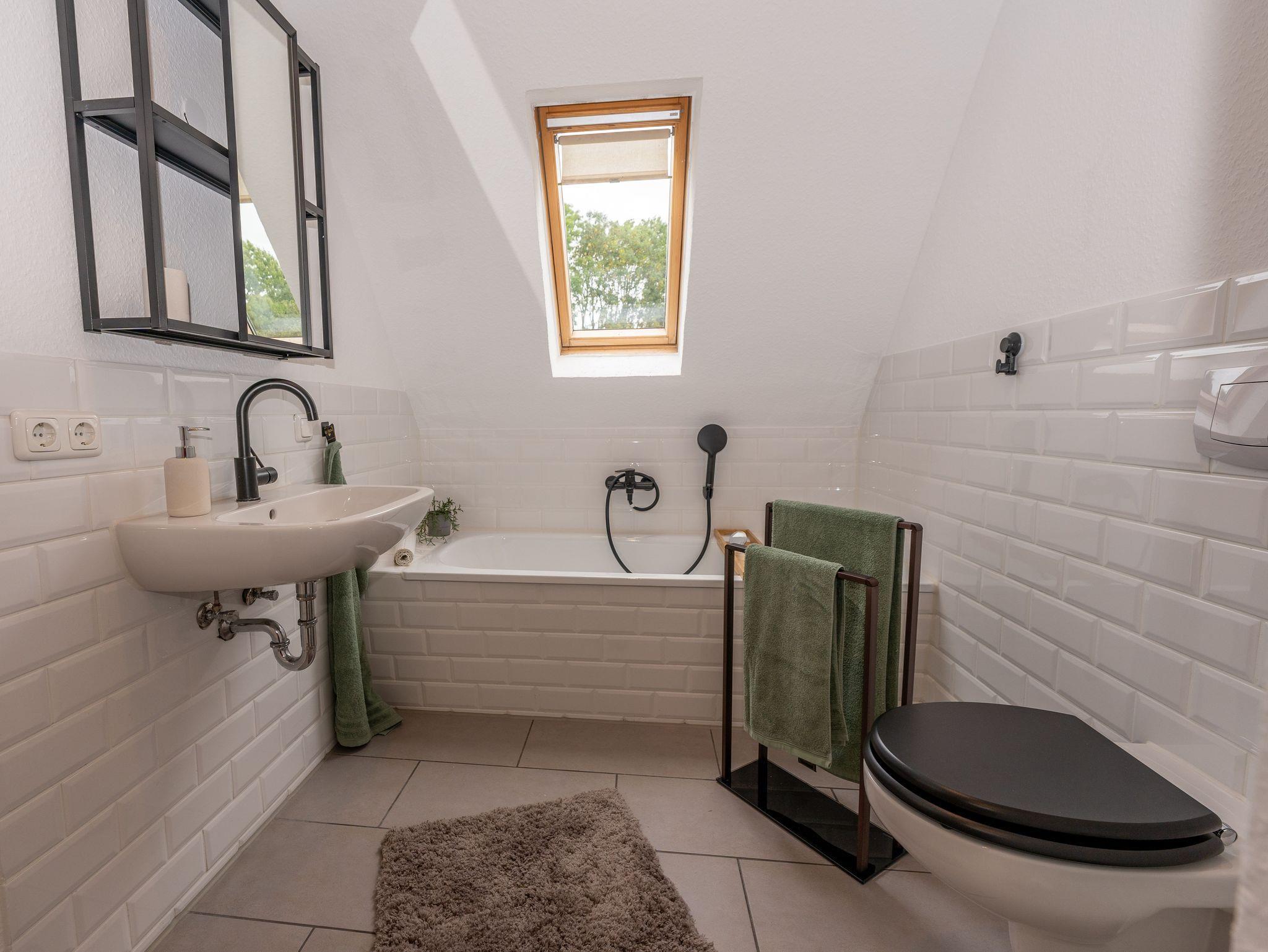 Weiterhin befindet sich im ersten Stock ein modernes Badezimmer mit Badewanne, Dusche und WC.