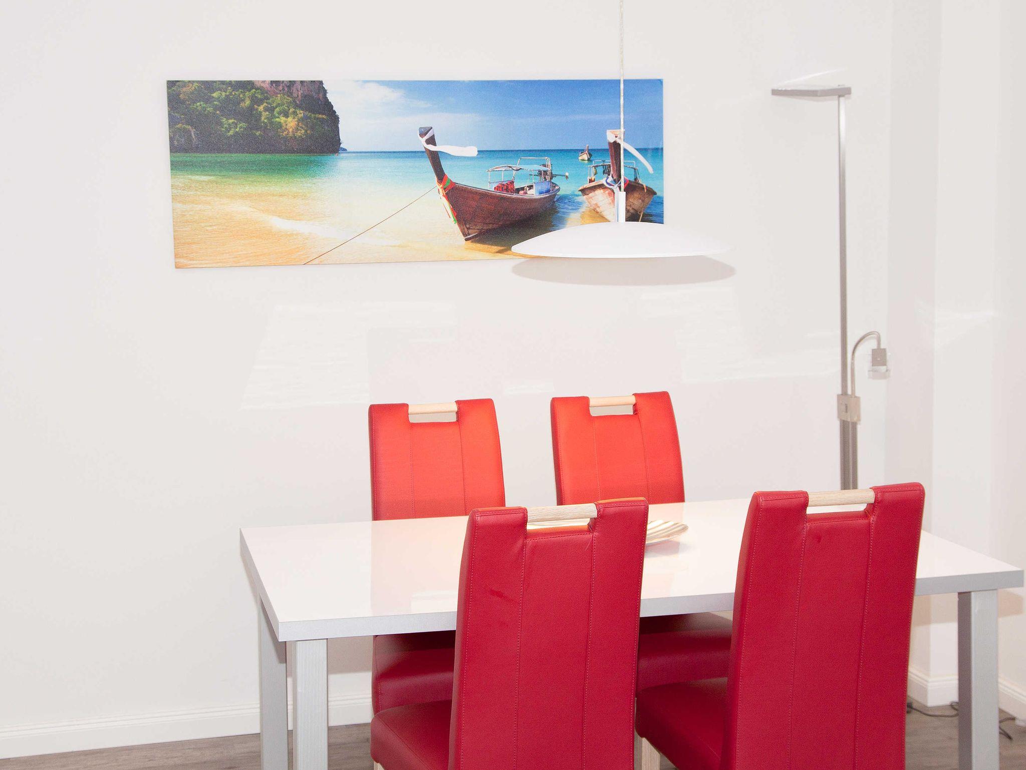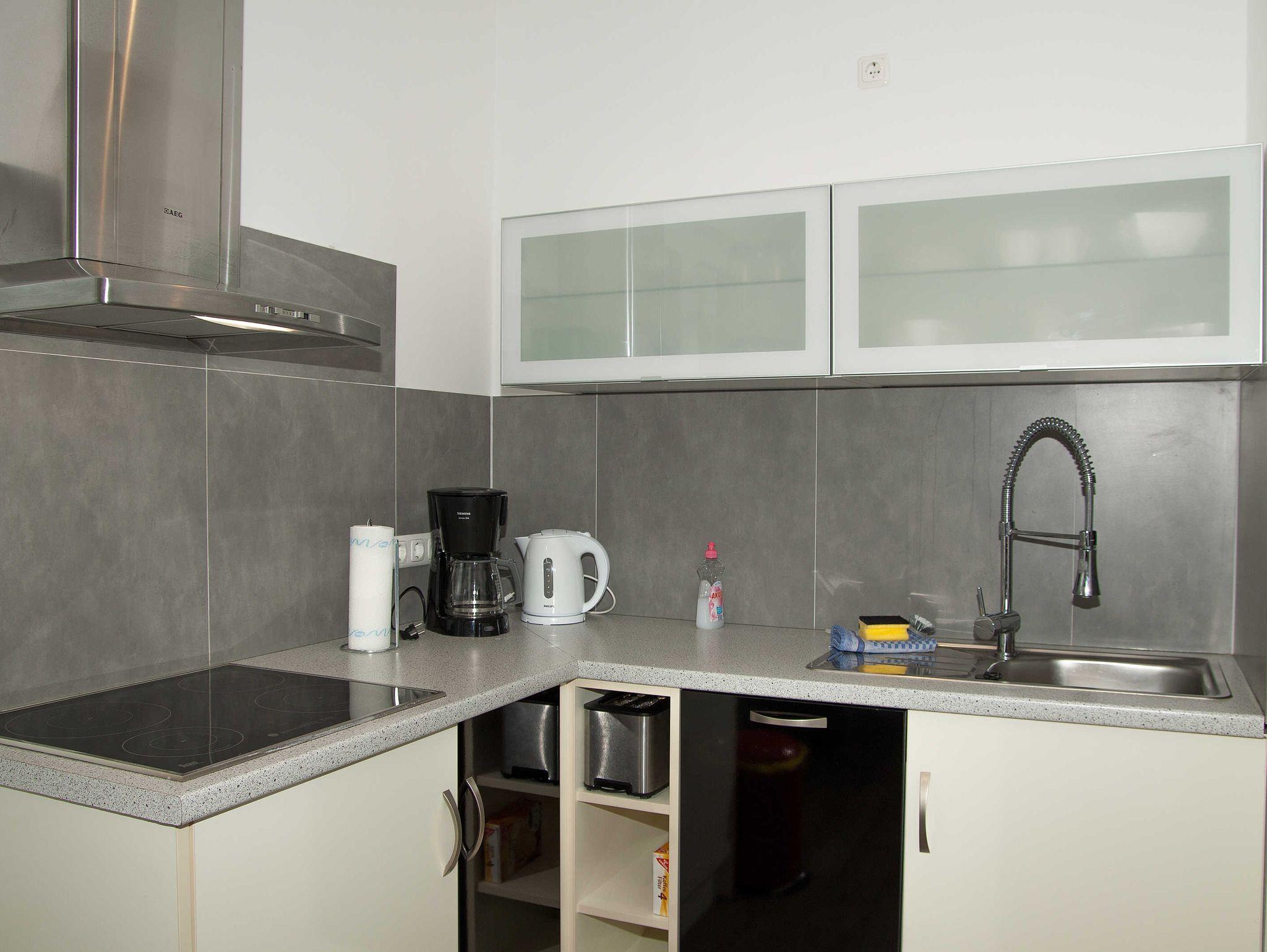 Die moderne Ausstattung der Wohnung, zwei Schlafzimmer, ein Küche mit allen wichtigen Utensilien, d.h. Microwelle, Toaster, Kaffeemaschine, Ceranfeld und großem Kühlschrank, das moderne Bad mit Dusche, lässt diese Wohnung zu einer idealen Verweilort werden, sei es für Feriengäste oder Geschäftsleute.