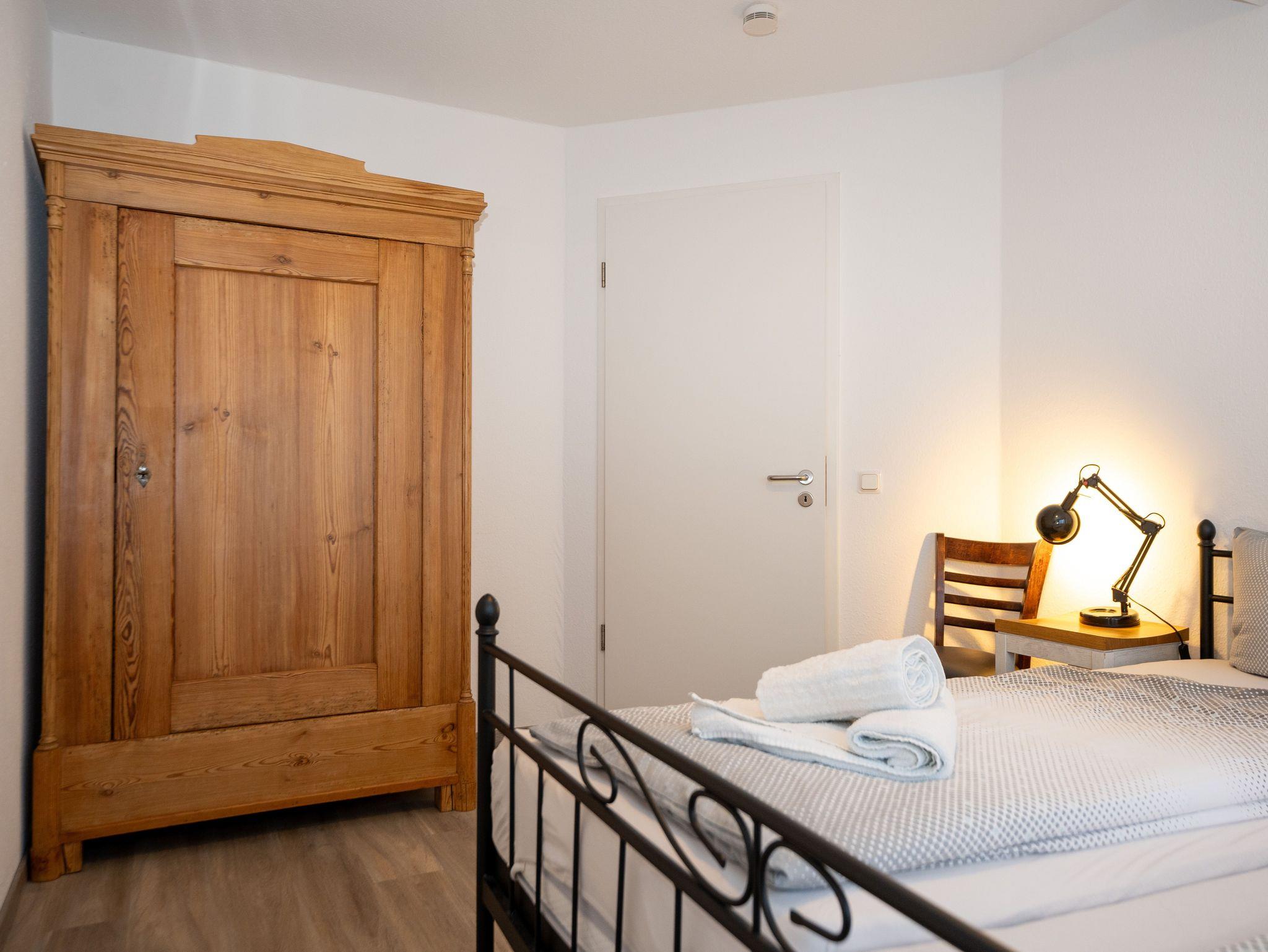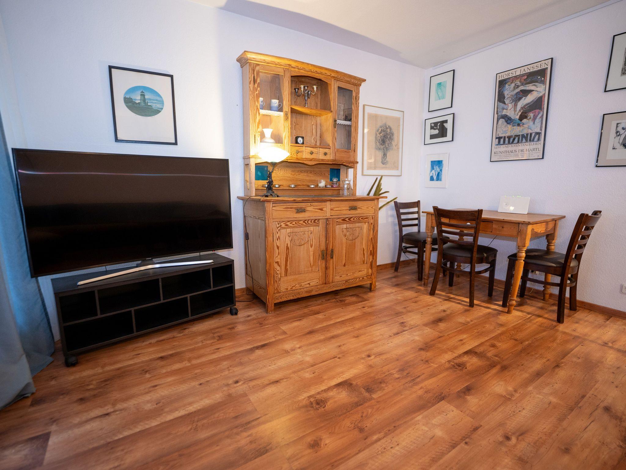 Im Erdgeschoß befindet sich der offene Wohn-/Eßbereich, ein Bad mit Dusche, die überdachte Terasse, mit Blick auf den maritimen Yachthafen und direkten Zugang zum Südstrand. Im 1. Obergeschoß befinden sich zwei Schlafzimmer. Das größere ist mit einem Doppelbett ausgestattet, das kleinere mit einem hochwertigem Schlafsofa. Beide Zimmer mit Blick auf den Binnenhafen. Hier befindet sich ebenfalls das zweite Bad mit Badewanne. Die Wohnung verfügt über einen eigenen PKW-Stellplatz. WLAN sowie ein urgemütlicher Strandkorb auf der Terrasse gehören ebenfalls zur hochwertigen Ausstattung dieser Ferienwohnung.