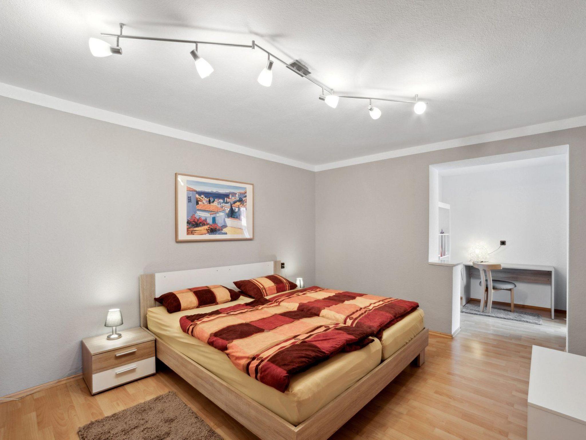 Comfortable double bed (1.80 × 2.00 m) with new mattress, large wardrobe, two bedside tables and a desk/reading corner.
