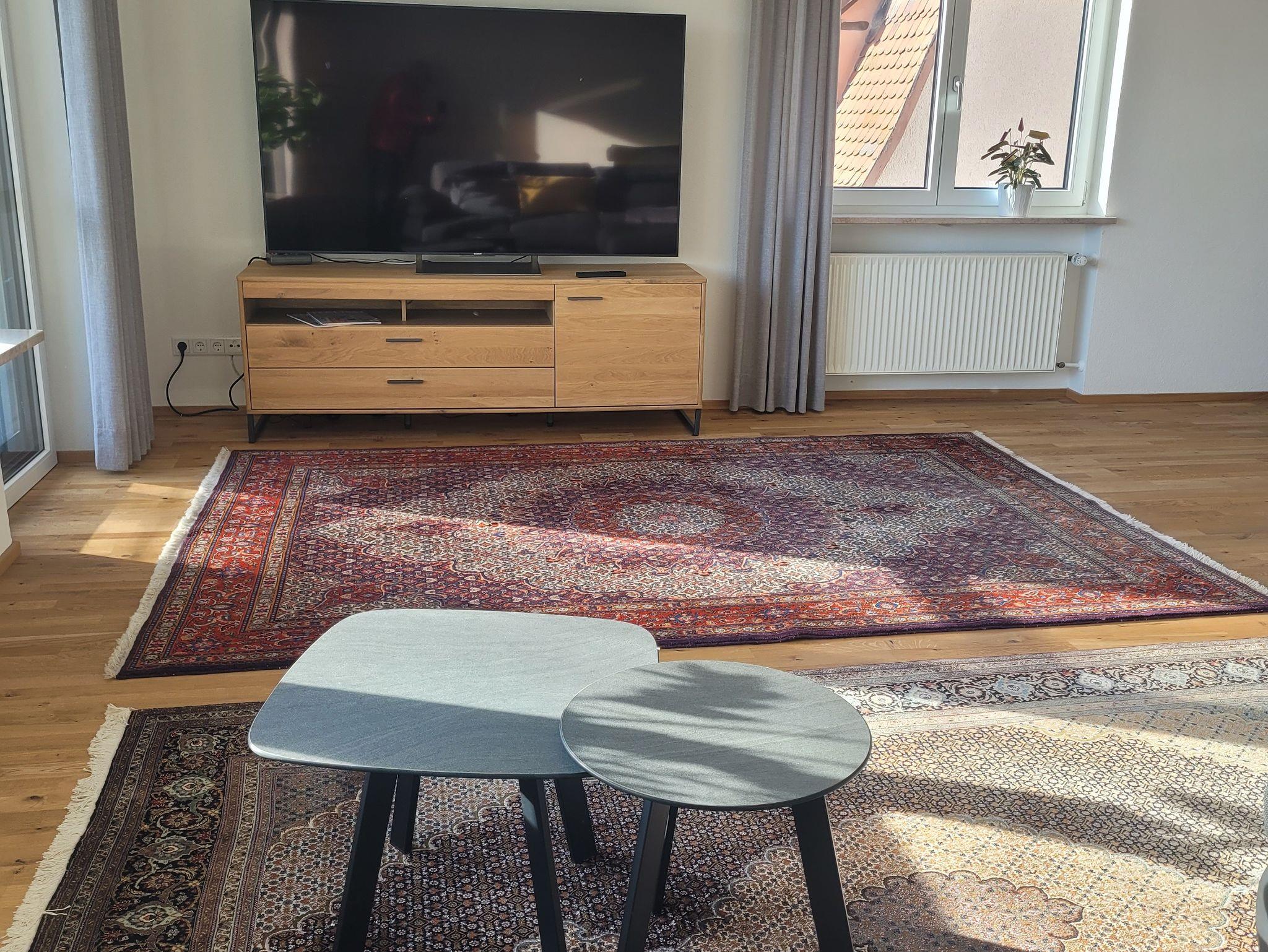 Eine72pm große Wohnung. neues Bad, Parkettboden, Küchenzeile, E-Herd , mit Wasserkocher, Toaster Kaffee Maschine ,Kühlschrank, Gefrierfach ,Geschirrspüler, Bügeleisen, Bügelbrett, Handtuch 75 Zoll Fernseher, modernes Schlafsofa, 2 Balkone, Boxspringbett. Die Wohnung bietet somit jeden Komfort, so auch einen täglichen Handtuchwechsel. Die Wohnung bietet Platz für 4 Personen, mit einem Schlafzimmer für zwei Personen in der Wohnung. Zwei weitere Personen können entweder auf dem Schlafsofa im Wohnzimmer nächtigen, oder in einem separaten Schlafzimmer auf der anderen Seite des Hausflures, der nur von Ihnen genutzt wird, außerhalb der Wohnung. Auf Anfrage können gegen Aufpreis auch zwei zusätzliche Personen mit buchen, so dass das Schlafsofa und das zusätzliche Schlafzimmer mitgenutzt werden.