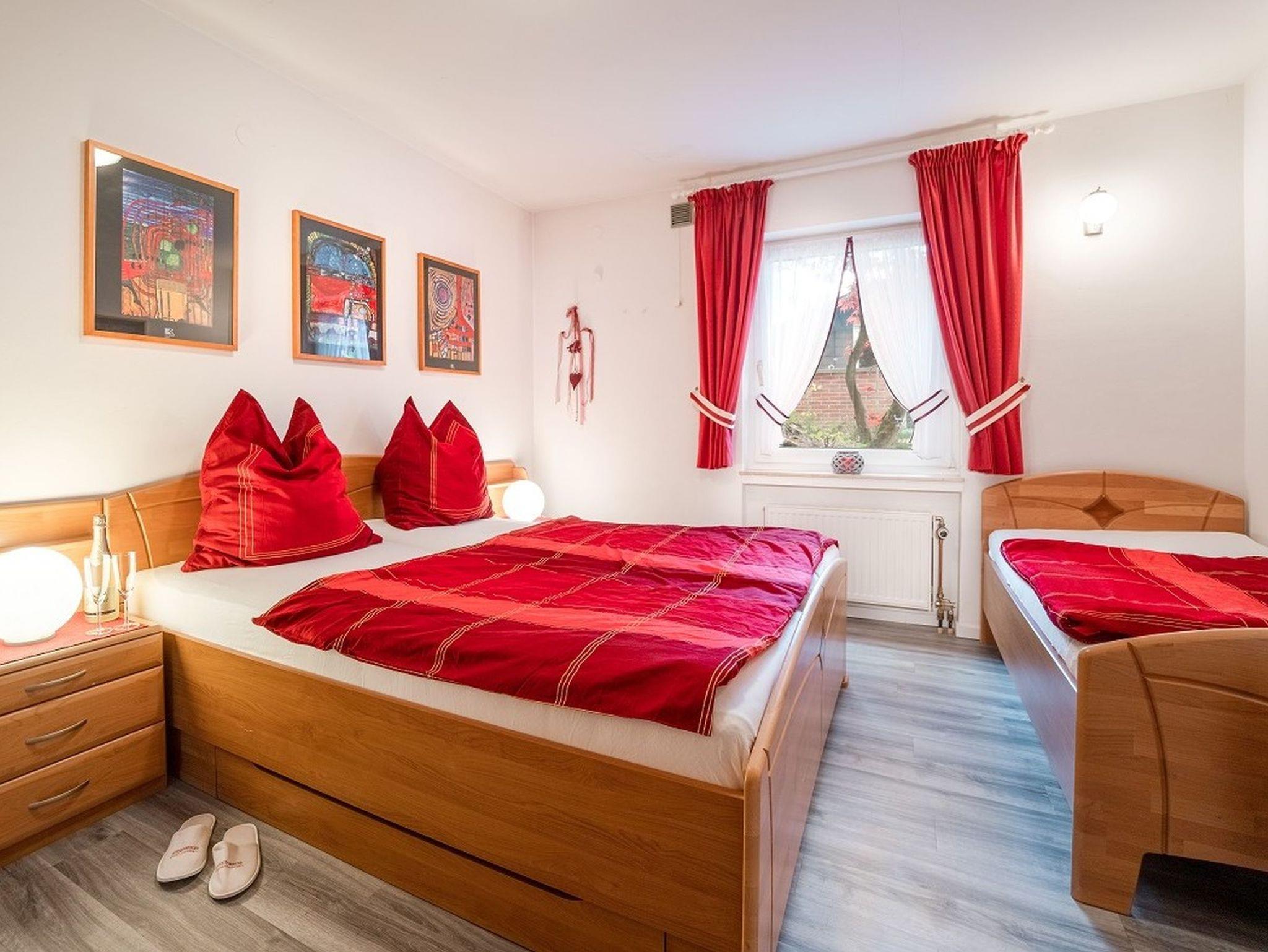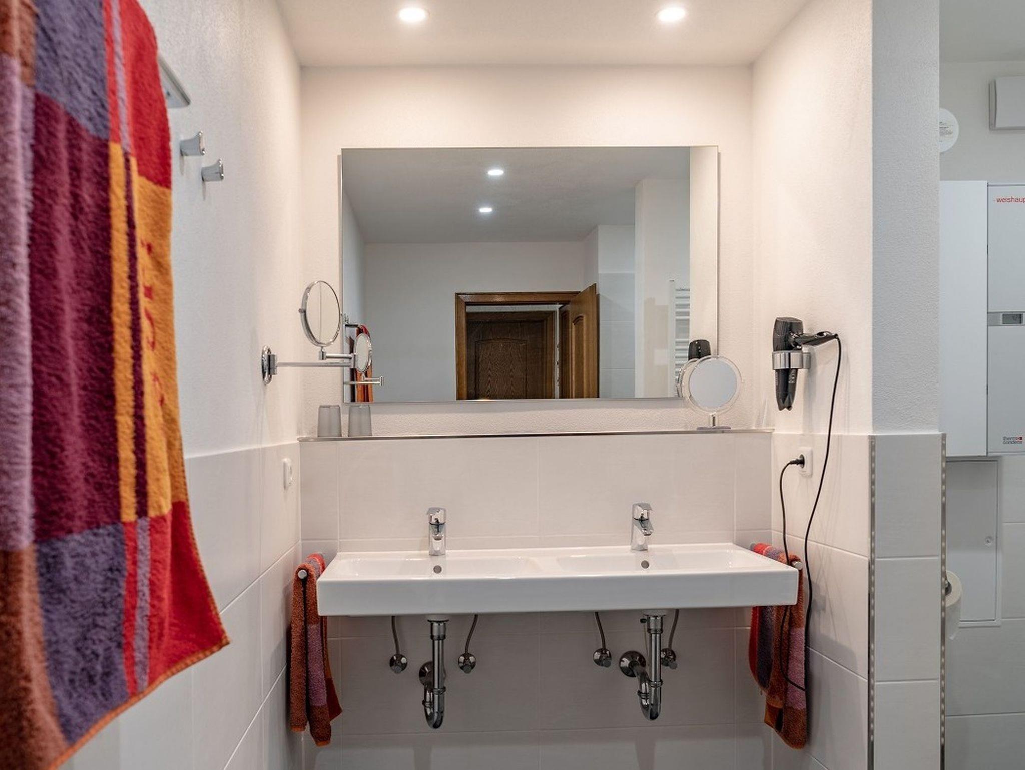 Des Weiteren verfügt die Ferienwohnung über ein Schlafzimmer mit Doppelbett und weiteres ein Schlafzimmer mit einem Doppelbett und einem Einzelbett sowie einem Badezimmer mit Doppelwaschdecken und Dusche. Ein Föhn liegt natürlich schon für Sie bereit.