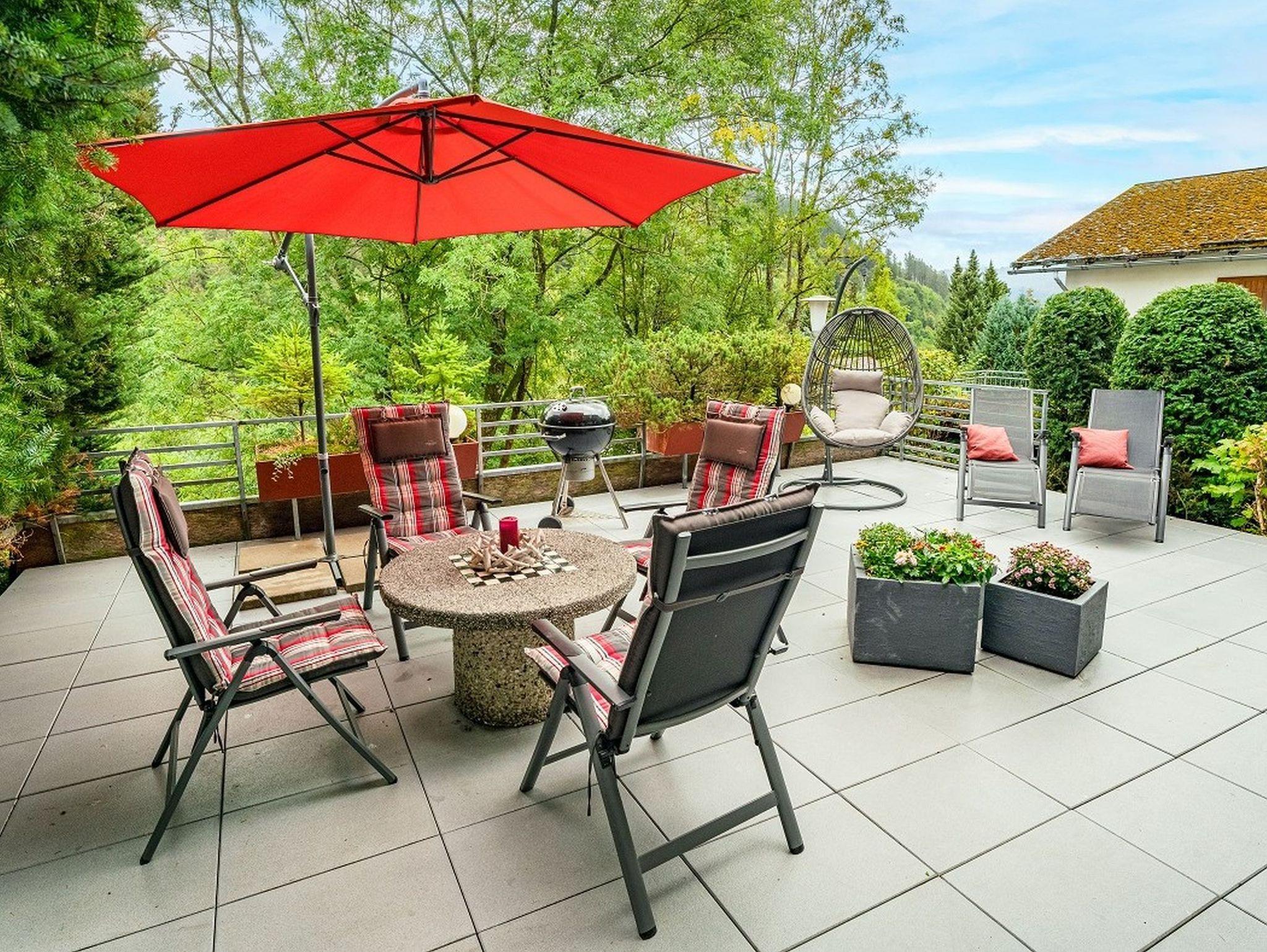 Auf der großen, teilweise überdachten Süd-Terrasse im Grünen befinden sich Gartenmöbel mit Auflagen, Liegen und ein Weber-Holzkohlegrill.
