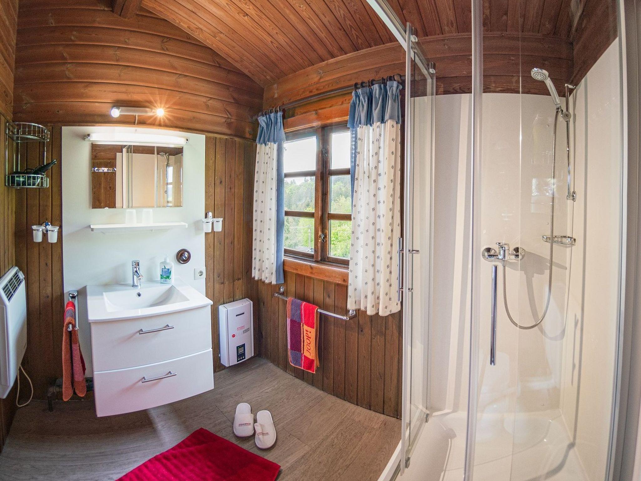 Des Weiteren verfügt das Schwedenhaus über ein Schlafzimmer mit Doppelbett und ein weiteres Schlafzimmer mit einem Etagenbett und einem Einzelbett sowie einem Badezimmer mit Dusche. Ein Föhn liegt natürlich schon für Sie bereit.