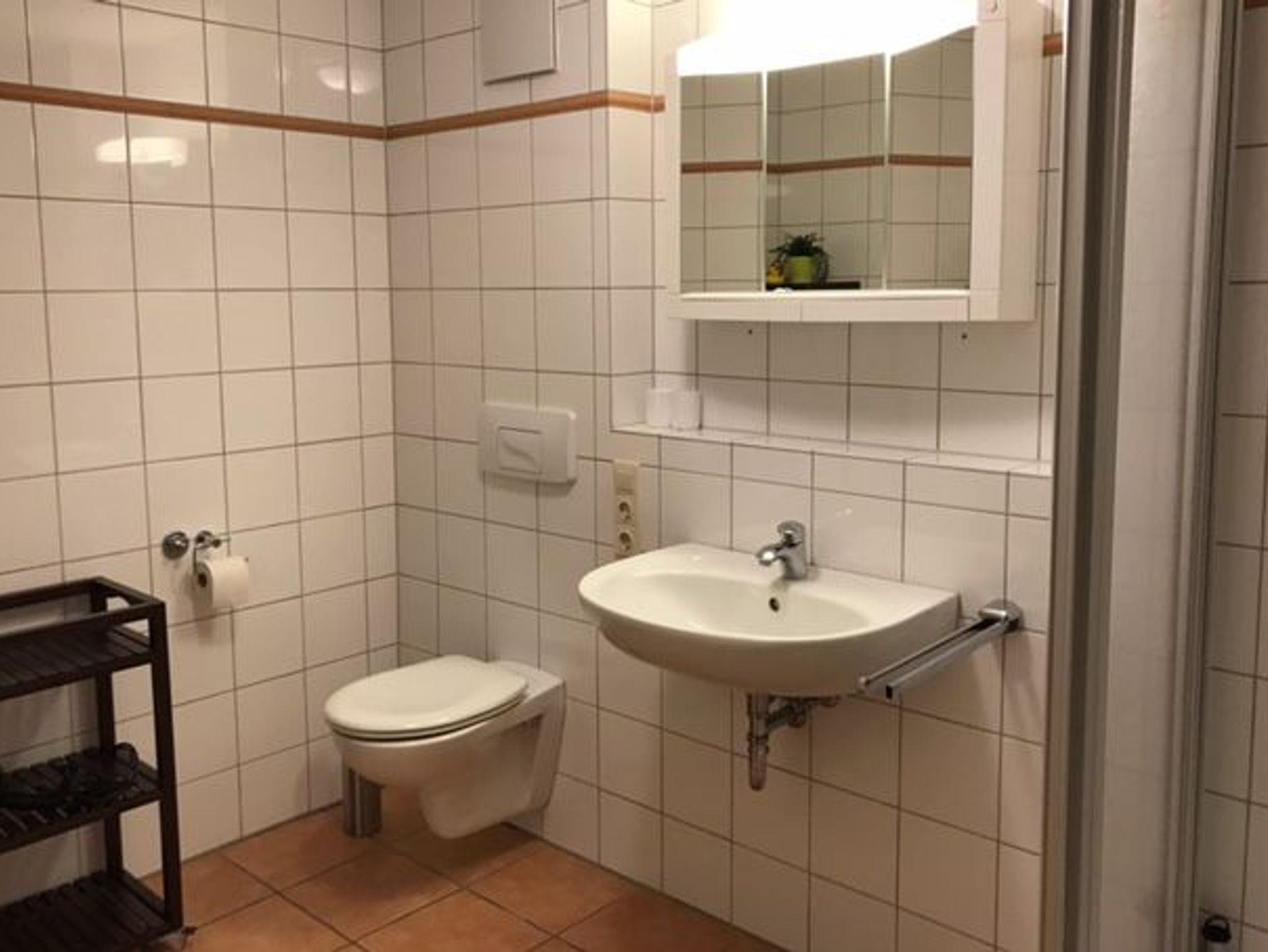 Das Badezimmer ist ausgestattet mit Dusche, WC, ausreichend Ablagemöglichkeiten und einem Föhn.