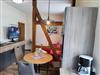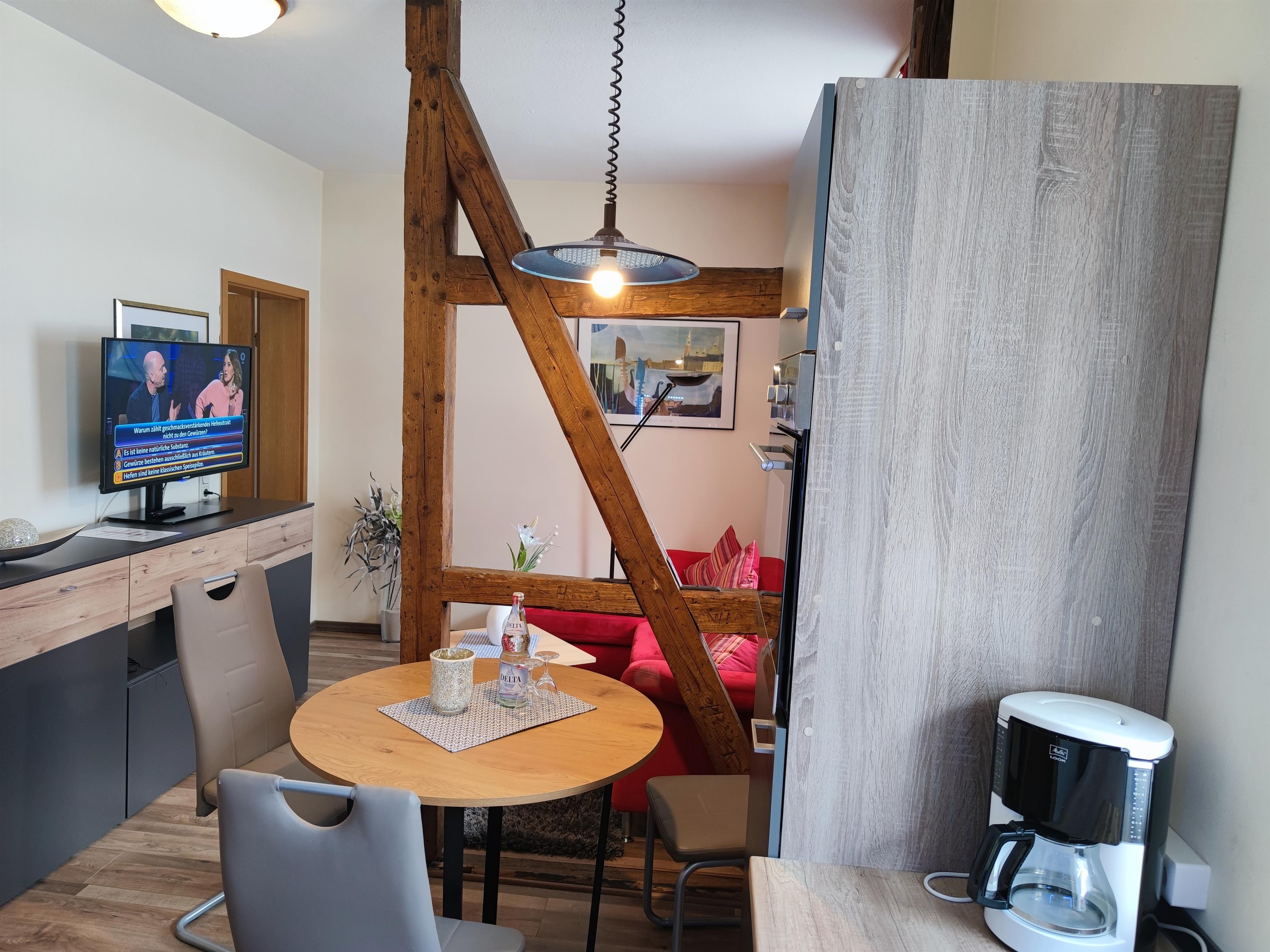 Die im Wohnzimmer befindliche Küche mit Essecke beherbergt ein Ceranfeld, Backofen, Spülmaschine, Kühlschrank mit Kuhl-/ Gefrier Kombi sowie eine Mikrowelle, Kaffeemaschine, Wasserkocher, Toaster und Eierkocher. Weiterhin stehen Ihnen natürlich Kochutensilien wie Töpfe und Pfannen zur Verfügung.