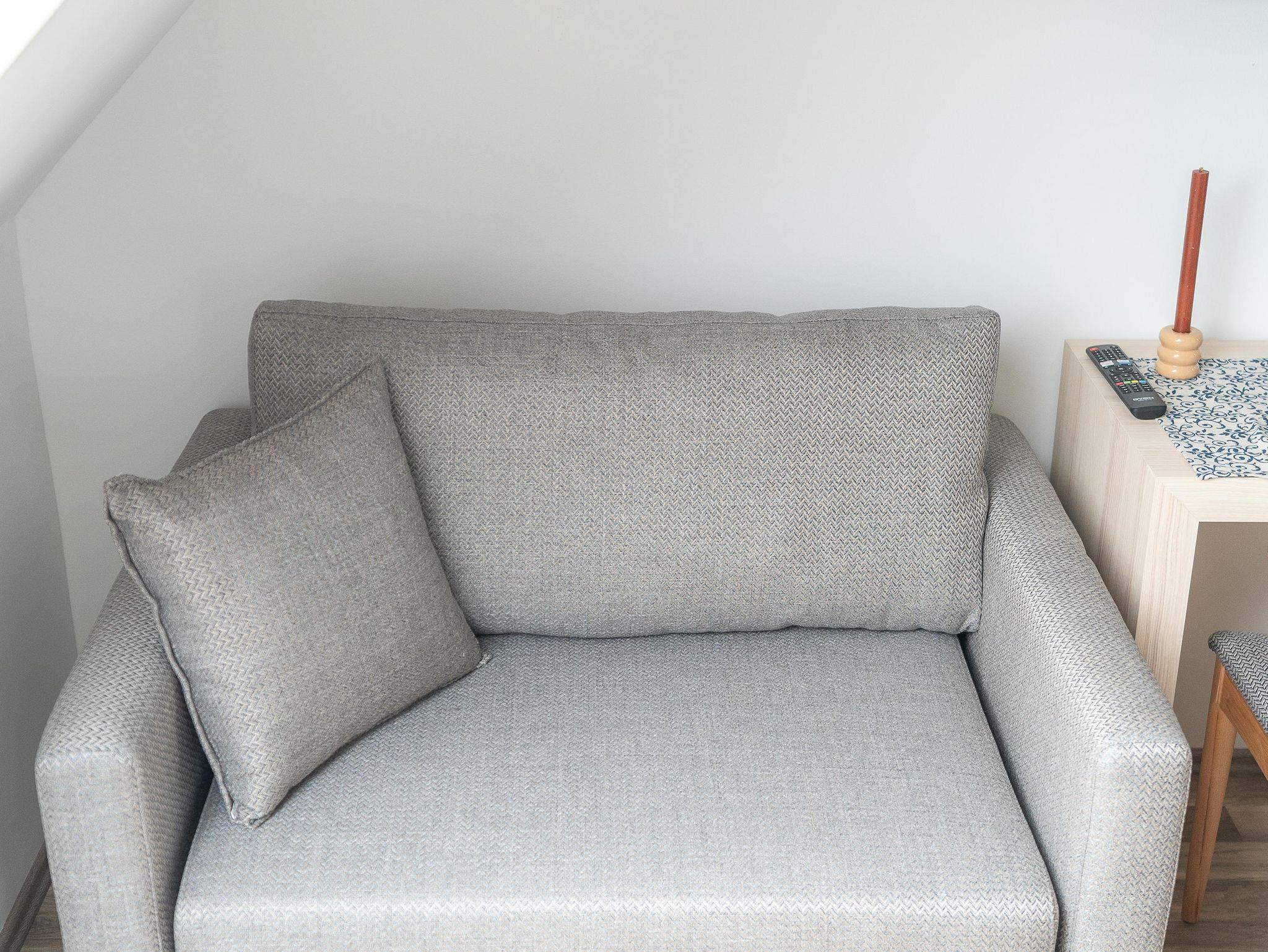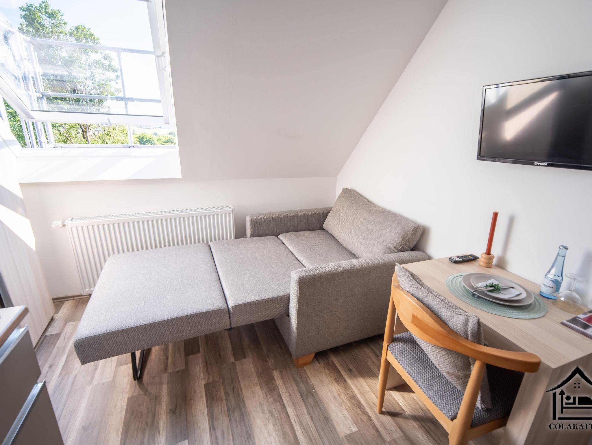 Das moderne Schlafsofa bietet eine praktische Schlafmöglichkeit, die tagsüber platzsparend zusammengeklappt werden kann. Die Raumaufteilung ist offen gestaltet – bitte beachten Sie, dass das Badezimmer keine klassische Tür besitzt (siehe Bilder).