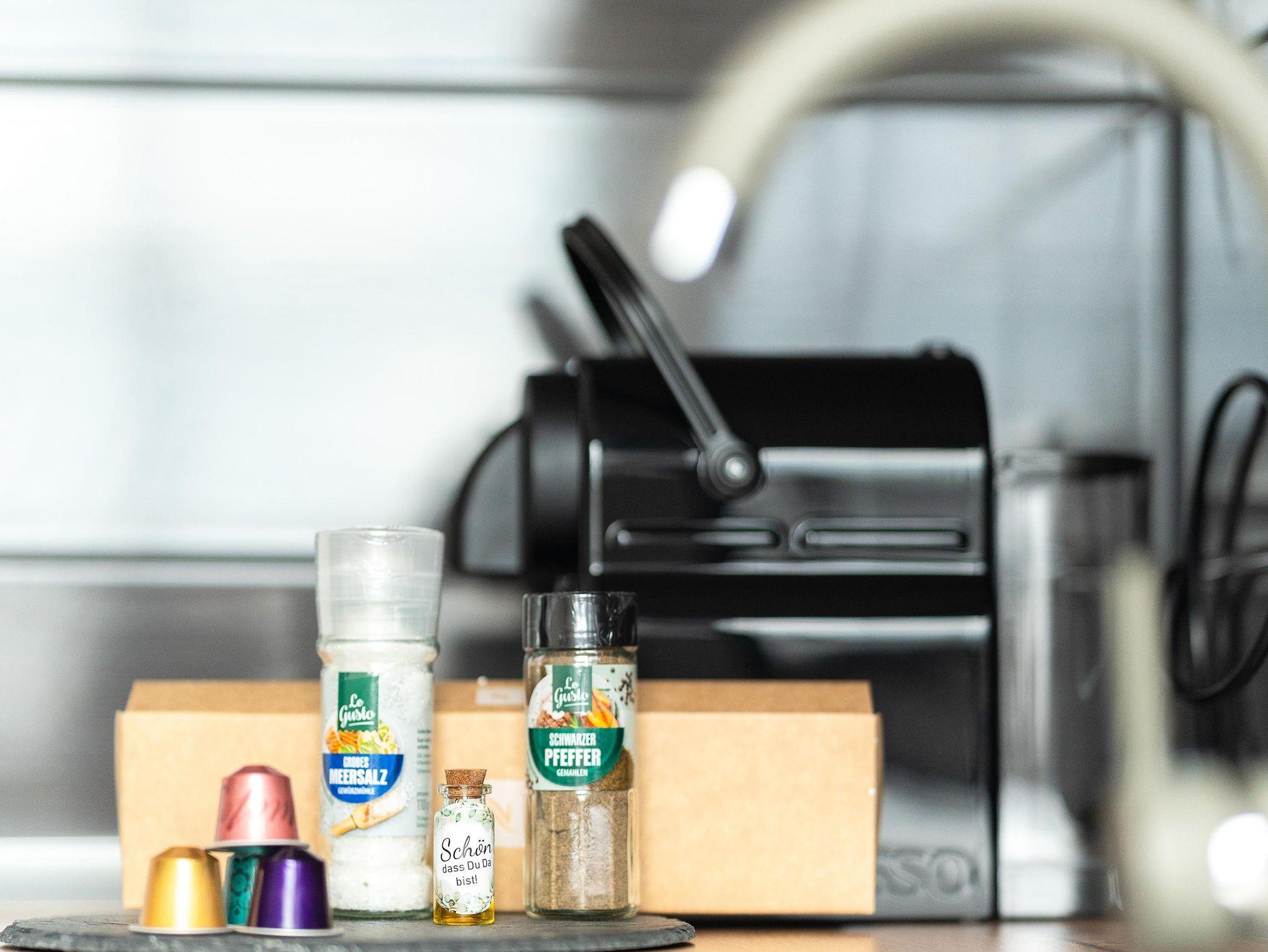 Die voll ausgestattete Küche bietet alles, was Sie zum Kochen brauchen, inklusive Kaffeemaschine, Geschirr und Gläsern.