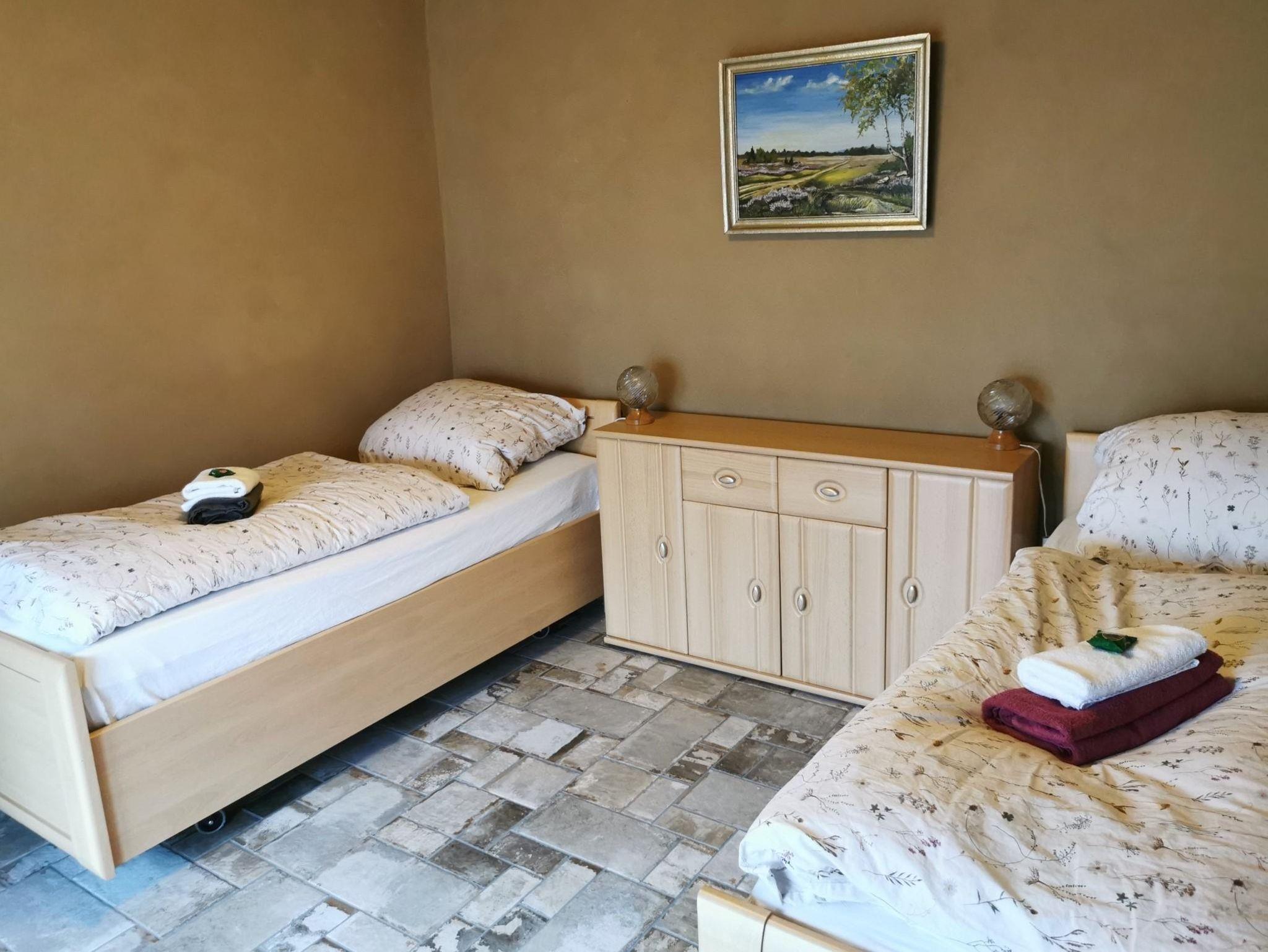 Kirk ist ein 12 qm großes, barrierefreies liebevoll saniertes und eingerichtetes Zwei-Bett-Zimmer im Erdgeschoss. Es verfügt über einen gefliesten Fußboden mit Fußbodenheizung. Kirk ist mit zwei Betten (je 90cm x 200cm), einer Kommode, einem Spiegel und einer Sitzgelegenheit ausgestattet und ist insbesondere für gehbehinderte Menschen geeignet. Ein barrierefreies Bad mit WC und Dusche sowie ein barrierefreier 30 m² großer Aufenthaltsraum mit einem gemütlichen Sofa und Flachbildfernseher mit Magenta TV und WLAN und einer voll ausgestatteten Wohnküche befinden sich nebenan und sind zur gemeinschaftlichen Nutzung der Feriengäste vorgesehen. Ein separater Kühlschrank für mitgebrachte Lebensmittel und Getränke steht für die Gäste von Kirk in der Wohnküche bereit.