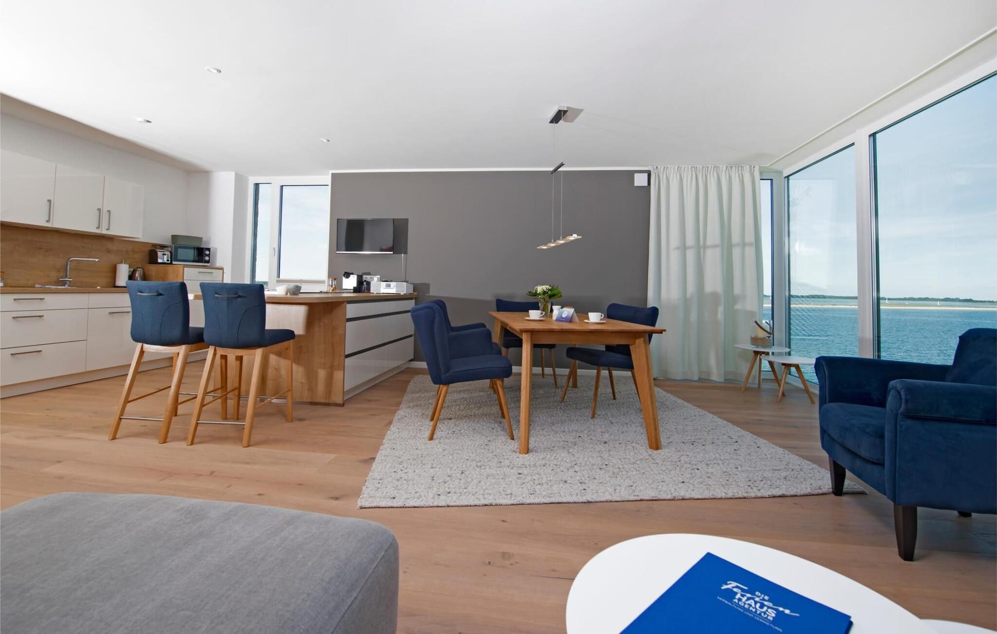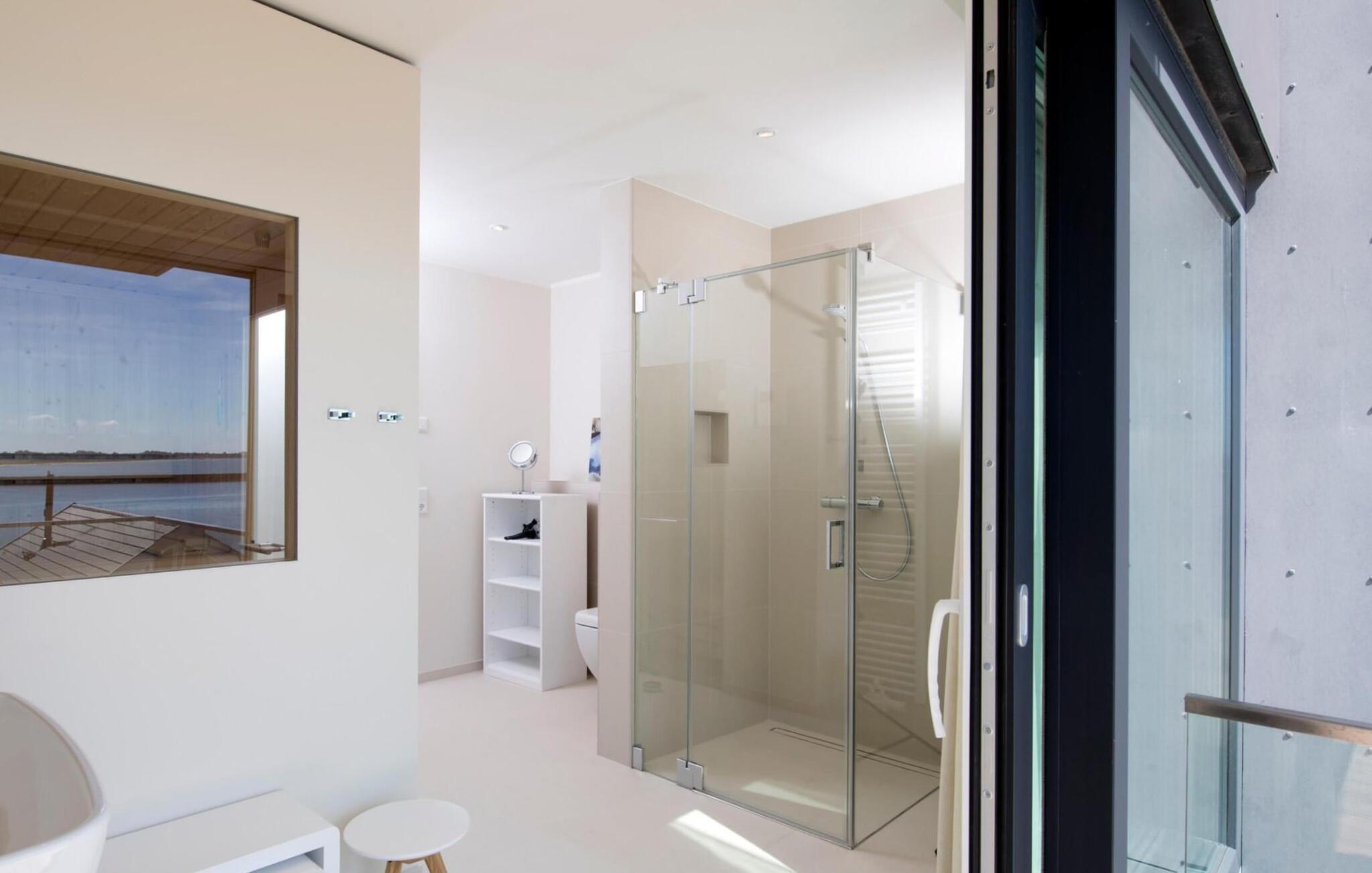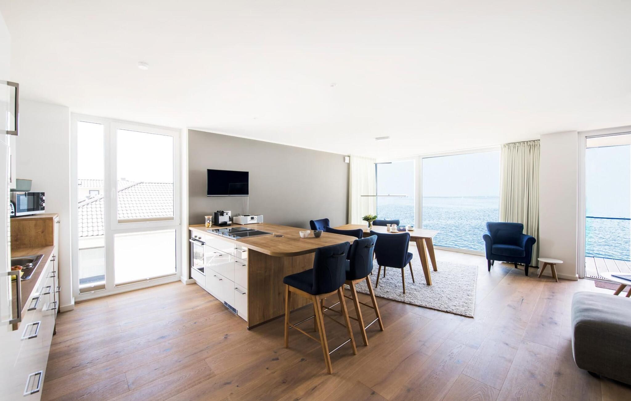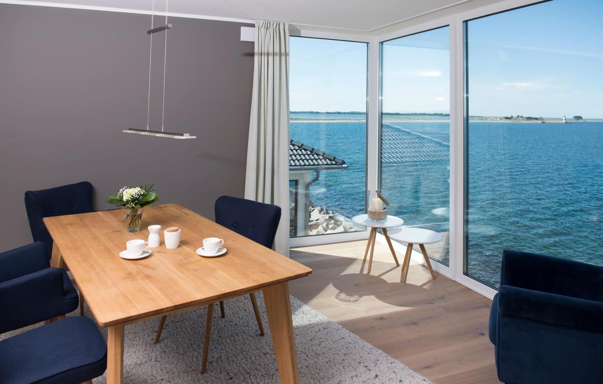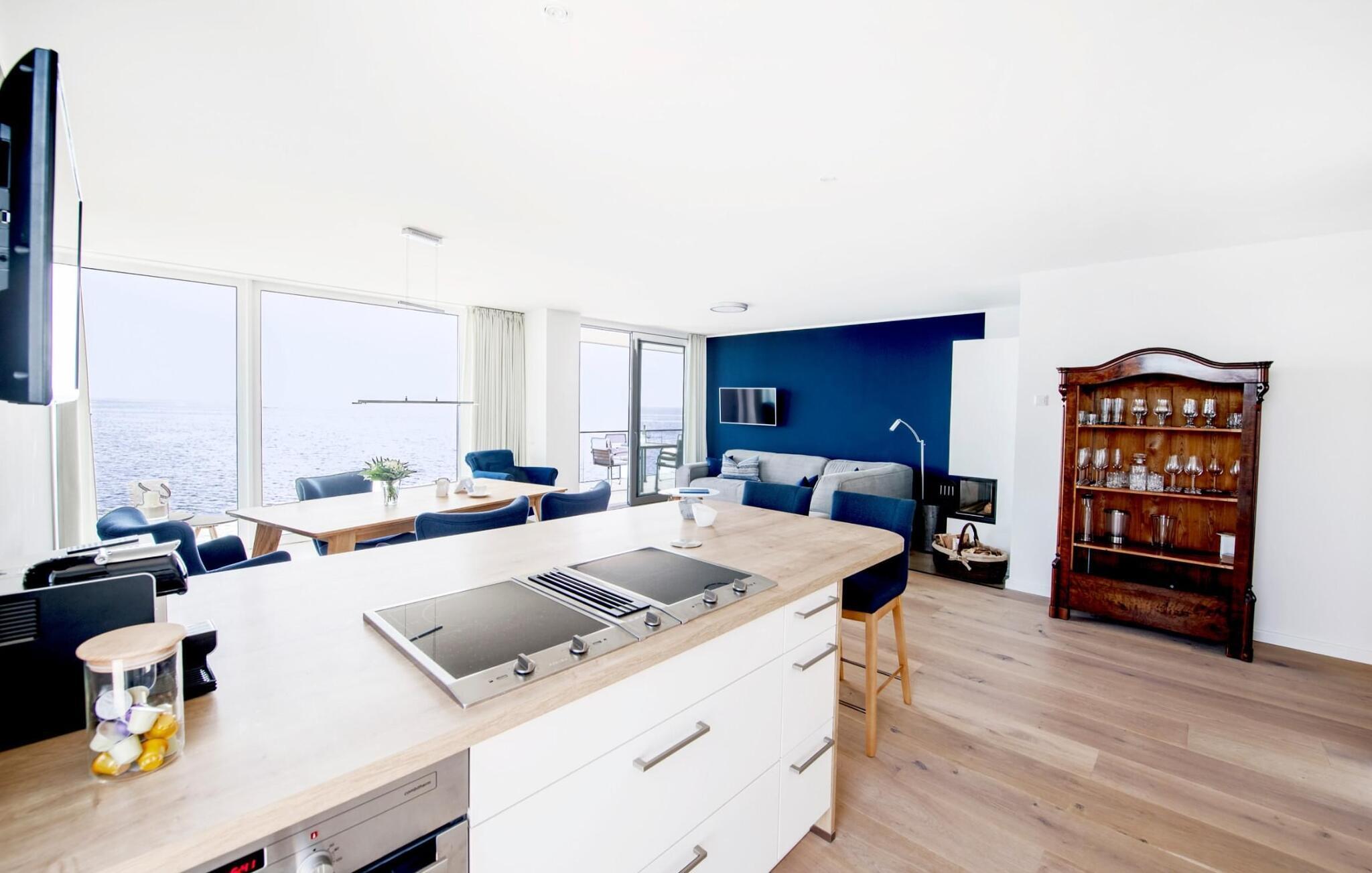 Moderne-maritim ferielejlighed over bølgerne med en spektakulær udsigt over den brede Østersø og slimets munding, og wellness-faktor. Dette skønne feriehus ligger midt i Østersøen, på et smalt næs mellem VIND OG VAND, med Østersøen på den ene side og sejler- og sportsbådshavnen i ferieområdet Olpenitz på den anden side. Slap af over bølgerne eller nyd solen på havnesiden, to altaner får feriehjerterne til at banke hurtigere, mens en finsk sauna med udsigt til vandet sikrer det private wellness-program. Den rummelige ferielejlighed Wind und Wasser i stueetagen ligger på anden sal og kan nemt nås med elevator. Placeret over alt, er der en spektakulær udsigt gennem gulv-til-loft vinduer over Østersøen, mundingen af floden og fyrtårnet samt lystbådehavnen i feriestedet Østersøen. Hvert værelse har adgang til altan. Trægulvbrædder og gulvvarme tilbyder komplet feriekomfort. Opholds- og spisestuen i åbent plan med det komfortable siddeområde og det store spisebord inviterer jer til at blive hængende foran den knitrende pejs. Den panoramiske havnefront byder på ferieunderholdning i hver sæson, passerende sejlskibe, måger, spray og bølger, fyrtårn, strand- og havnebiograf. Det store soveværelse vender ud mod Østersøen og byder udover en unik vandudsigt også direkte ud til altanen. Træd udenfor døren i jeres morgenkåbe og start dagen med en smag af Østersøen - drømme går i opfyldelse her. Det andet soveværelse vender ud mod lystbådehavnen og har også sin egen altanadgang. Begge soveværelser har myggenet døre. Det fuldt udstyrede badeværelse med bruser i gulvniveau sikrer maritime wellness-øjeblikke på ethvert tidspunkt af året. I kan slappe dybt af i den finske sauna, og den tilstødende sydvendte balkon byder på sol hele dagen lang. Et gæstetoilet giver ekstra komfort. Wind und Wasser ferielejligheden er en lejlighed på anden sal i et hus med flere enheder. Der er en parkeringsplads lige foran huset. Vores favoritsted: Lad Østersøbrisen blæse om næsen på balkonen og se, hvordan sejlbåde passerer Schimmelünde fyrtårn. Bemærk venligst: OstseeResort Olpenitz er meget populært, og der bygges fortsat i parken. Ikke desto mindre kan I se frem til en 5-stjernet standard og et førsteklasses ophold. Byggeaktiviteterne kommer ikke til at forstyrre jer på ferien, og derfor gives der ikke yderligere afslag i prisen.