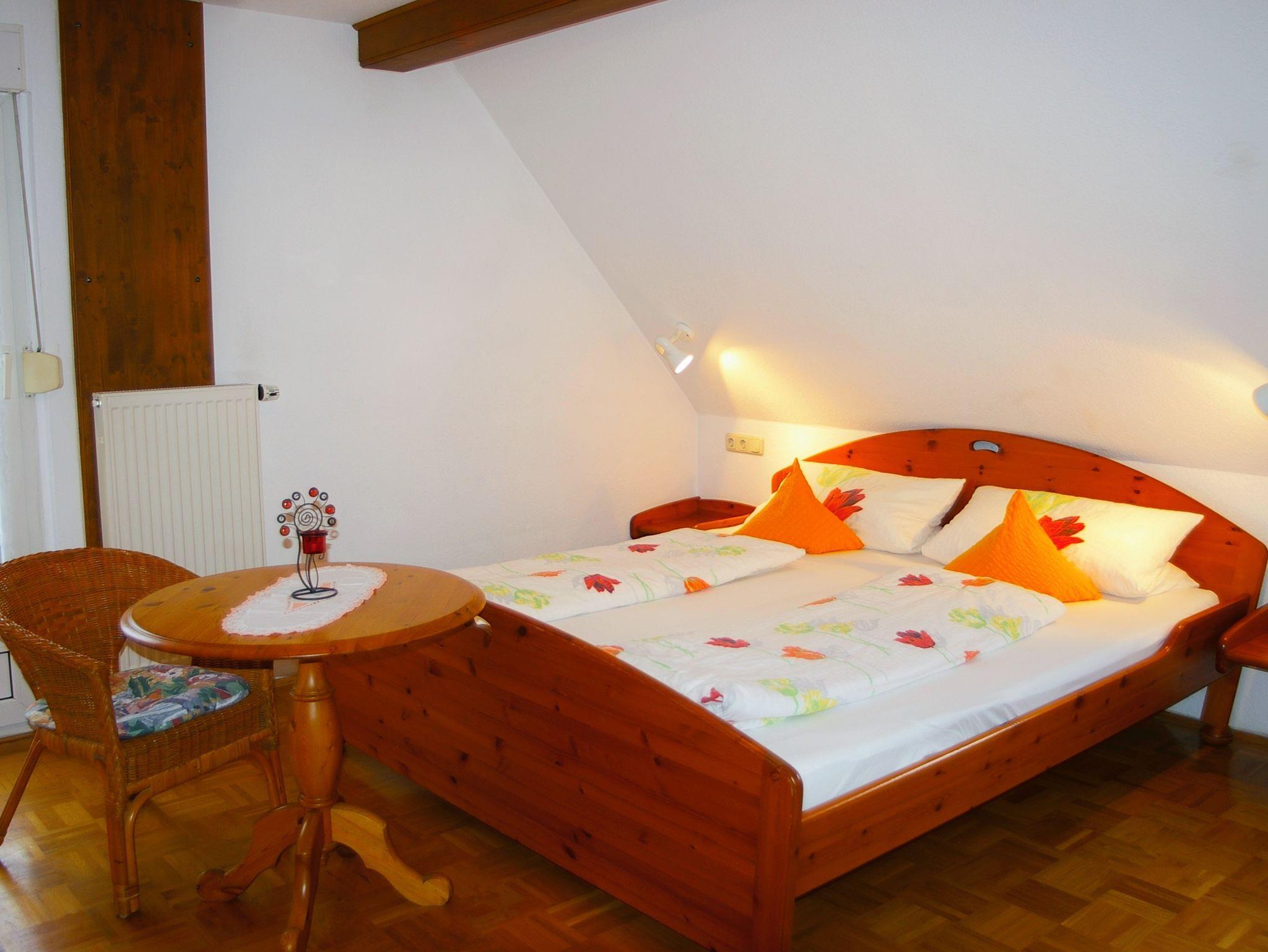 Das gemütliche Doppelzimmer mit Doppelbett und Südbalkon ist mit Massivholzmöbeln und Parkettboden eingerichtet. Das Badezimmer ist mit Dusche, WC, Föhn und Handtüchern. Außerdem gibt es einen Fernseher und kostenloses Wlan im Zimmer.